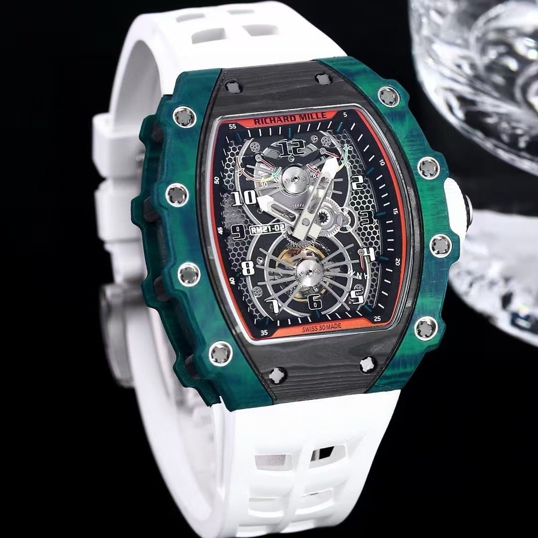 The ZF Factory RM21-02 Tourbillon Aerodyne captures the essence of aviation-inspired engineering through bold color and complex material science. Its distinctive green quartz-TPT bezel fused with black carbon layers creates a visual rhythm between modernity and motion. Every pattern on the surface is unique — no two cases share the same carbon weave, making each piece visually individual.