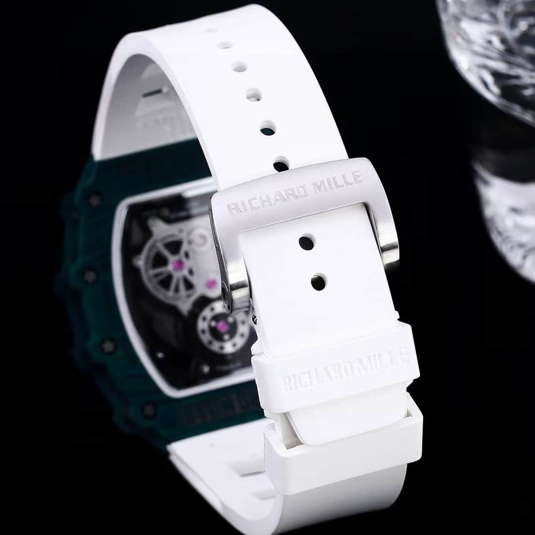 ZF’s 1:1 construction recreates the real RM’s three-dimensional engineering with near-perfect geometry — from the bridge finishing to the torque-limit crown. The contrast of white FKM rubber strap against the dark carbon case enhances its futuristic sport aesthetic, creating a timepiece that feels as light as it looks powerful.