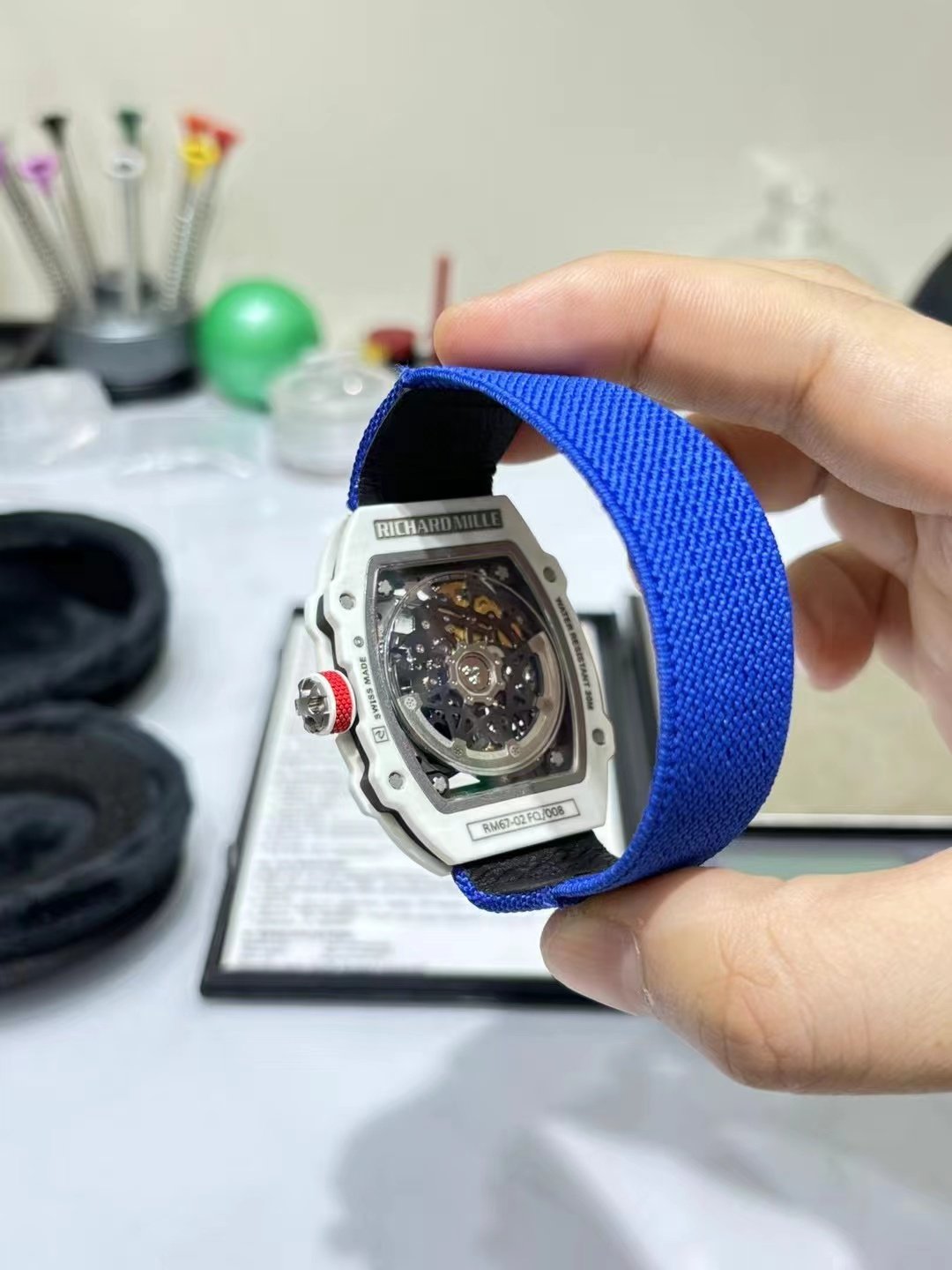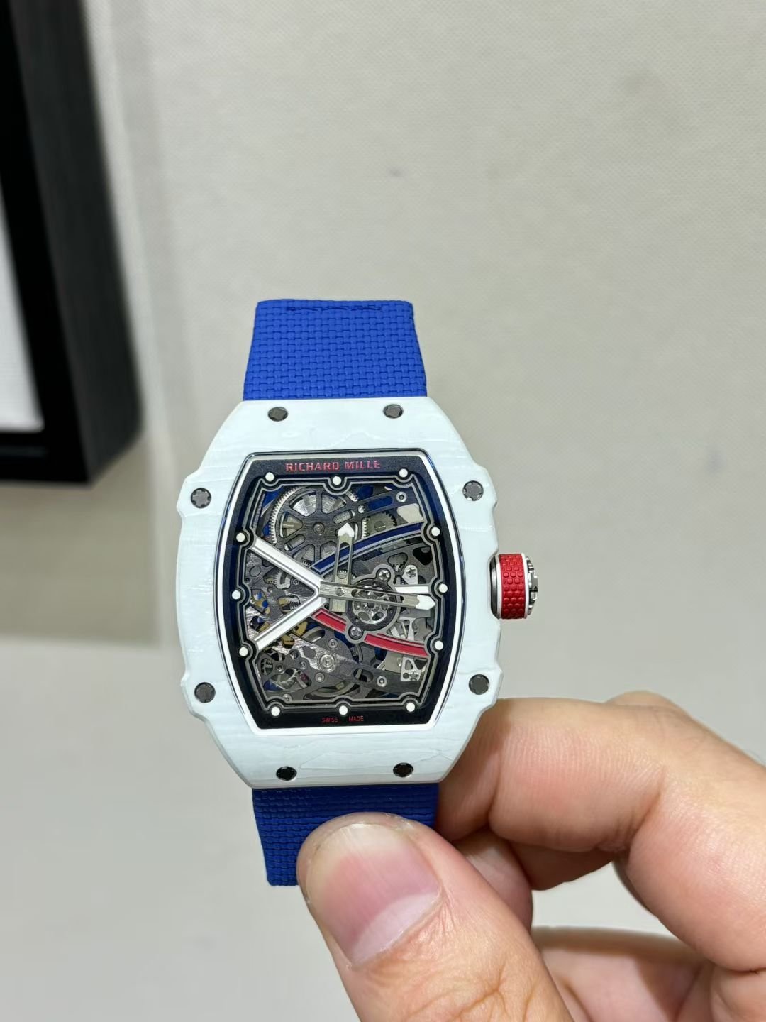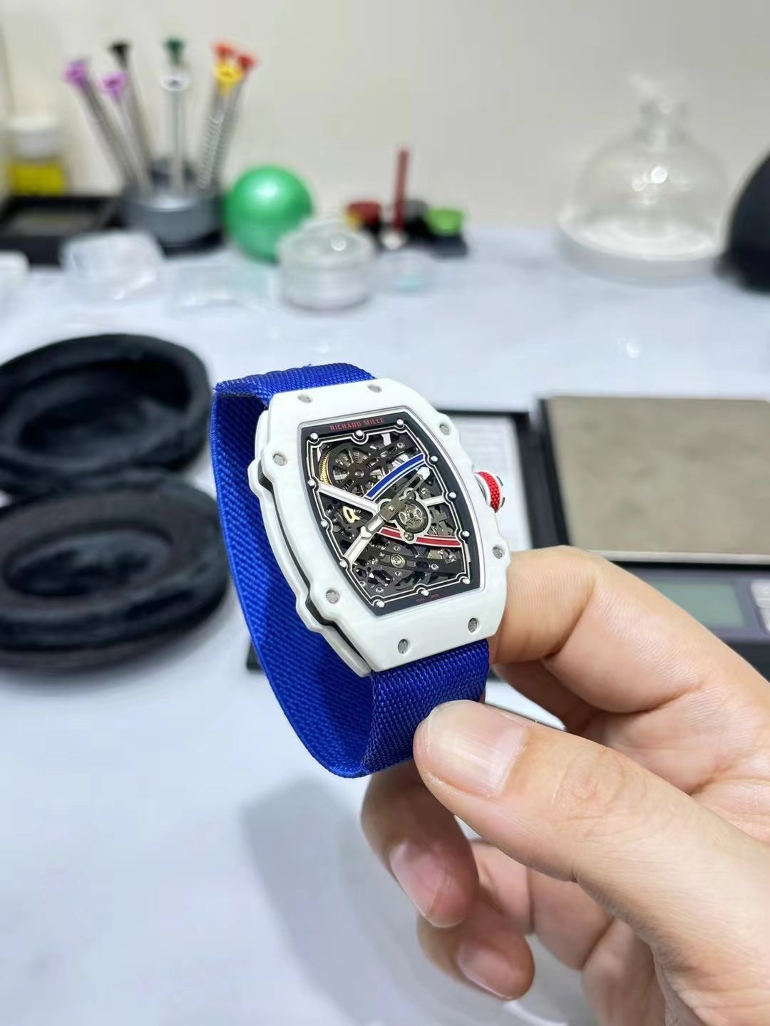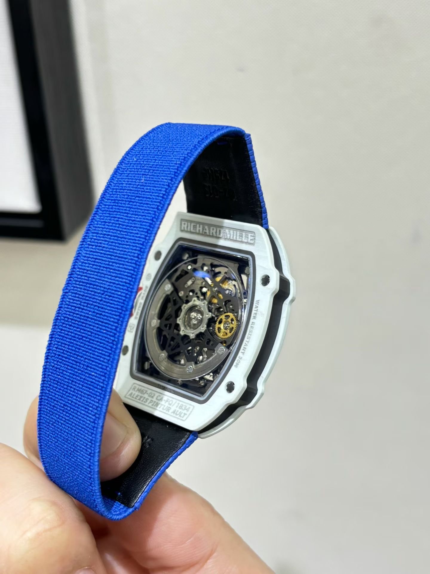 This is a custom-made Richard Mille RM67-02, a French NTPT white carbon fiber watch. It features an integrated ultra-thin movement from Shenzhen Woche, original CNC-machined data, an imported NTPT carbon fiber case, and a custom blue elastic strap.