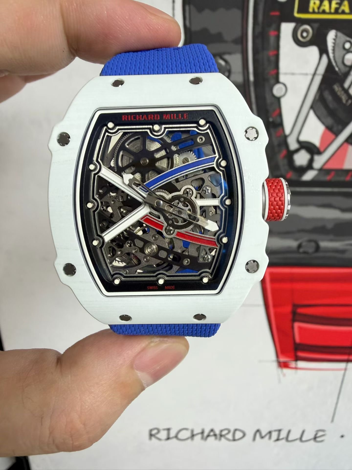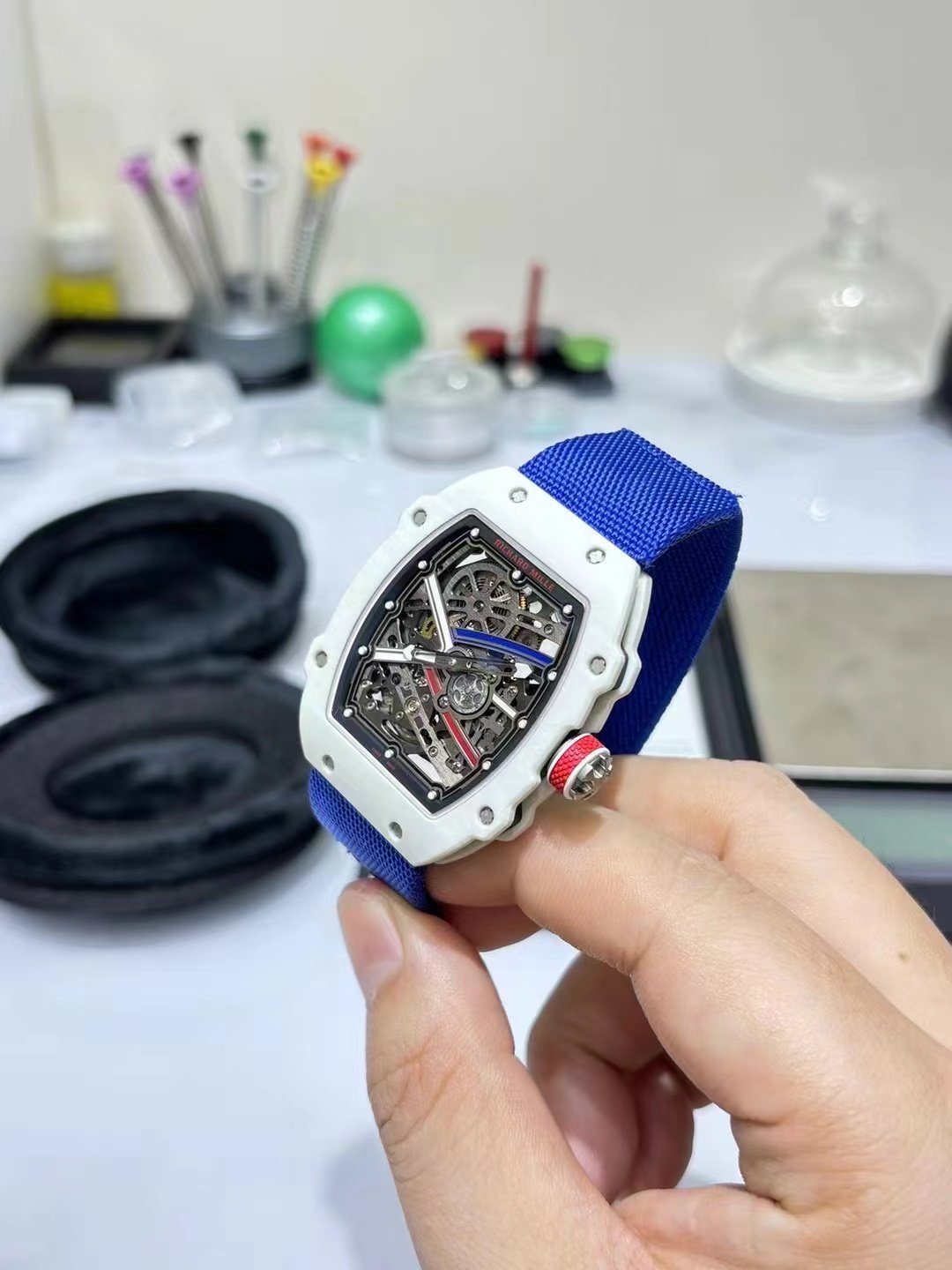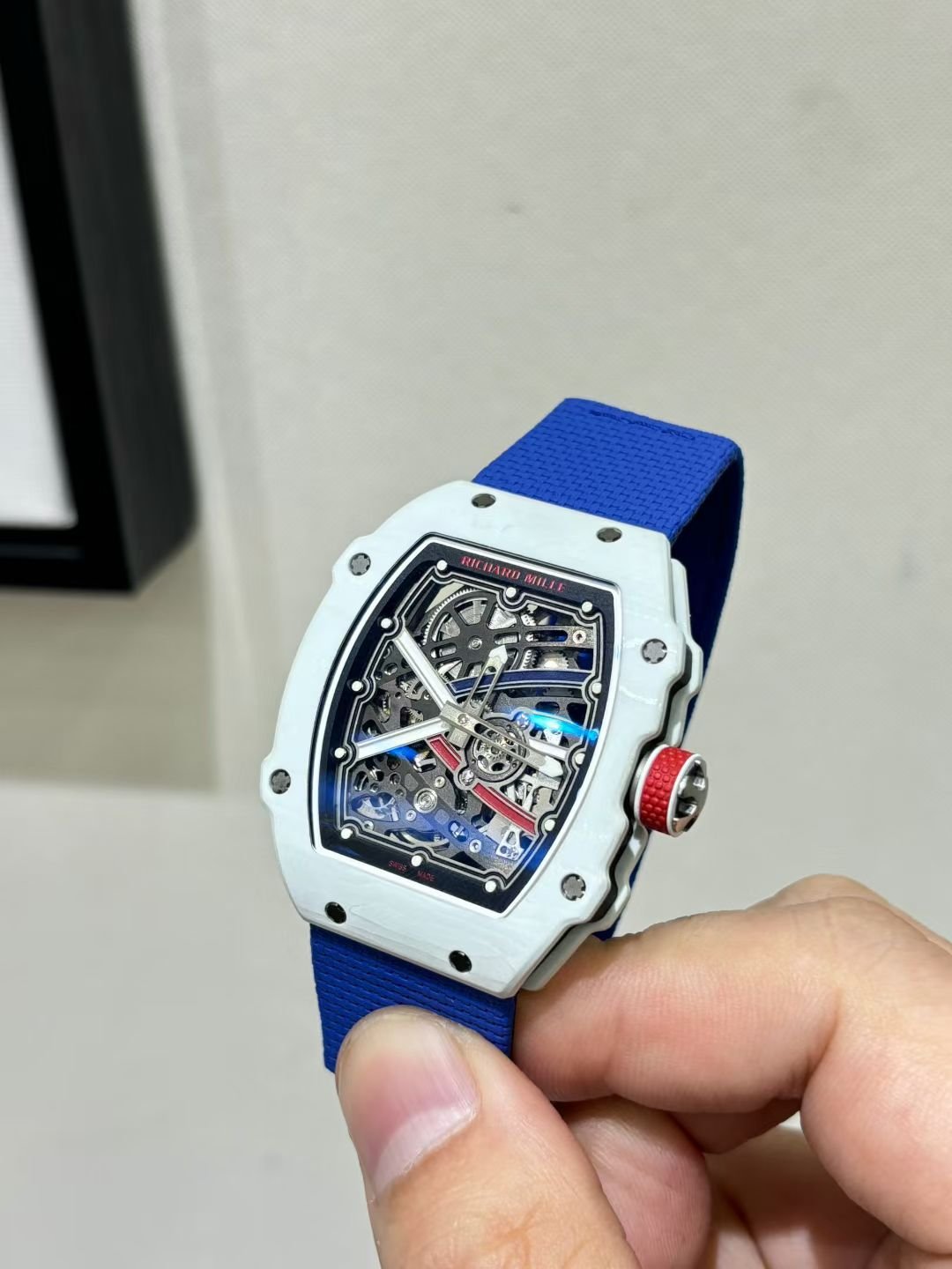 This is a custom-made Richard Mille RM67-02, a French NTPT white carbon fiber watch. It features an integrated ultra-thin movement from Shenzhen Woche, original CNC-machined data, an imported NTPT carbon fiber case, and a custom blue elastic strap.