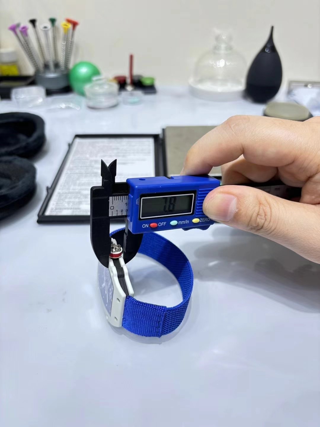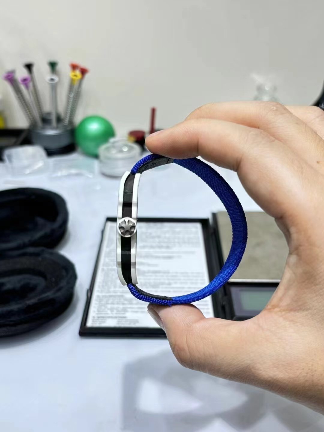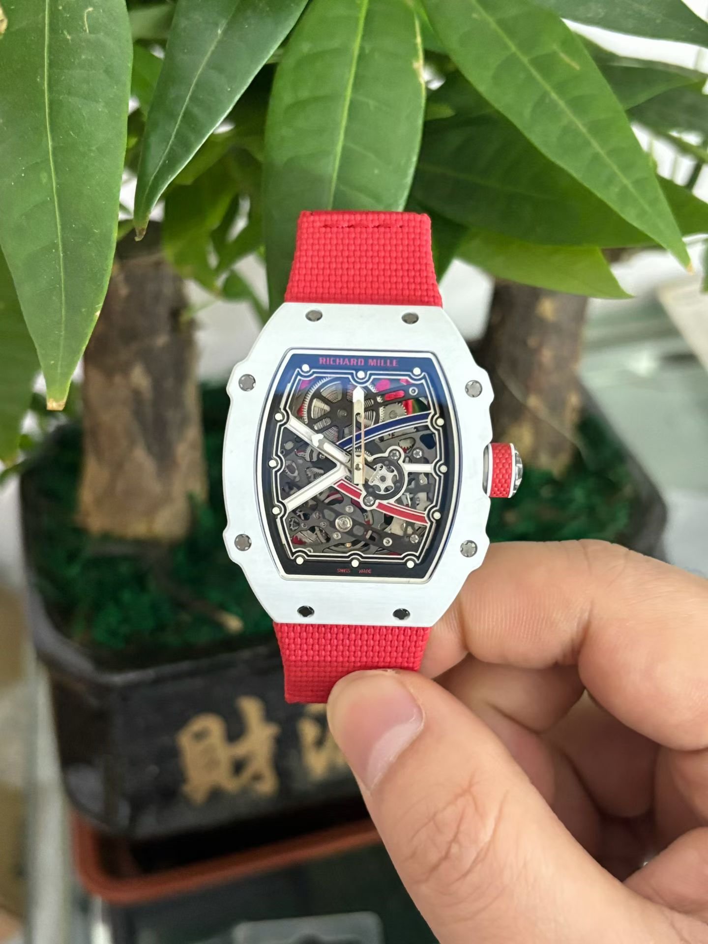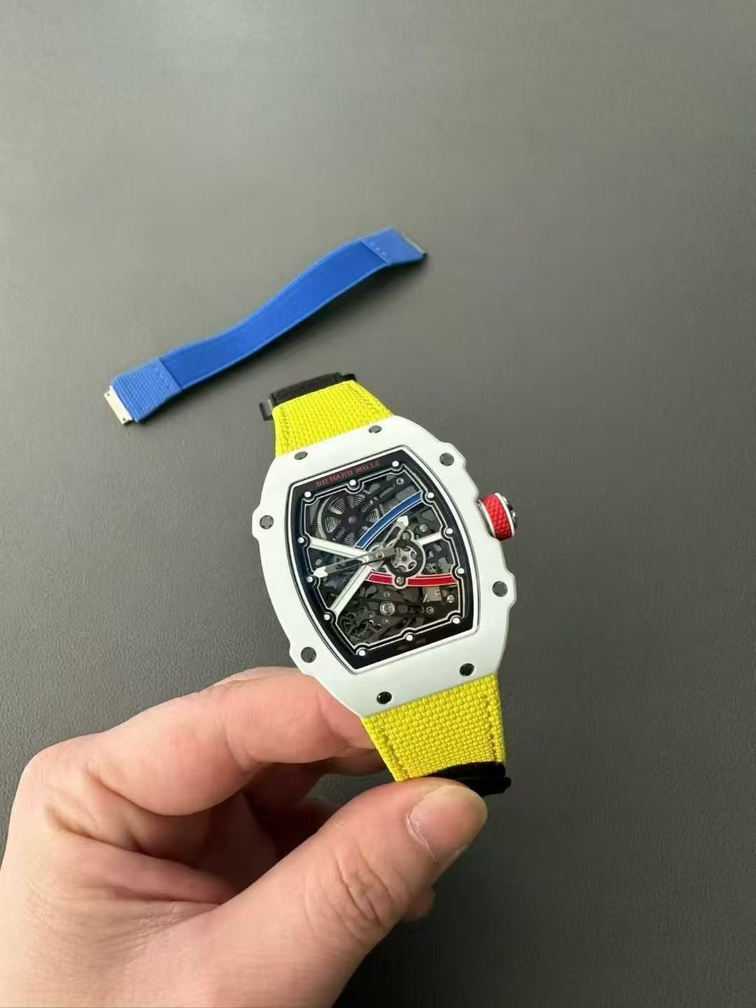 This is a custom-made Richard Mille RM67-02, a French NTPT white carbon fiber watch. It features an integrated ultra-thin movement from Shenzhen Woche, original CNC-machined data, an imported NTPT carbon fiber case, and a custom blue elastic strap.