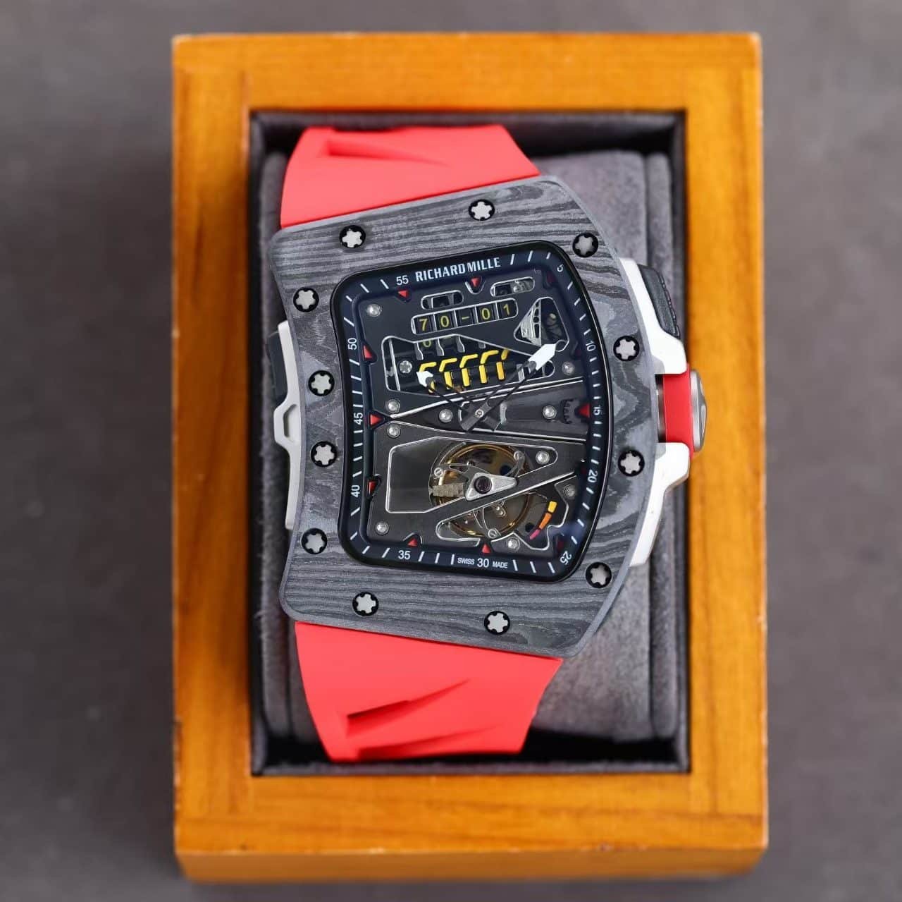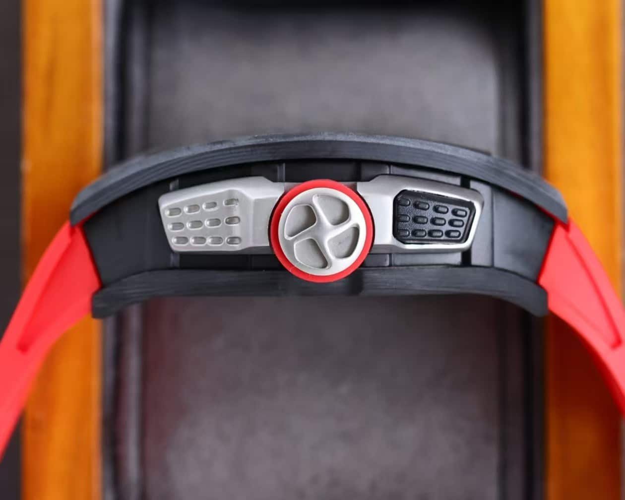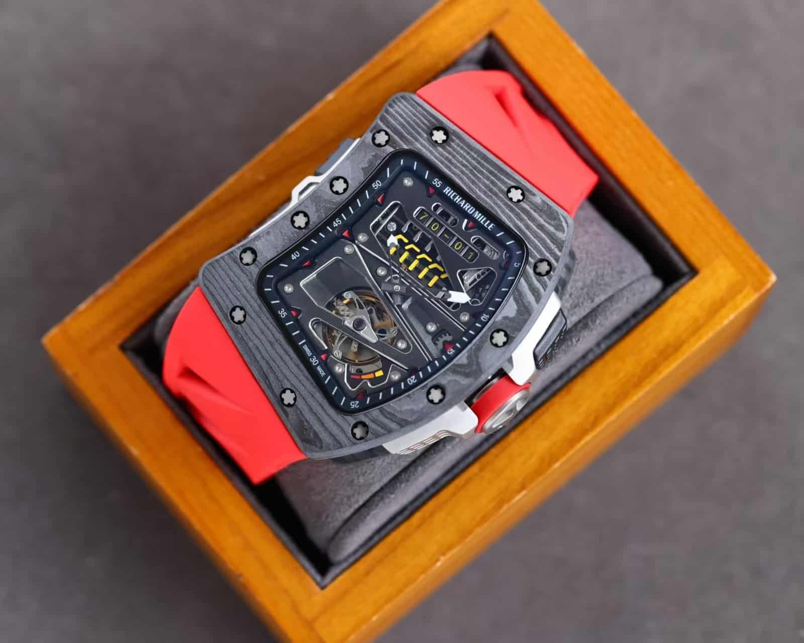 The red rubber strap injects color and vitality — a nod to RM’s sporting DNA — while the matte carbon case conveys aerospace precision.