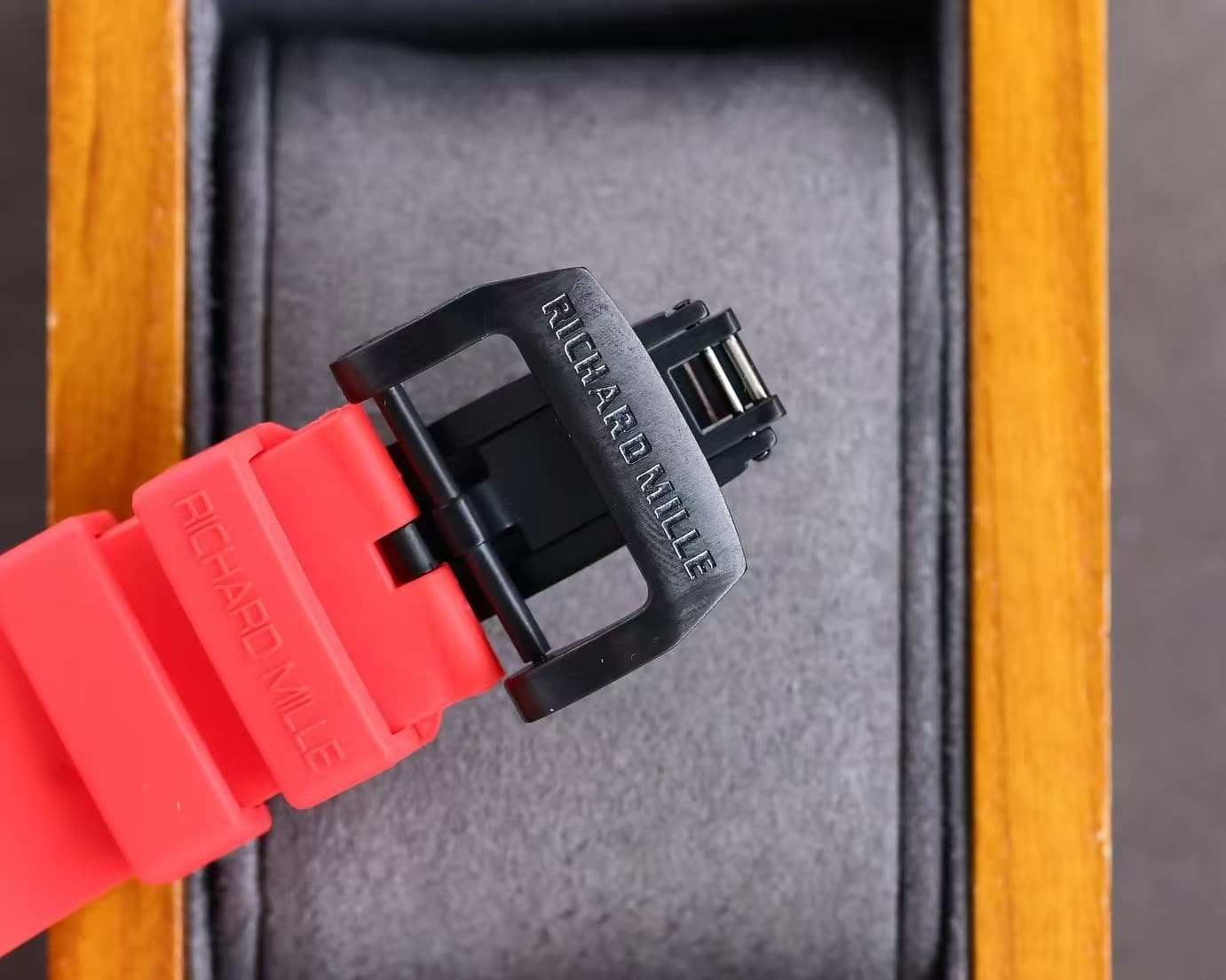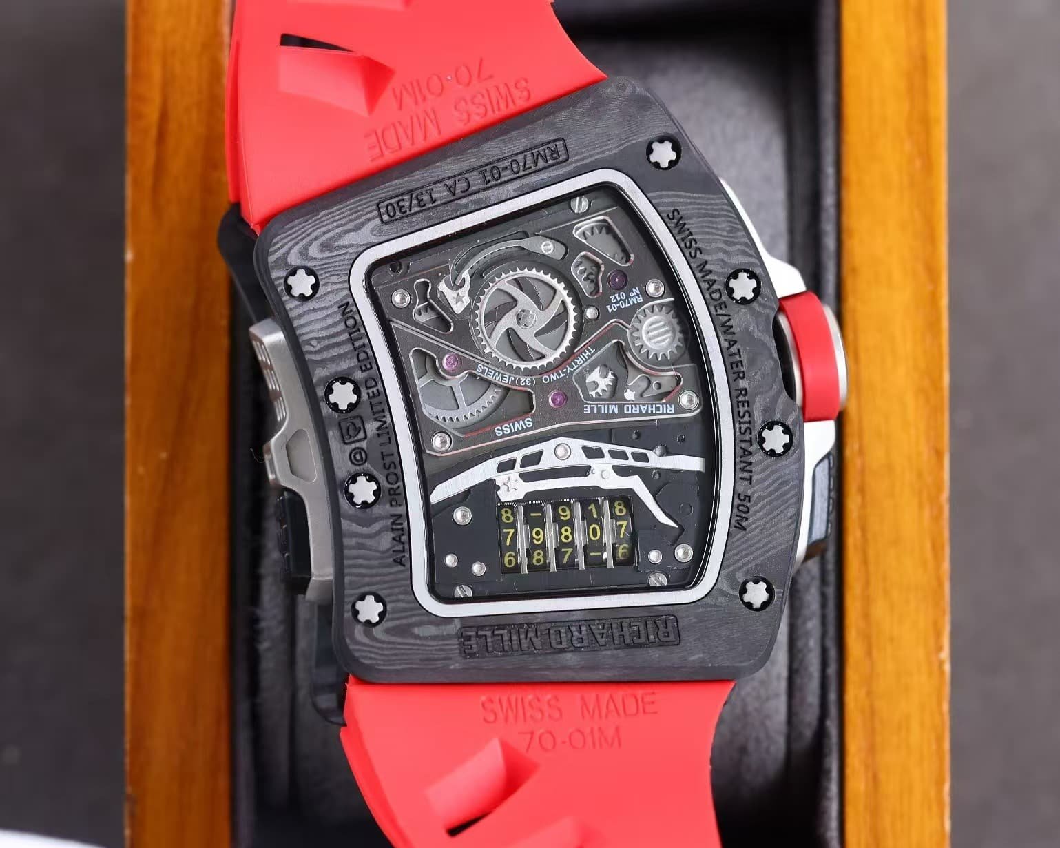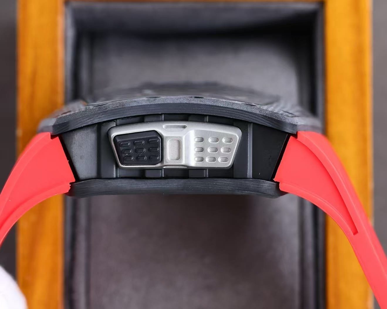 The red rubber strap injects color and vitality — a nod to RM’s sporting DNA — while the matte carbon case conveys aerospace precision.