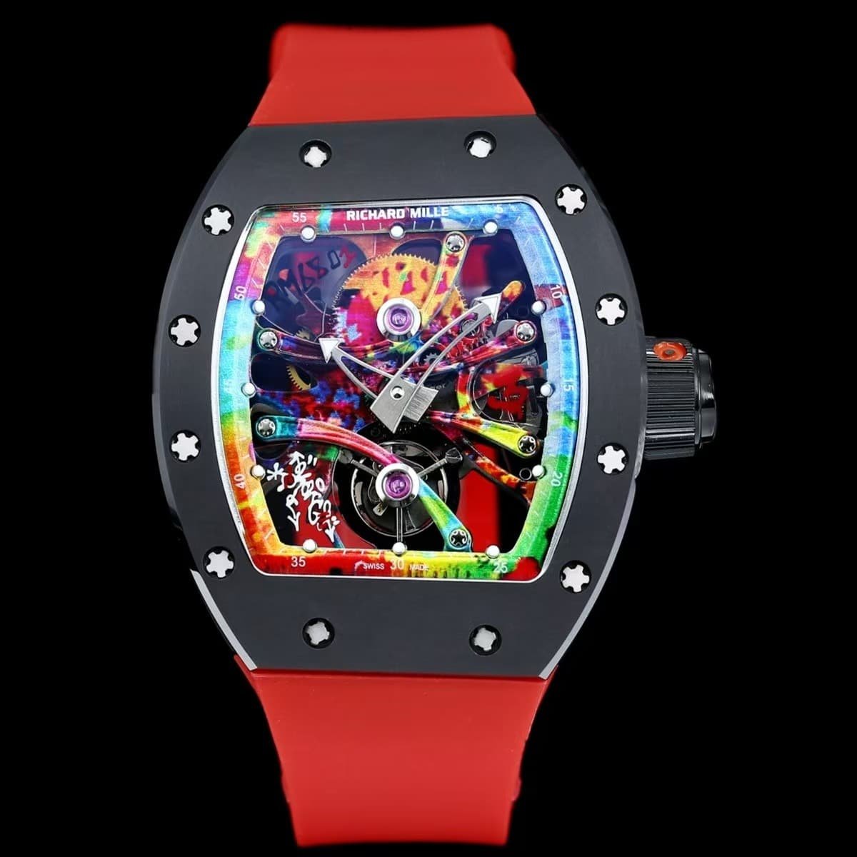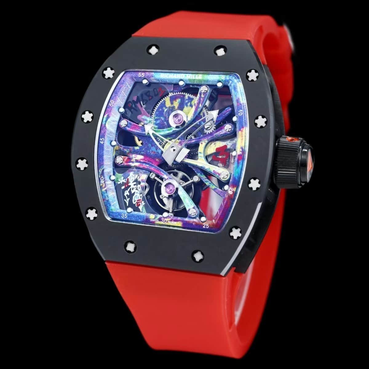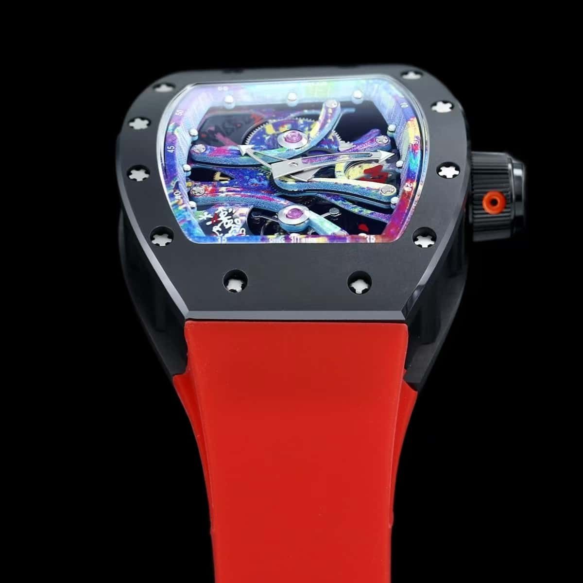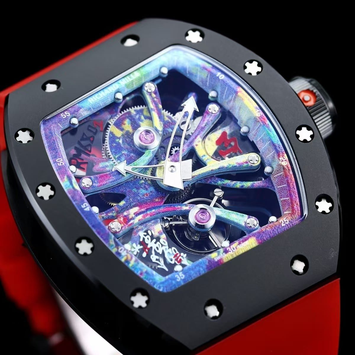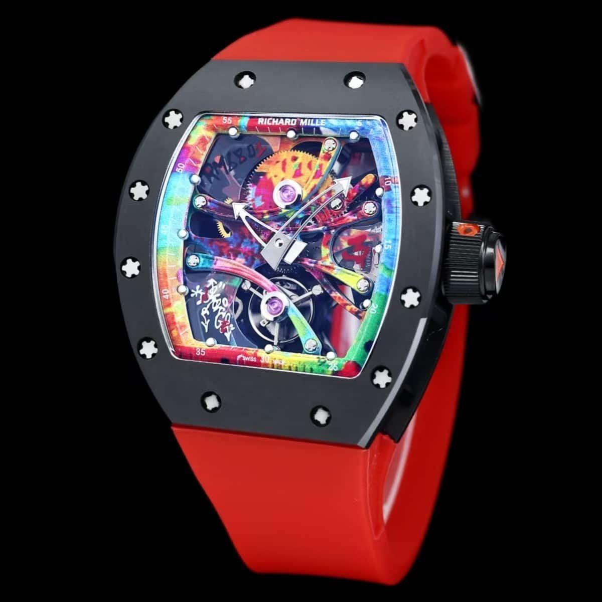 APS Factory brings this spirit to life in its 1:1 Super Clone edition, recreating the gradient graffiti textures, sapphire-front skeleton display, and tourbillon layout with near-perfect visual symmetry. The rainbow inner bezel and vibrant red strap amplify the watch’s energy — a bold statement for collectors who appreciate art as much as engineering.