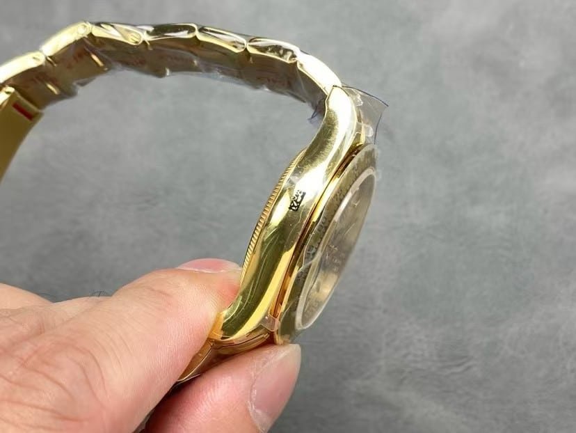 Each dial undergoes a UV radial brushing process that produces an organic sun-ray reflection identical to Rolex’s champagne finish. The indexes, hands, and crown logo are all 18 K-plated with laser-engraved outlines for crisp precision.