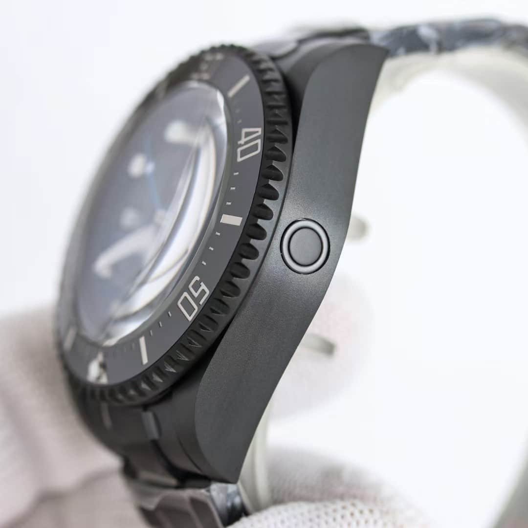 Every detail of this custom Deepsea reflects a deep respect for mechanical integrity while pushing boundaries of design. The case, bracelet, and bezel are treated with DLC (Diamond-Like Carbon) coating, achieving the appearance of forged carbon — stealthy, matte, and irresistibly tactile.