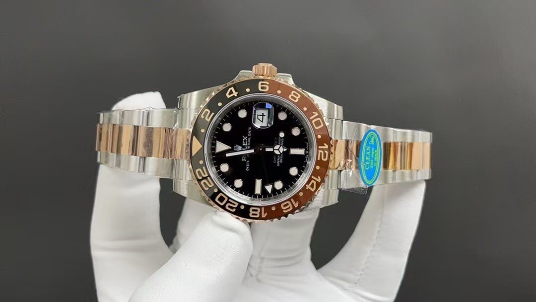 The Rolex GMT-Master II Root Beer is a symbol of elegance and modern craftsmanship. Combining Everose gold tone with stainless steel and the signature black-brown ceramic bezel, it merges vintage GMT heritage with contemporary luxury. The Clean Factory version recreates every visual and mechanical element of the genuine model with 1:1 accuracy, powered by the reliable 3285 clone movement.