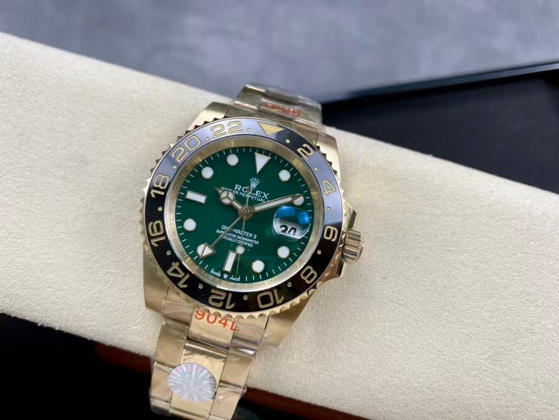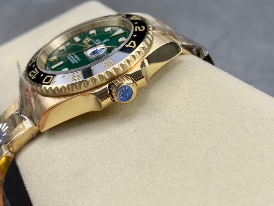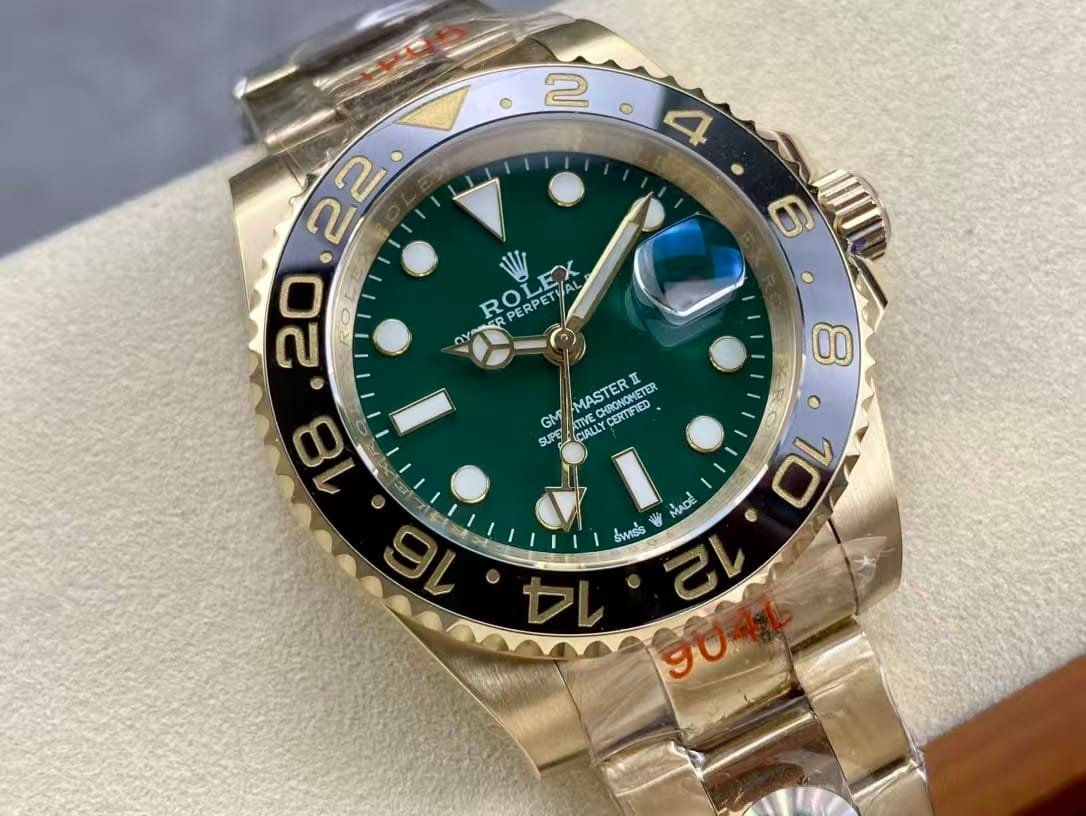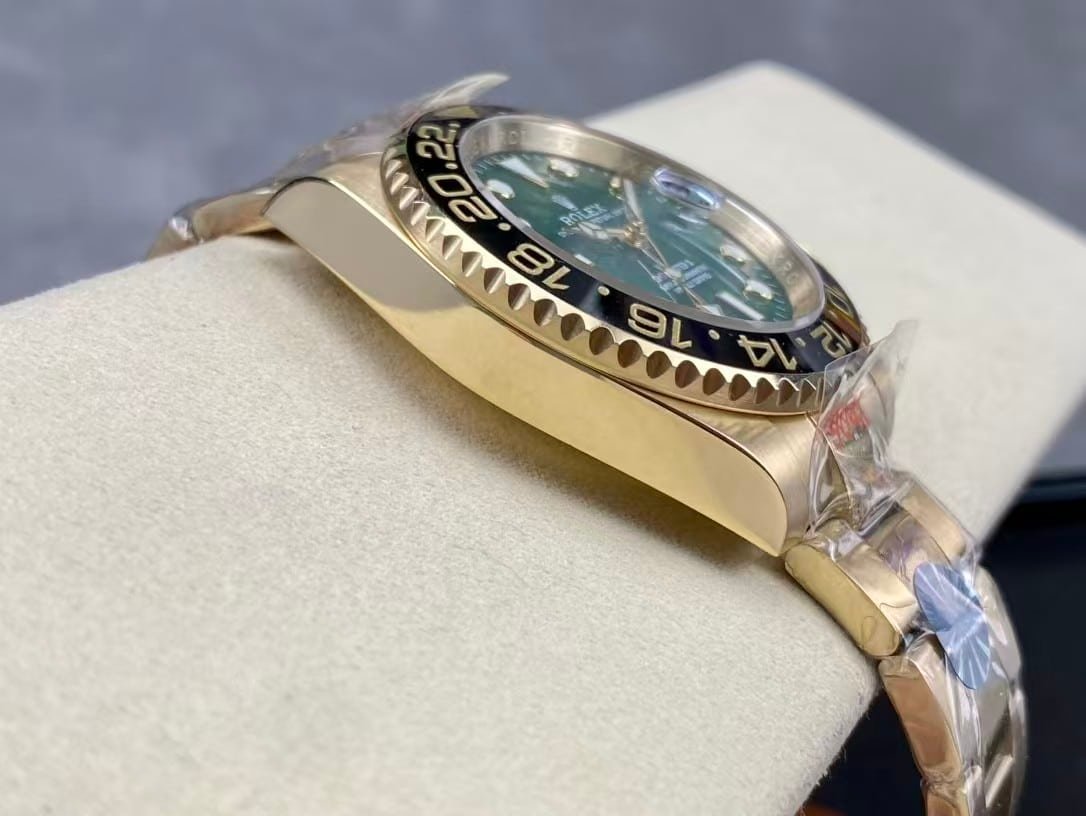 The Rolex GMT-Master II 126718GRNR marks a bold evolution of the GMT line, featuring a luxurious 18K gold tone case paired with a striking sunburst green dial and black-gray ceramic bezel. Clean Factory’s 1:1 super clone edition flawlessly reproduces the aesthetic and feel of the genuine model, offering collectors the prestige of the real piece with the legendary accuracy of China’s top super clone engineering.