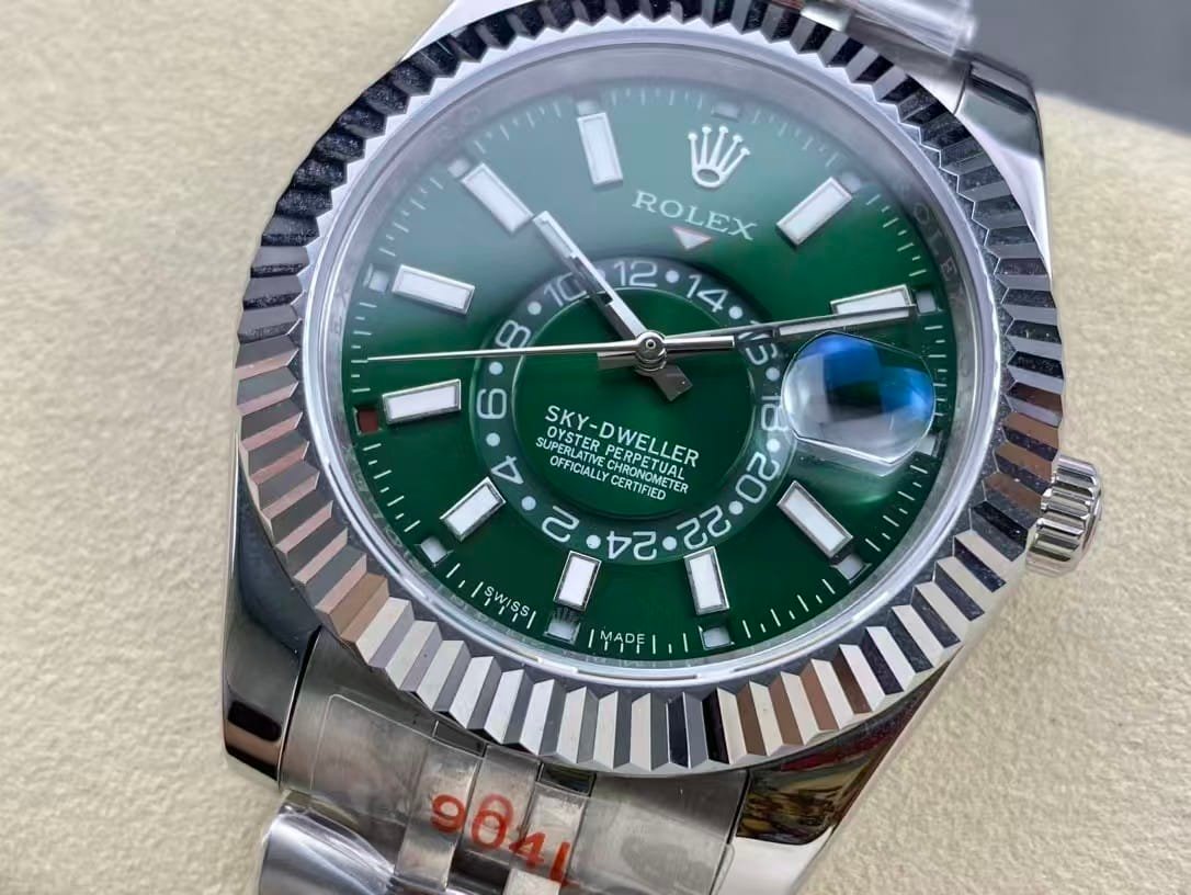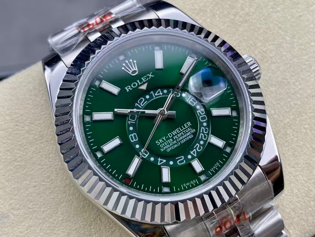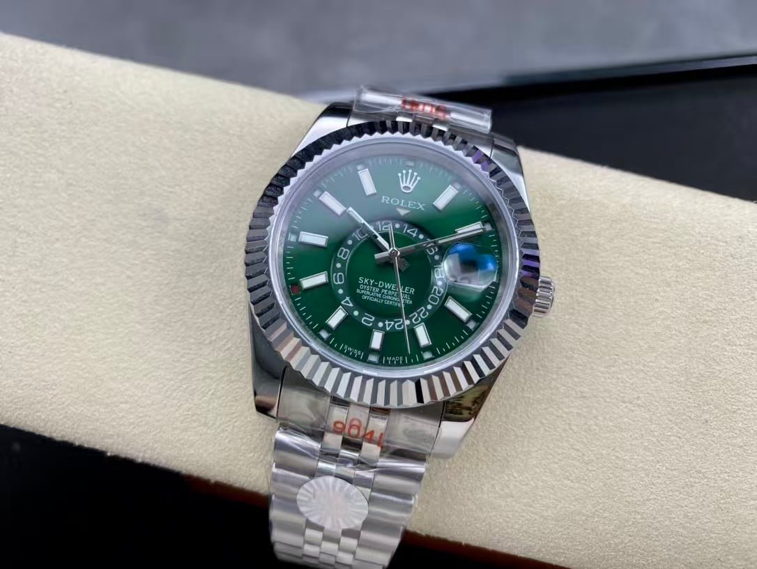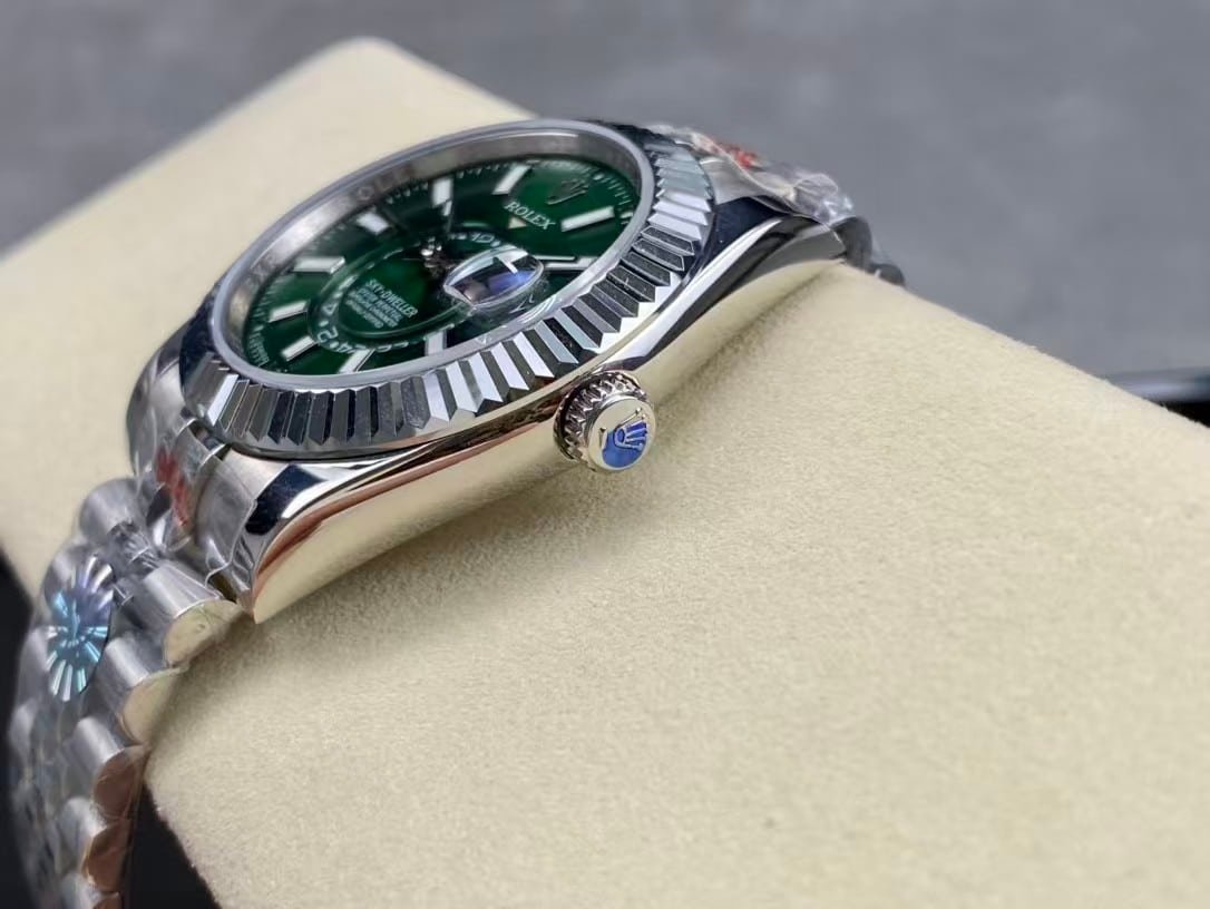 The Rolex Sky-Dweller Green Dial represents a new era of Rolex design — modern, bold, and distinctly refined. The mesmerizing sunburst green dial radiates confidence, while the fluted bezel and Jubilee bracelet complete its unmistakable Rolex character. Clean Factory’s 1:1 super clone perfectly reproduces the complex Saros annual calendar and dual time display, making it both visually stunning and mechanically advanced.