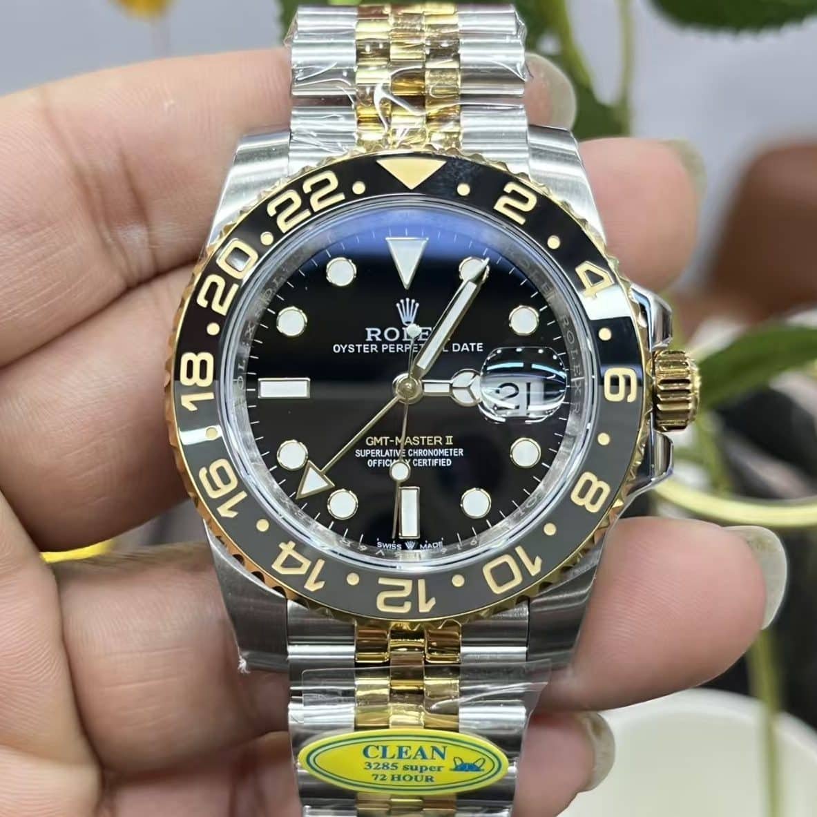 The Rolex GMT-Master II 126713GRNR “Root Beer” stands as one of the most elegant two-tone GMT models ever made. With its black and gold ceramic bezel, 904L steel and 18K gold-tone bracelet, and the high-performance 3285 clone movement, Clean Factory’s super clone delivers an astonishingly realistic experience — both visually and mechanically.