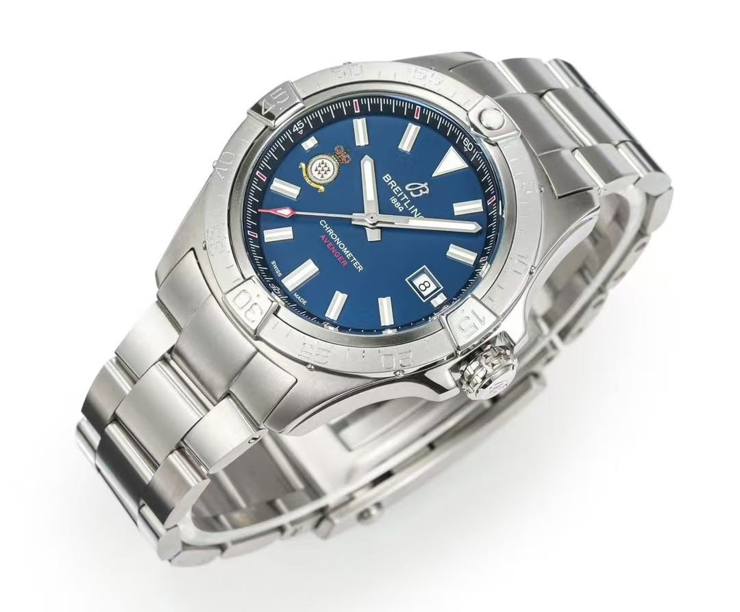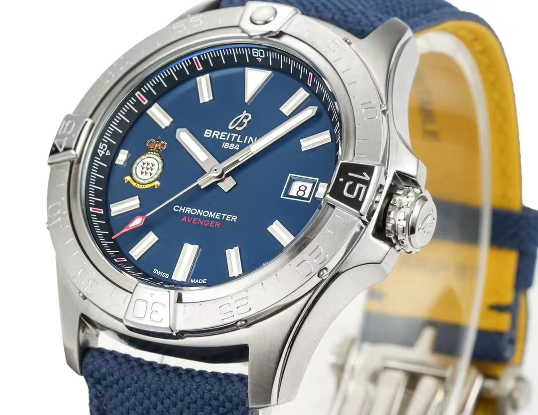 This 43mm Avenger opens with a calm, aerospace-driven presence the moment it settles on the wrist. The blue dial feels deeper than the standard aviation palette, partly because the RAF insignia draws the eye downward before the polished markers return the attention outward. The stainless-steel case on this china super clone Avenger arrives cold and compact, warming slowly during the first 20 minutes until the whole watch begins to feel like a single, steady object anchored against the skin.