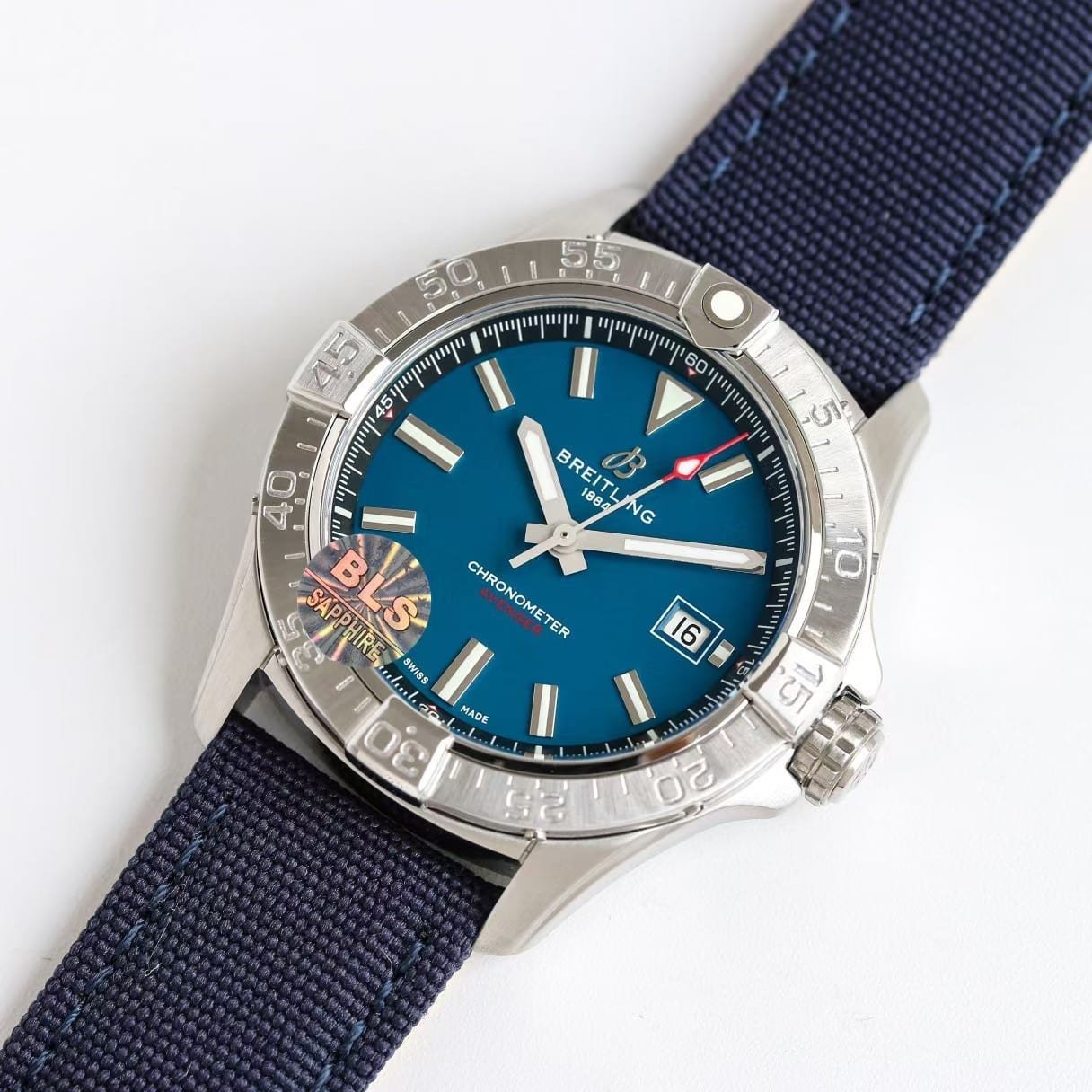 BLS factory Avenger models often prioritize steel machining, color stability, and dial ink clarity, and this RAF edition reflects that philosophy clearly. The blue dial tone is stable across lighting conditions; the insignia print is crisp; the date window alignment is reliable.