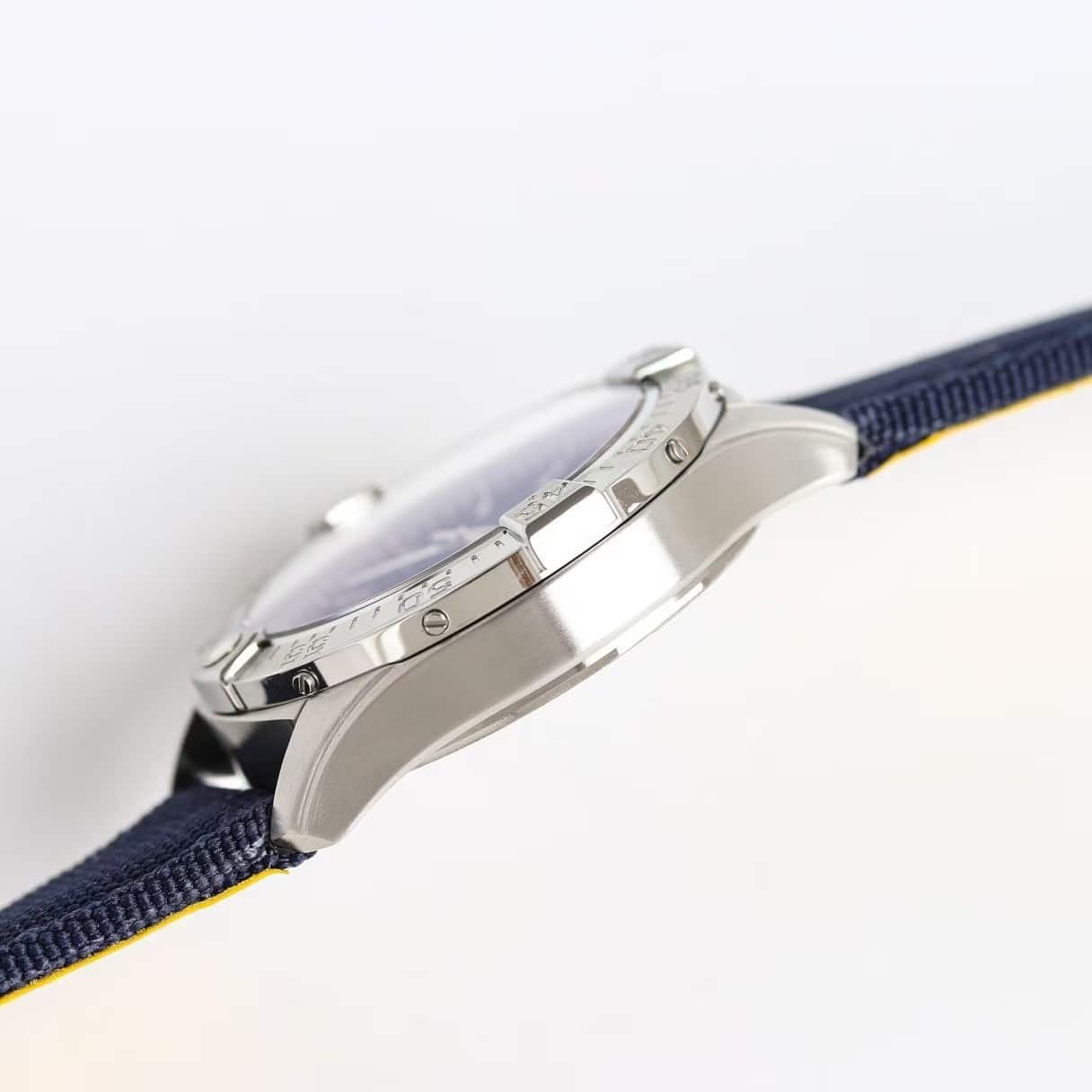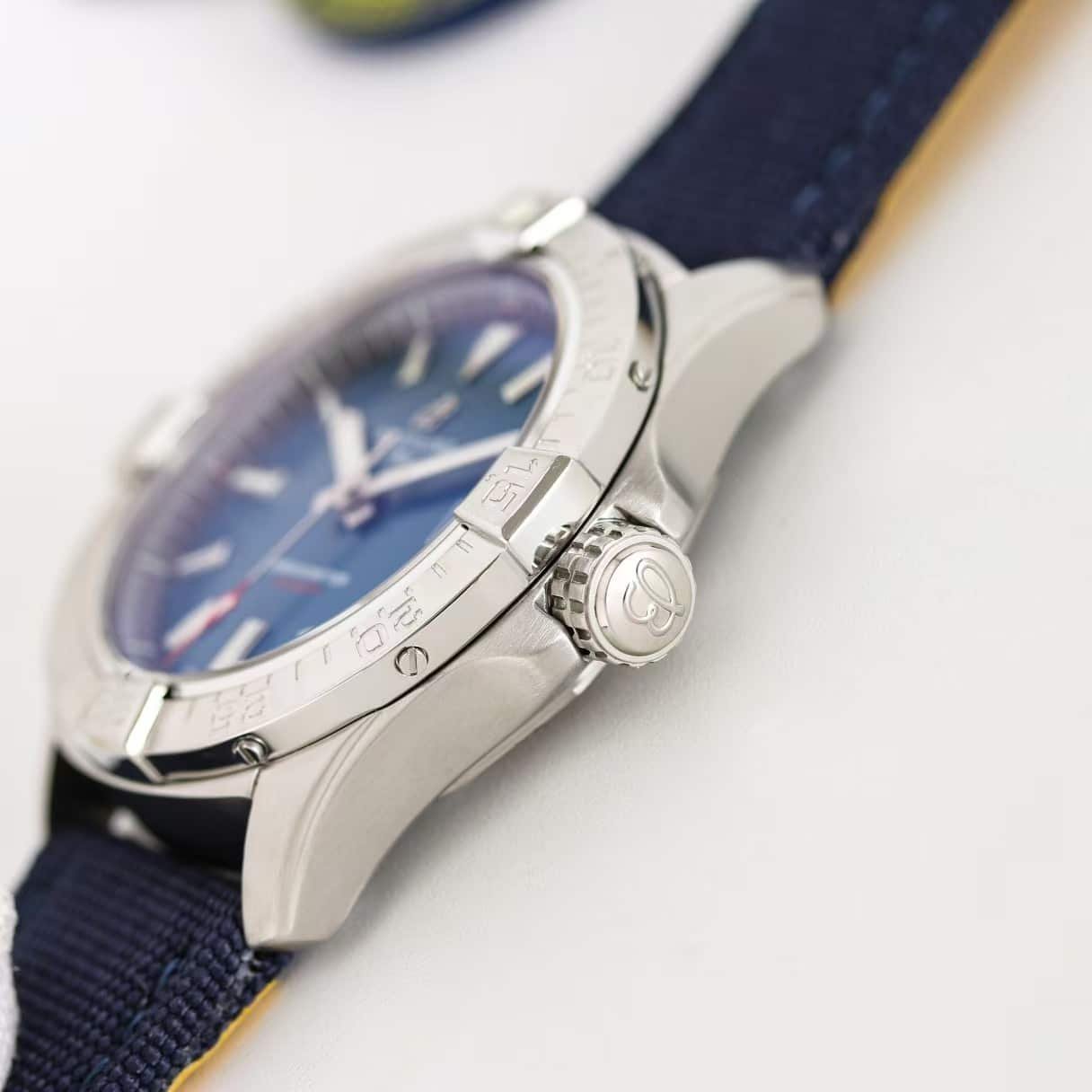 This 43mm Avenger opens with a calm, aerospace-driven presence the moment it settles on the wrist. The blue dial feels deeper than the standard aviation palette, partly because the RAF insignia draws the eye downward before the polished markers return the attention outward. The stainless-steel case on this china super clone Avenger arrives cold and compact, warming slowly during the first 20 minutes until the whole watch begins to feel like a single, steady object anchored against the skin.