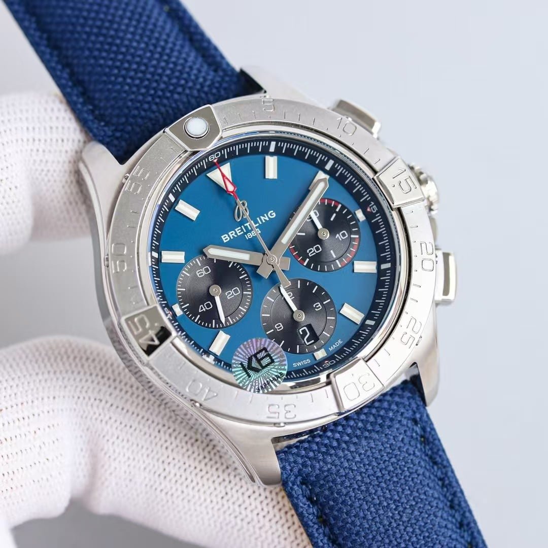 The moment this 45mm blue-dial Avenger touches the wrist, the stainless-steel case gives a lighter, quicker-to-warm sensation than the black-coated versions. The blue dial brightens almost immediately, creating a contrast with the darker sub-dials that feels crisp without becoming loud. As the watch settles, the textile strap helps center the case so it doesn’t roll or shift. This china super clone Avenger doesn’t hide its presence—it shows it through color rather than weight.