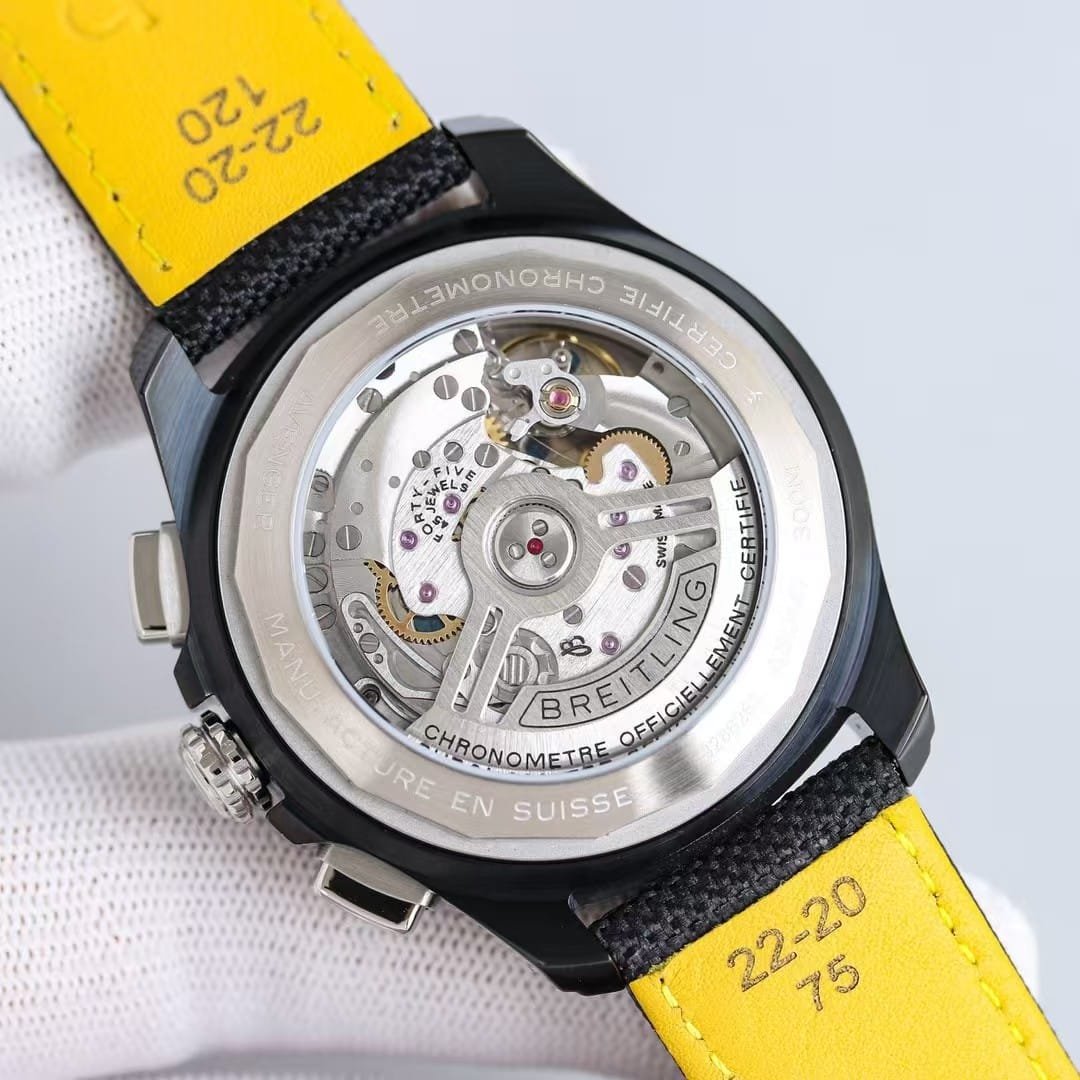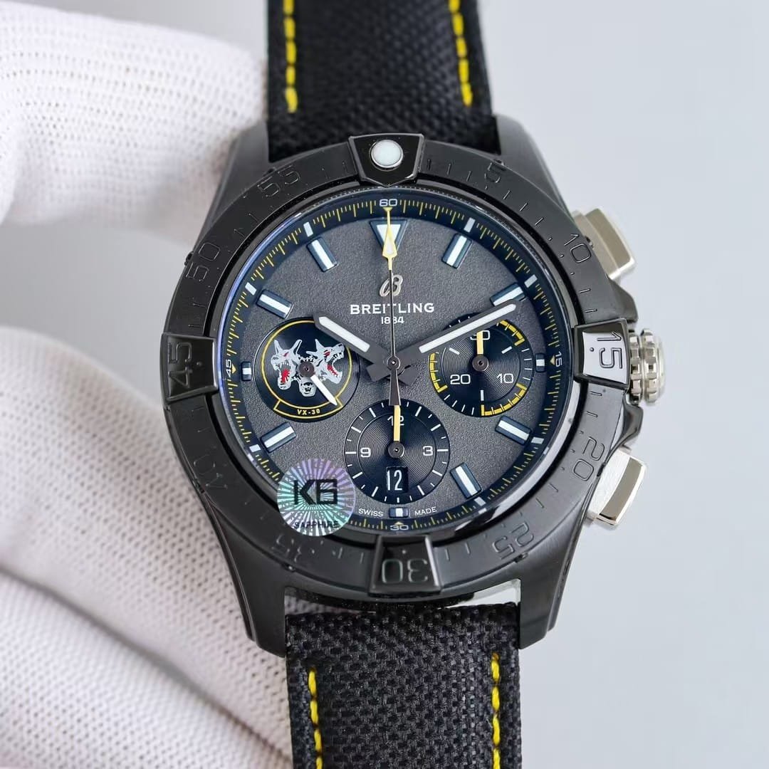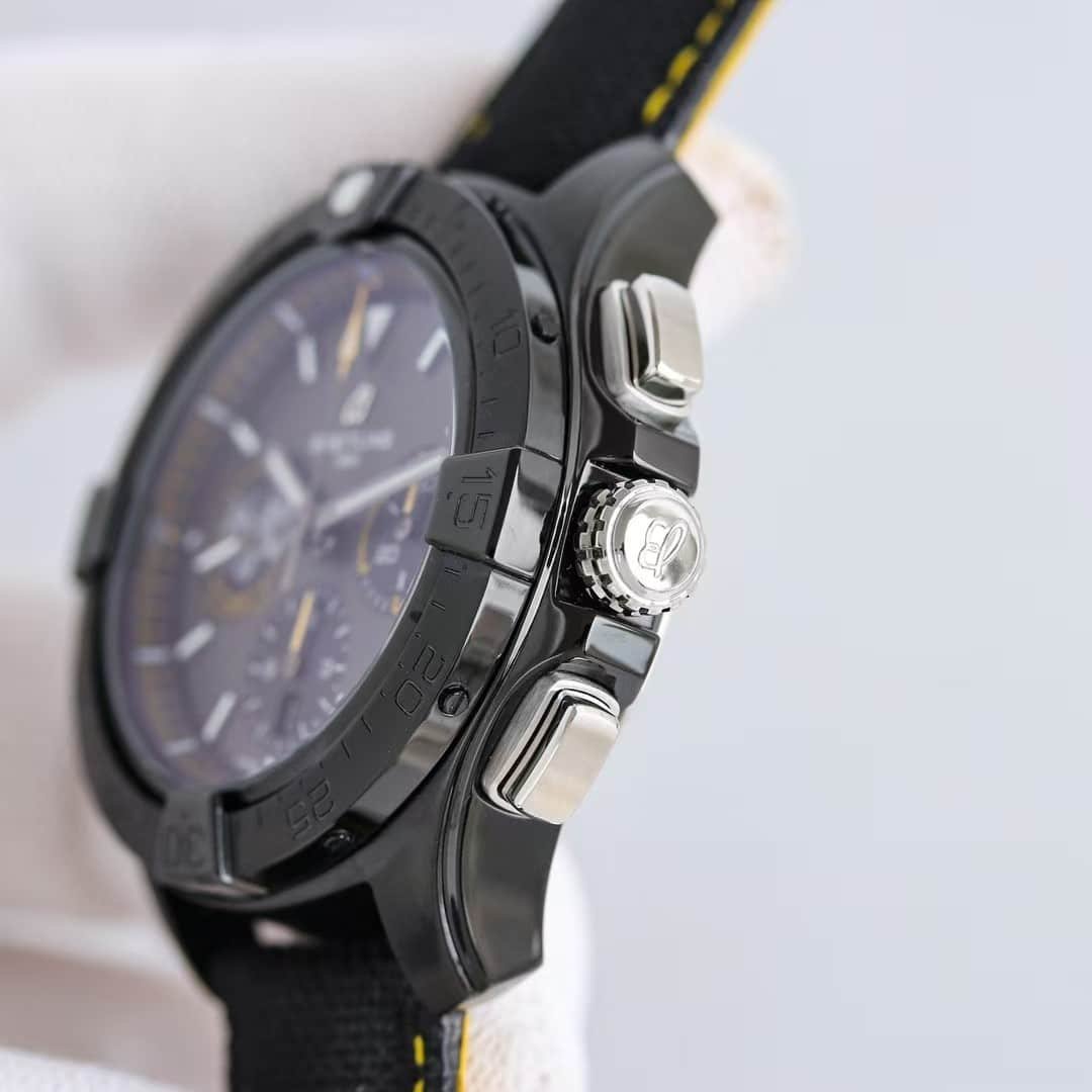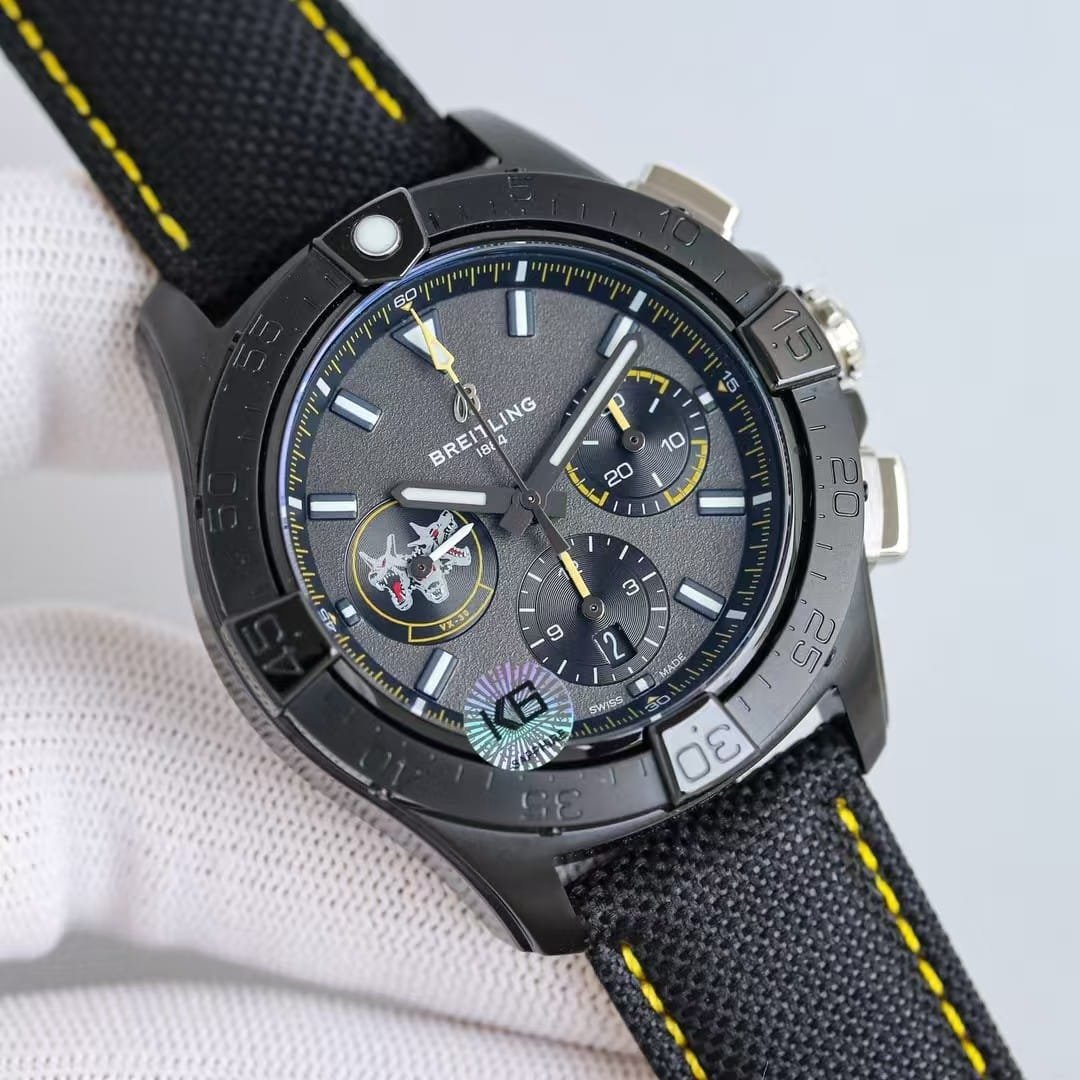 The first moment this 45mm grey-dial Avenger touches the wrist, the black-coated steel feels colder than its size would suggest. The dial remains quiet until you move; then the yellow accents come alive and the matte grey surface breaks into a fine grain. The watch settles quickly because the strap isn’t soft—it holds your wrist before it follows its curve. This china super clone Avenger behaves like something built for pace rather than stillness. Every shift of the arm sends the weight toward the center, keeping the case stable whether you’re walking or leaning forward at a desk.