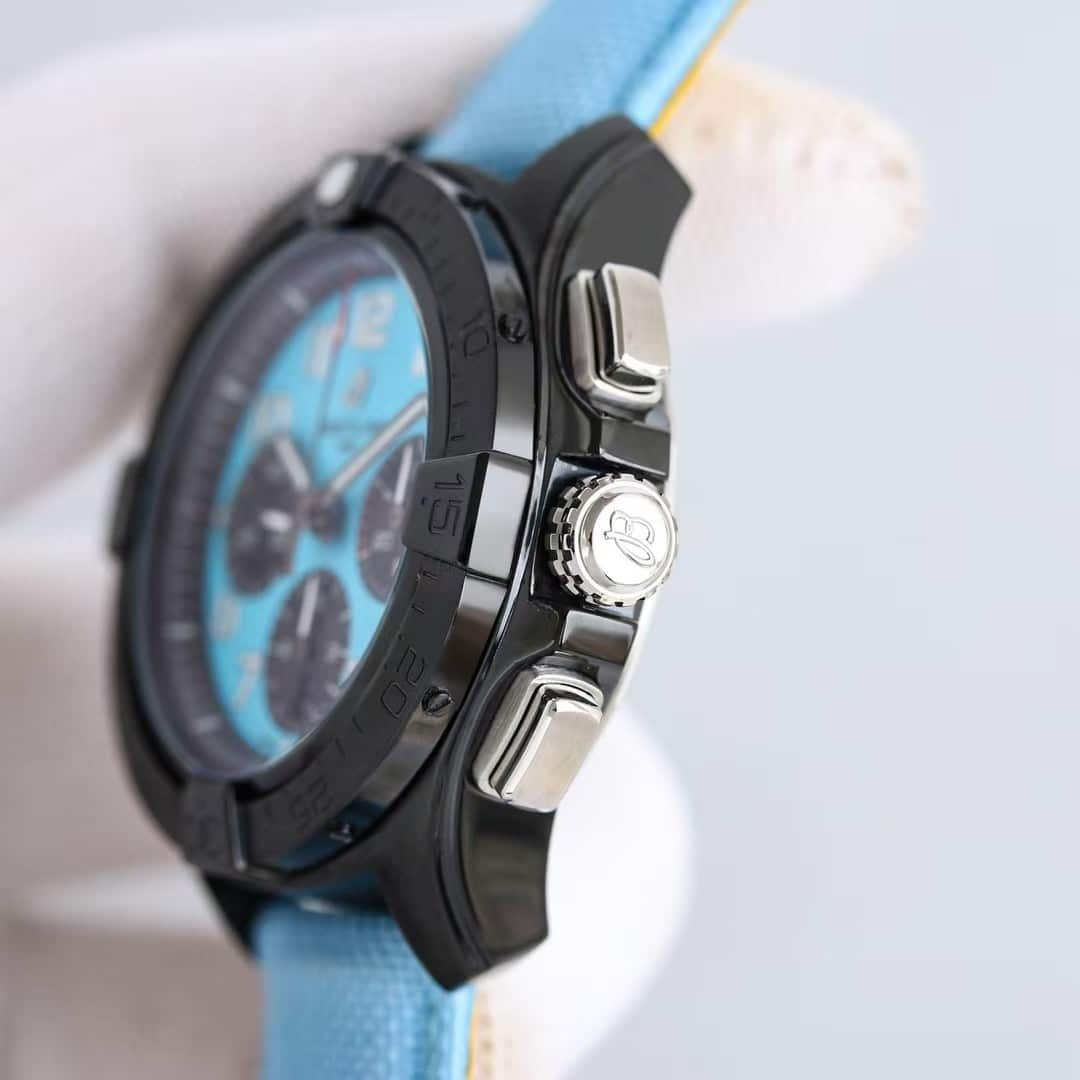 The first thing this 45mm sky-blue Avenger does is catch your eye before it reaches your wrist. The black-steel case frames the bright dial in a way that exaggerates the contrast, making the watch feel larger in sight than it feels in hand. Once the case settles, the cool tone of the dial becomes less playful and more functional—you realize it isn’t just color; it’s a high-visibility surface meant to be read instantly. The sky-blue strap keeps the dial anchored visually, creating a full color system rather than a single accent. This china super clone Avenger projects energy without losing the grounded feel of a tactical chronograph.