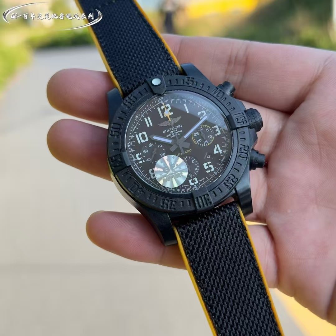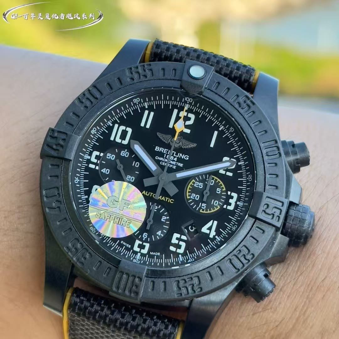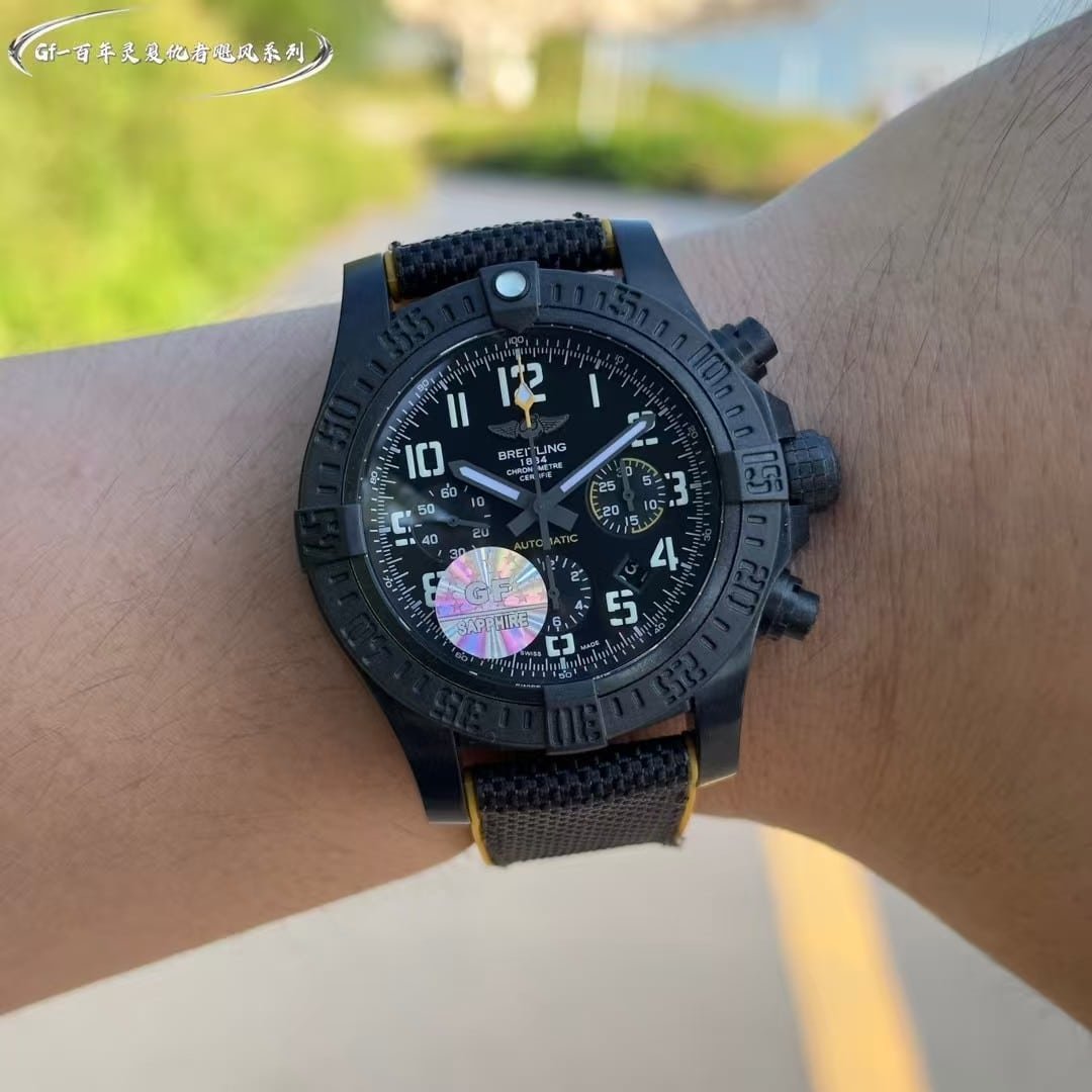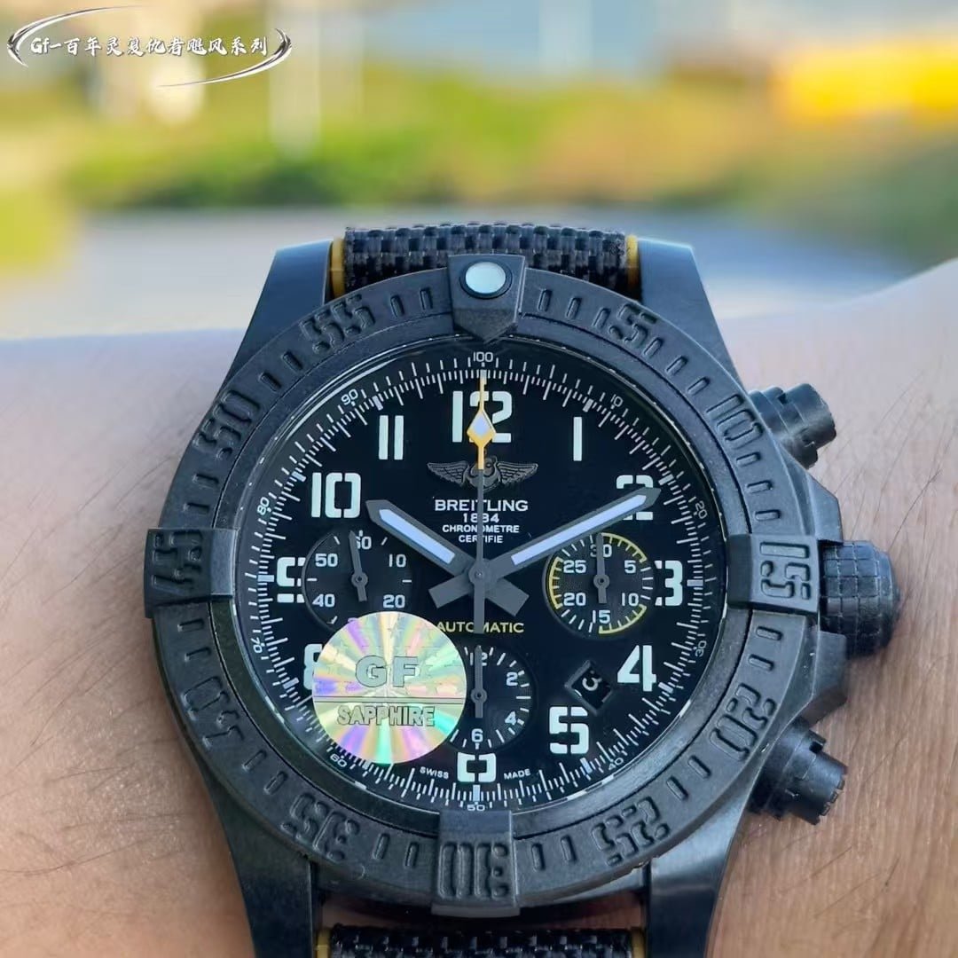 The GF factory version has slightly softer Arabic numerals and marginally different surface texture on the bezel teeth. The chronograph pushers feel firmer than the OEM’s more layered resistance. Lume strength is similar during the first few minutes but fades sooner. The case coating is less complex in tone compared with Breitling’s proprietary finishes. None of these differences break the watch’s identity—they simply give it a slightly more utilitarian personality. My own impression is that it delivers the Avenger’s grip, clarity, and tactile confidence well, but the final decision belongs to you.
