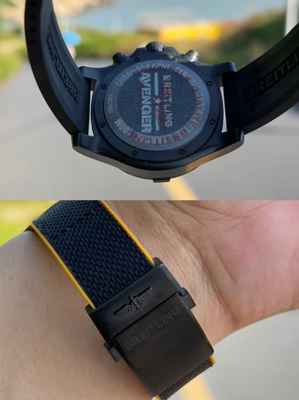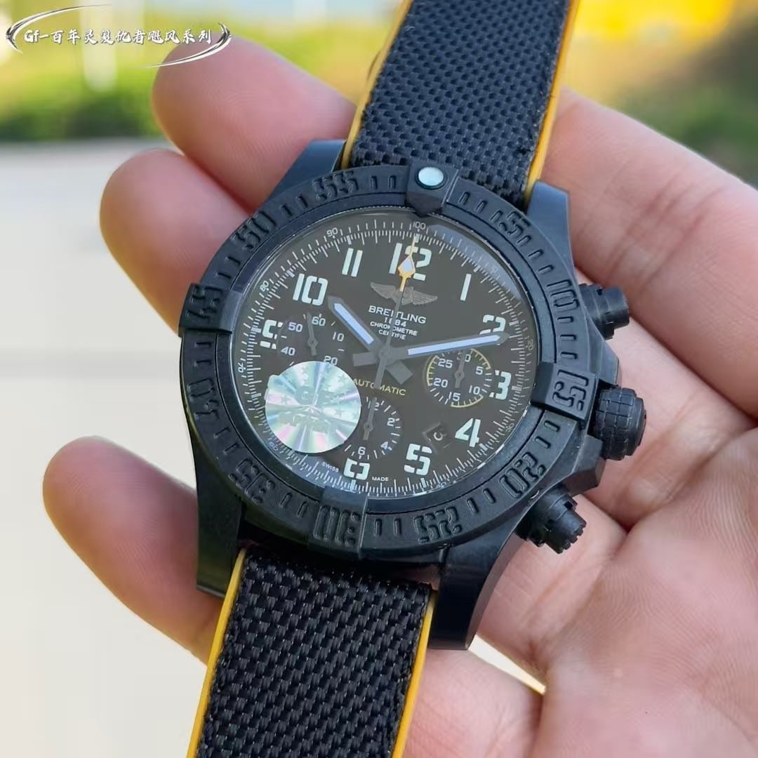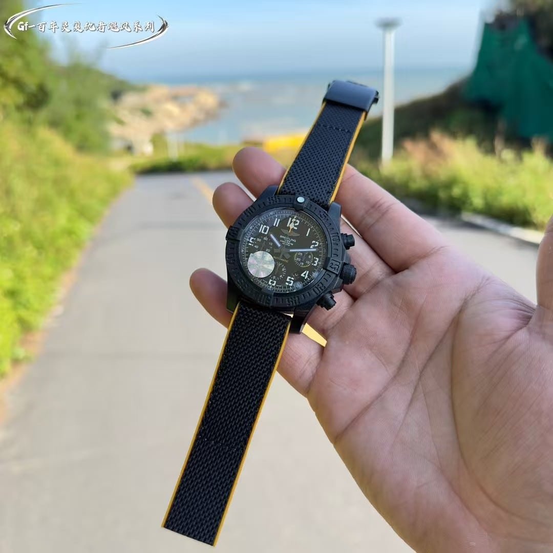The GF factory version has slightly softer Arabic numerals and marginally different surface texture on the bezel teeth. The chronograph pushers feel firmer than the OEM’s more layered resistance. Lume strength is similar during the first few minutes but fades sooner. The case coating is less complex in tone compared with Breitling’s proprietary finishes. None of these differences break the watch’s identity—they simply give it a slightly more utilitarian personality. My own impression is that it delivers the Avenger’s grip, clarity, and tactile confidence well, but the final decision belongs to you.