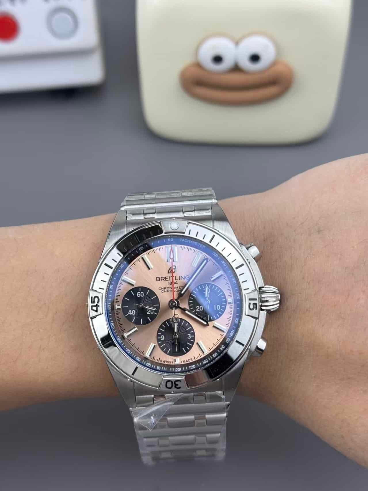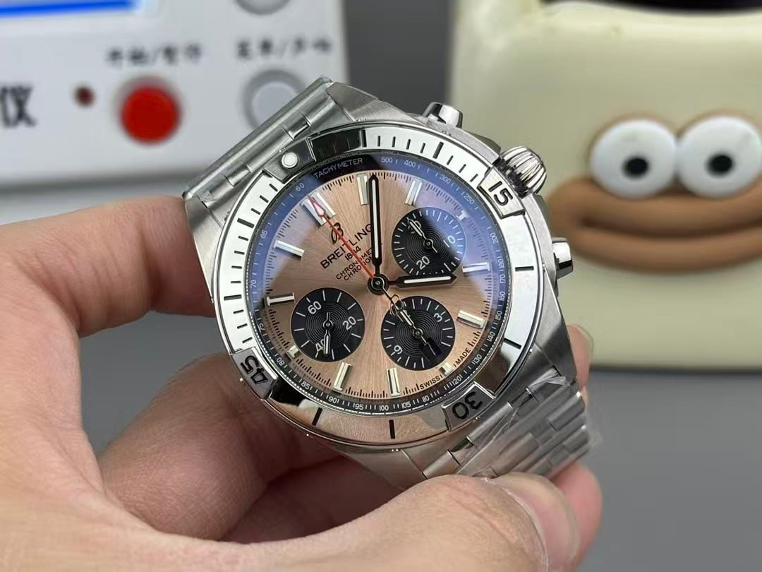 A china super clone Chronomat with a champagne dial behaves differently from the usual blue or black versions. The color shifts more than you expect: warm indoors, metallic under fluorescent light, and almost rose-tinted when the sun hits it at an angle. That shifting quality is part of the watch’s identity, and you feel it even before you start the chronograph. BLS factory tends to approach Chronomat builds with a focus on case presence, bracelet solidity, and pusher consistency — all qualities that become clearer once the watch spends a few minutes on your wrist rather than sitting motionless in a photo.