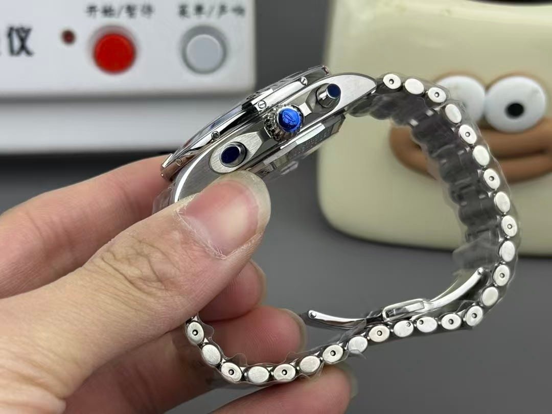 Guangzhou’s replica workshops — especially BLS factory — approach this model by trying to recreate the behavior rather than only the look. They focus on steel shaping, end-link fit, bezel engagement, and consistent pusher feel. And for a Chronomat, behavior is the point.