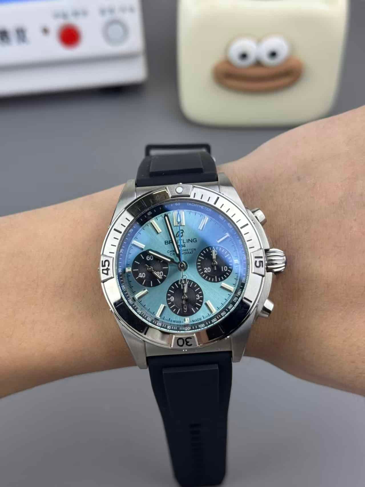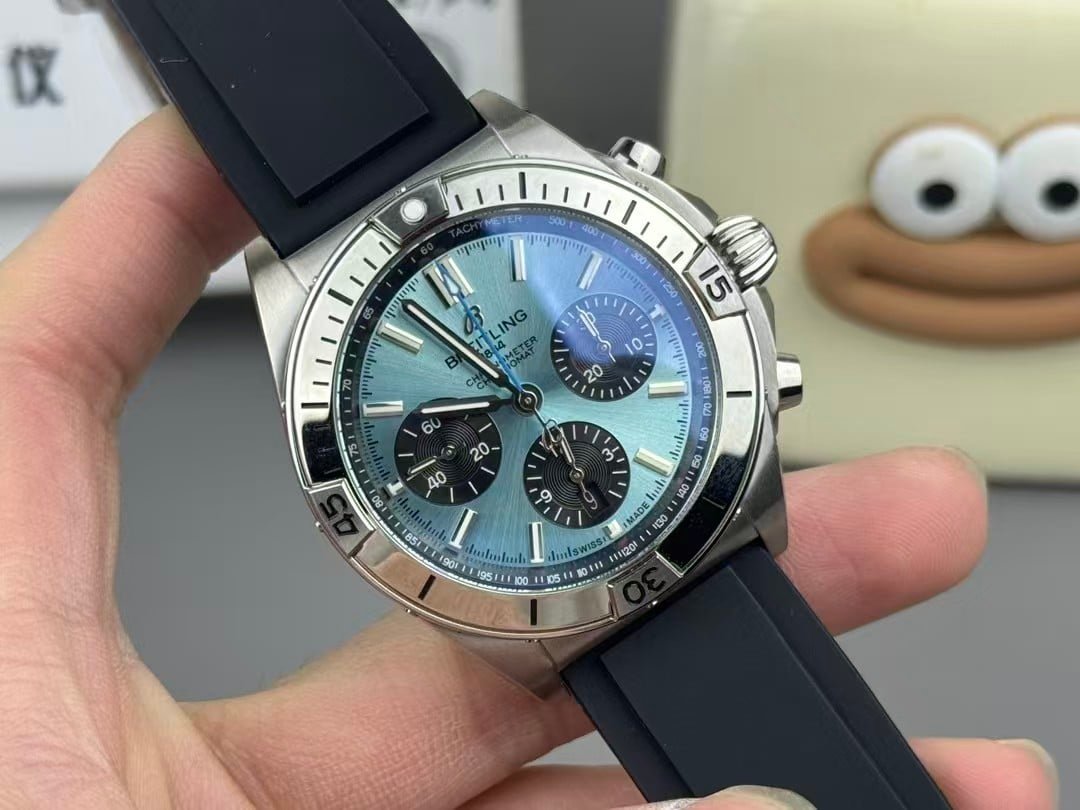 This 42mm ice-blue Chronomat feels lighter than it looks the moment it lands on the wrist. The stainless-steel case warms quickly, losing the initial chill within seconds, while the integrated rubber strap settles softly against the skin. The dial immediately becomes the focal point—not because of brightness, but because ice-blue behaves differently from other tones. Indoors it sits calm and almost matte; outdoors it brightens into a cool metallic wash. This china super clone Chronomat doesn’t rely on weight for presence; the color carries it.