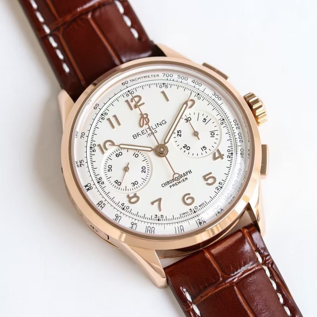 Super Clone Breitling Premier Chronograph 42 Ivory Dial Rose-Gold Tone Case Brown Leather BLS Factory