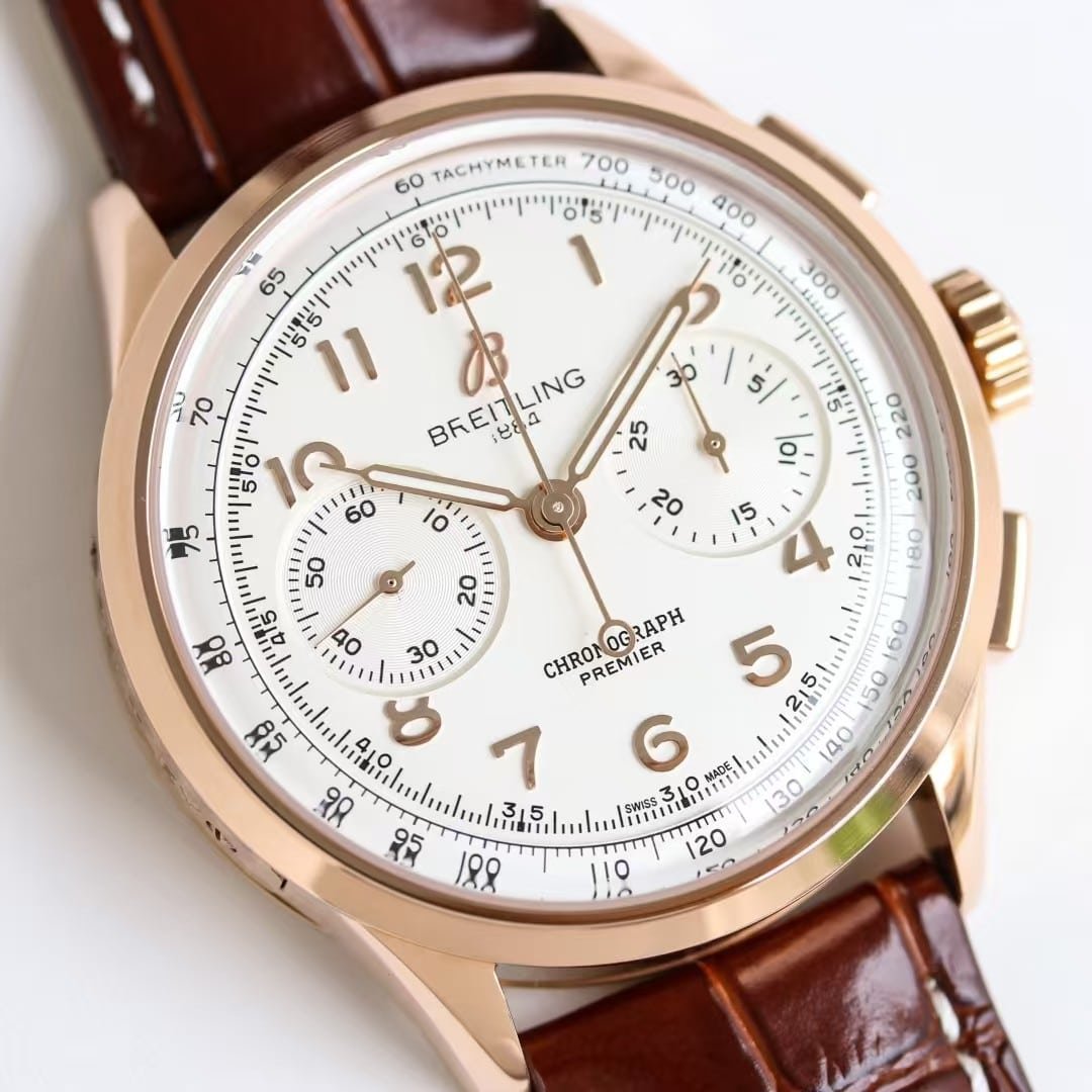 BLS factory typically prioritizes consistent polishing and stable chronograph function, and this rose-gold Premier benefits from that approach. The plating tone is even, without the orange hue that sometimes appears in GR or GF rose-tone batches. The numerals on this version are clean, aligned, and appropriately warm.