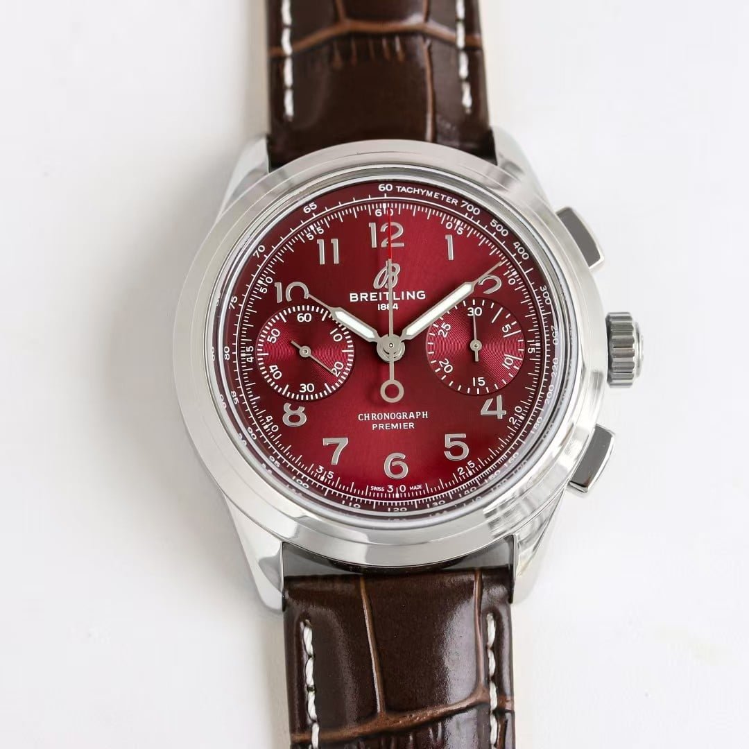 Breitling created the Premier as a chronograph that behaves differently from its aviation siblings — something with more refinement, smoother lines, and an elegance meant for daily use rather than cockpit conditions. This BLS factory replica respects that purpose. The red dial enhances the Premier’s identity by introducing emotional presence without disrupting function.