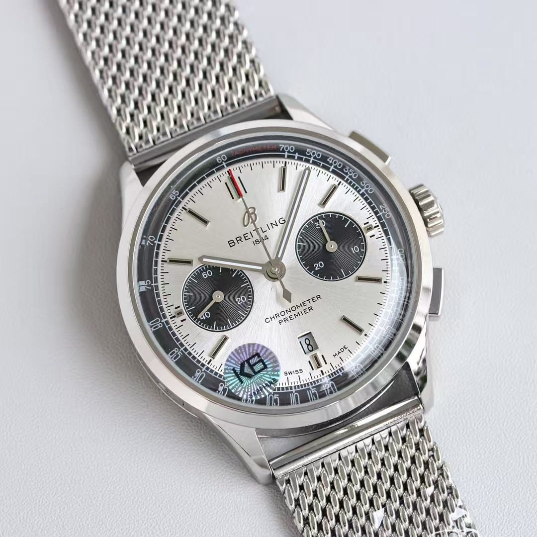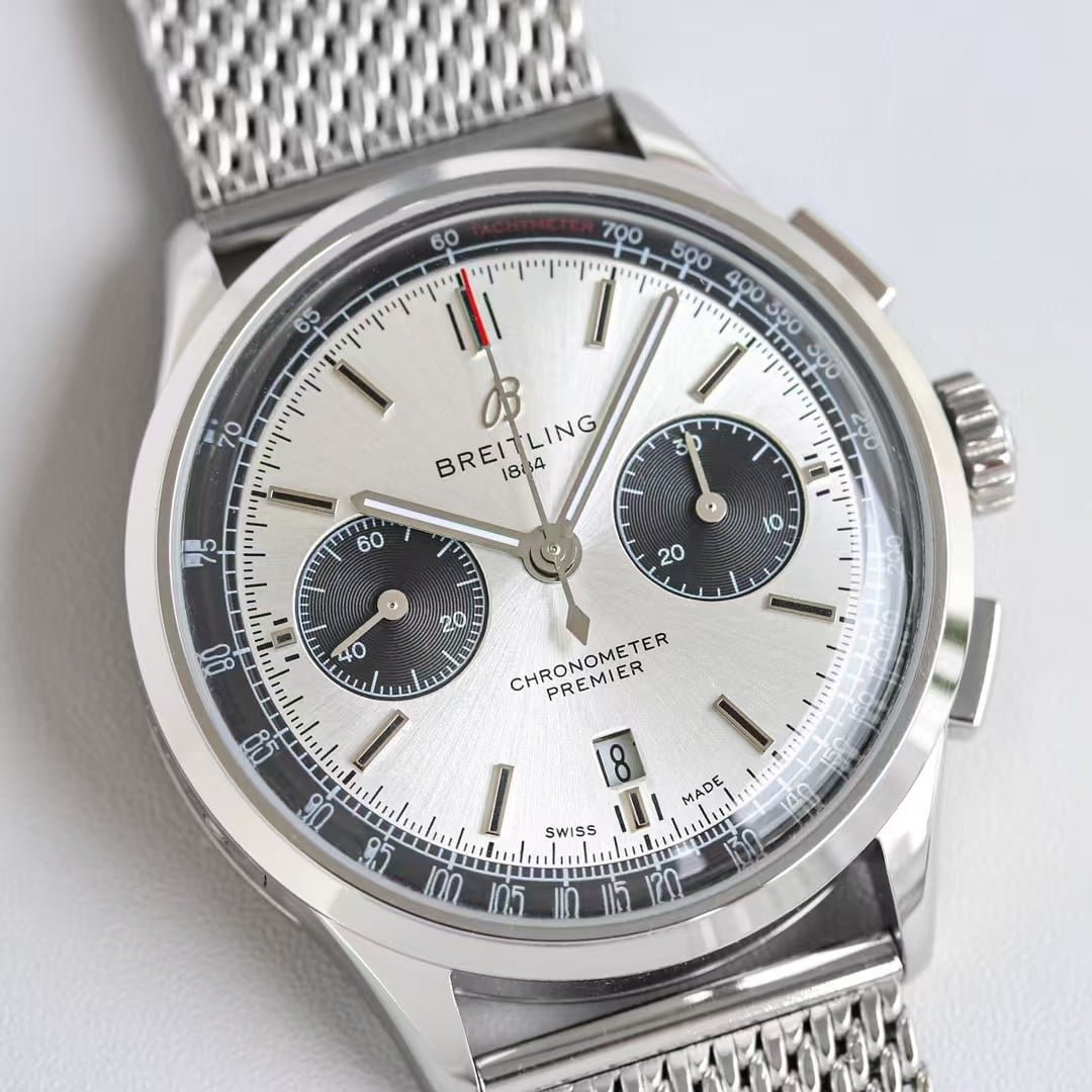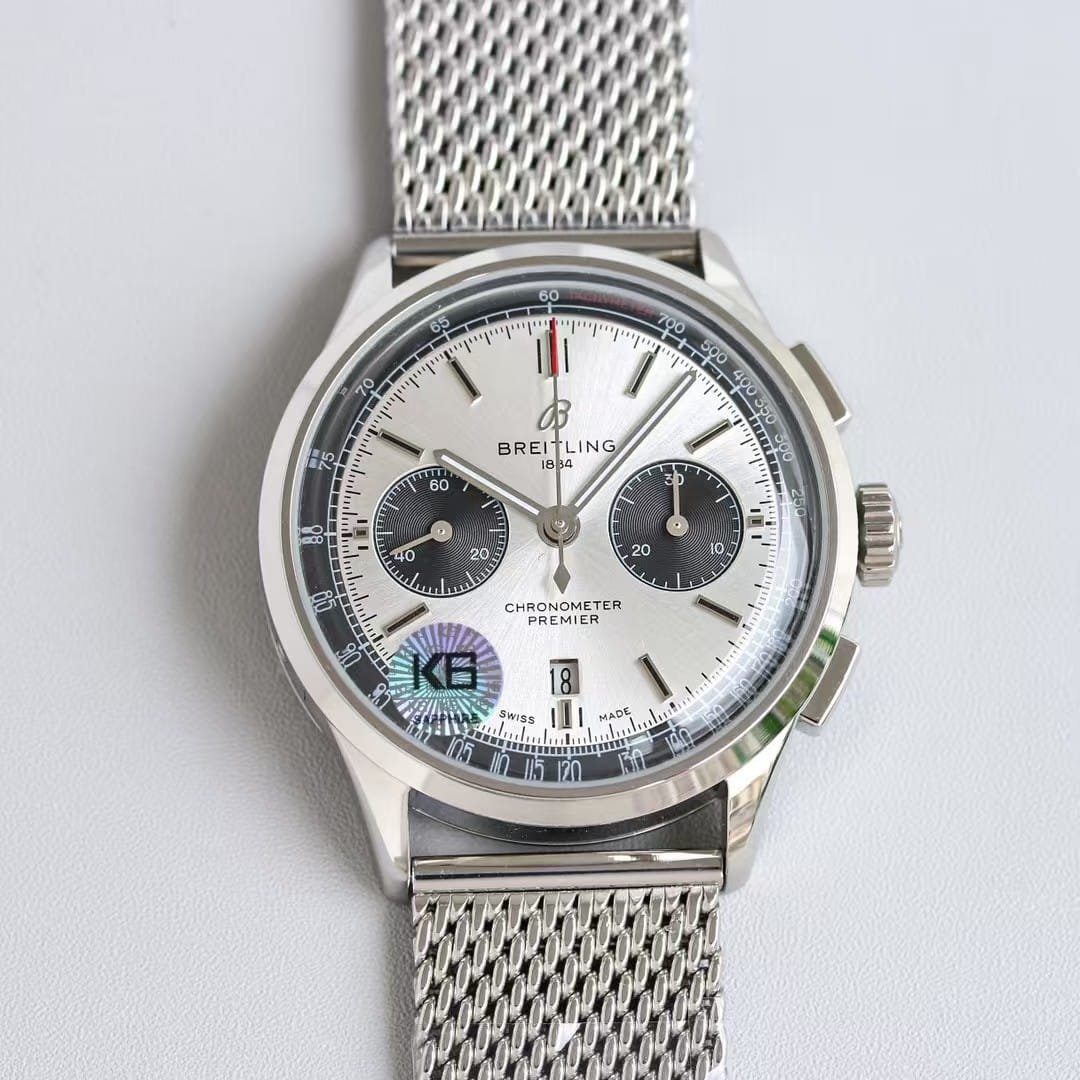 Super Clone Breitling Premier Chronograph 42 Silver Dial with Mesh Bracelet – KB Factory