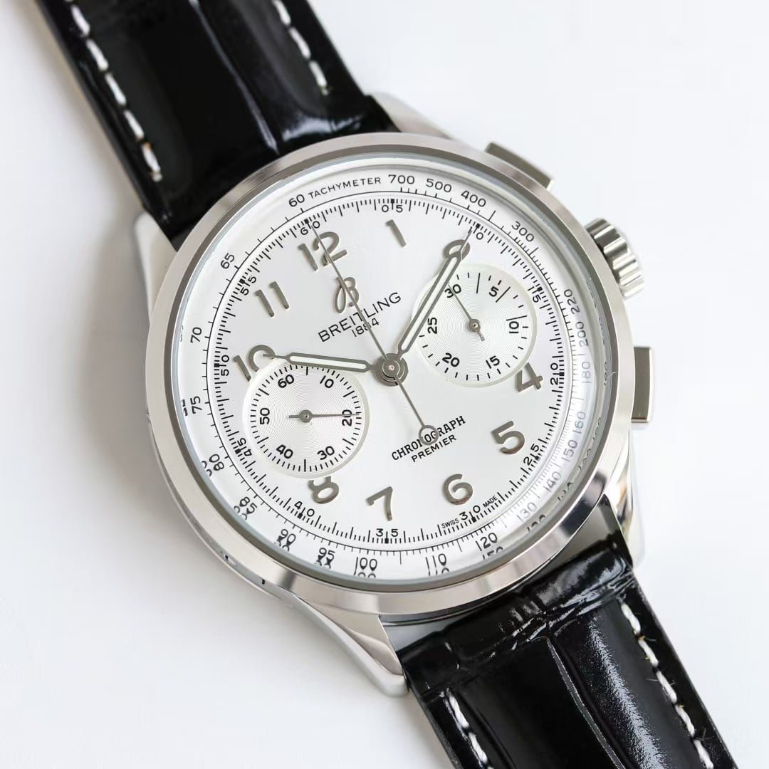 The Premier line was originally Breitling’s gentler counterweight to its aviation and tactical tools. While the Avenger favored oversized pushers for gloved use and aggressive bezels for cockpit readability, the Premier focused on clarity, pacing, and day-to-day urban wear. You can still sense that lineage today. The long, slender hands recall instrument precision but without the urgency. The printed numerals feel like they were chosen for legibility rather than personality. Even the tachymeter ring sits quietly in the background, ready when needed but rarely demanding attention. The original purpose was simple: a chronograph that worked in motion but didn’t look like it belonged only to people jumping out of aircraft. This super clone interpretation made in Guangzhou workshops holds on to that spirit.