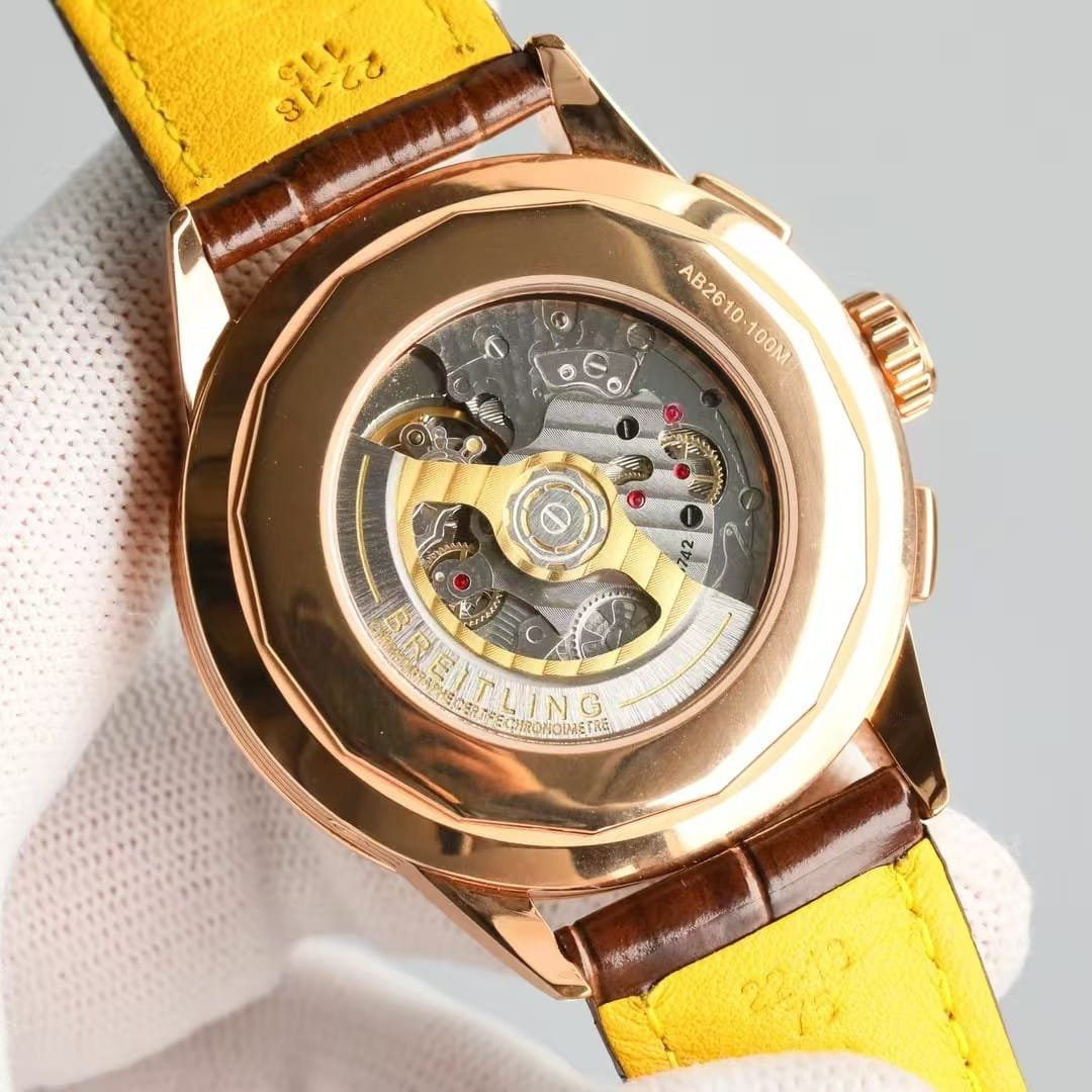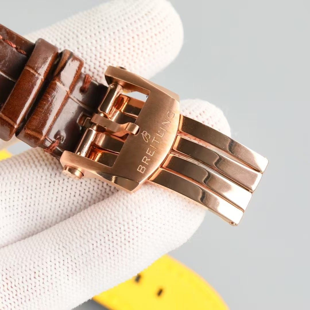 Rose gold can be tricky for factories — too pink and it looks cheap, too yellow and it loses elegance. BLS factory leans toward a restrained rose tone, one that looks closer to genuine Breitling than many Guangzhou productions. It catches light without overreacting, which is essential for a watch with this much dial activity.