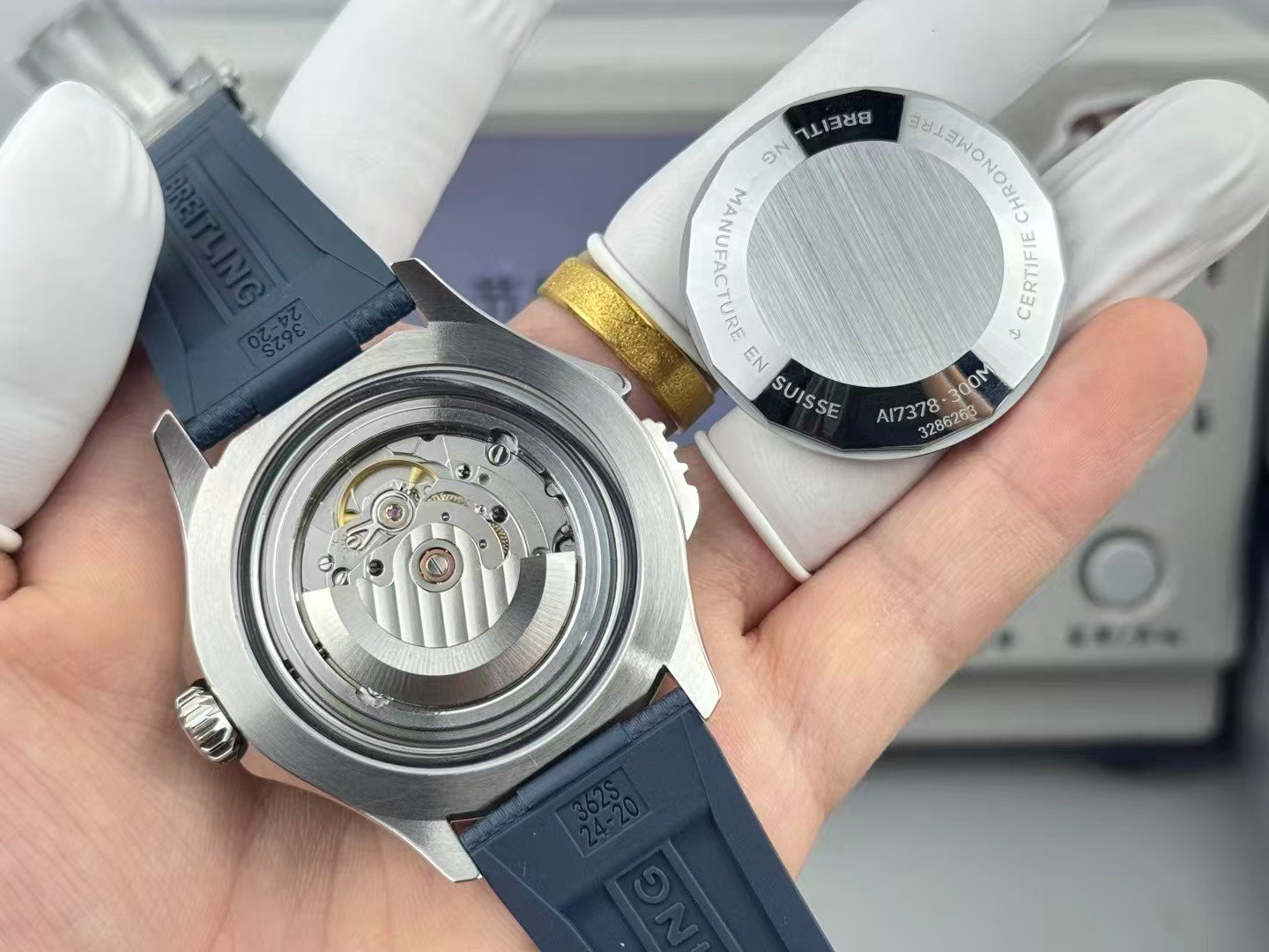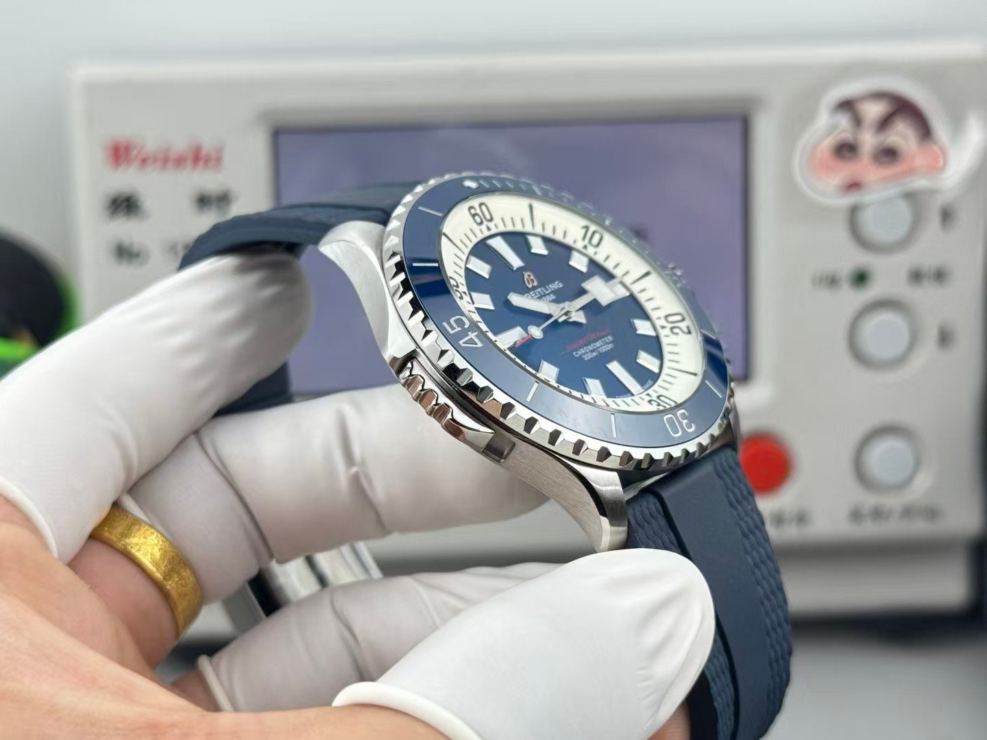 Some colors feel predictable on a dive watch. Blue isn’t one of them—at least not when it shifts between deep navy in shade and bright maritime blue in sunlight. This Superocean 44 from the BLS Factory China replica edition uses that shifting behavior as its identity. It pairs a rich ocean-blue dial, a cream outer minute ring, a glossy blue bezel, and a textured blue rubber strap, creating a diver that feels fresh without losing its tool-watch discipline.