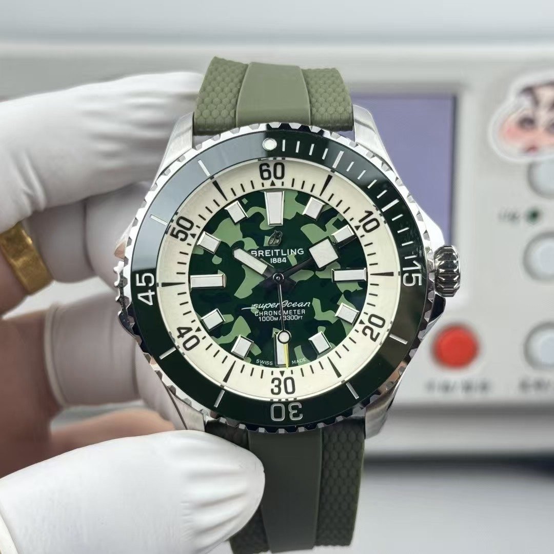 Super Clone Breitling Superocean 44 Green Camouflage Dial Stainless Steel Military-Green Rubber Strap — BLS Factory (China Replica Edition)