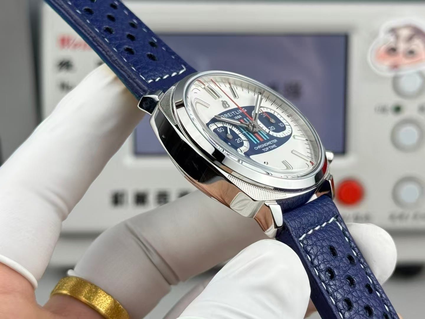 The Breitling Top Time in this blue-white reverse-panda configuration feels different from the DEUS editions and even from other colorways in the series. The first moment it settles on the wrist, the watch shows a cleaner, more contemporary rhythm—lighter in presence, sharper in contrast, and more intentional in how the blue tones respond to the surrounding light. The polished steel case carries a soft coolness that works naturally with the deep blue perforated leather strap, and the white dial amplifies that temperature shift by offering a clear visual field that almost brightens the wrist. This china super clone Top Time leans into a youthful, graphic expression of the series rather than the nostalgic tone some variants carry, and that shift is noticeable from the very first wear.