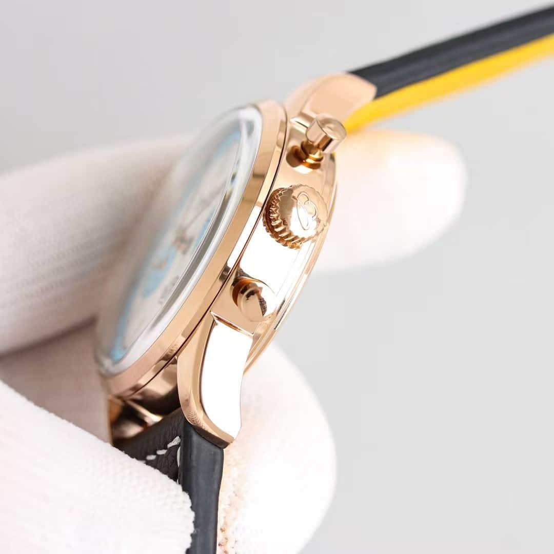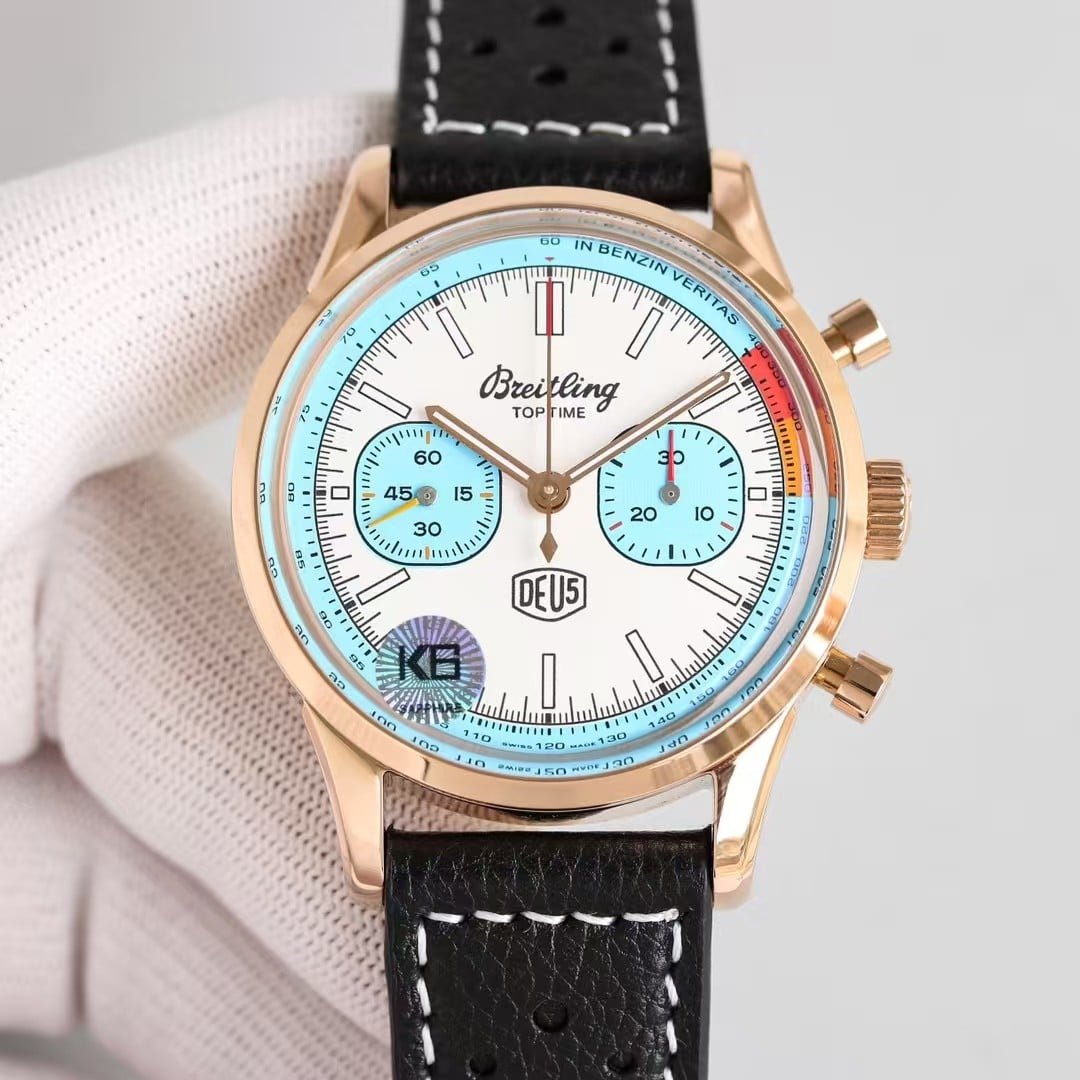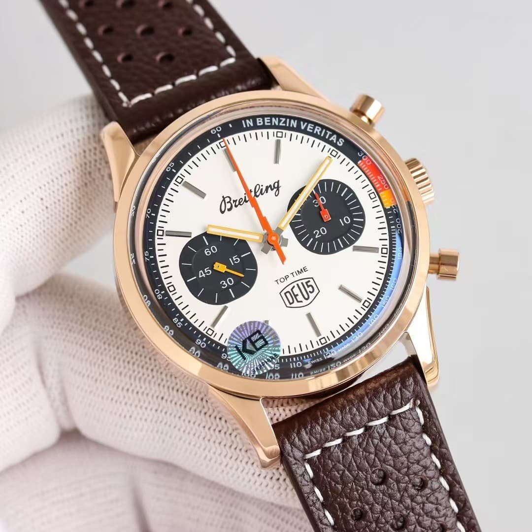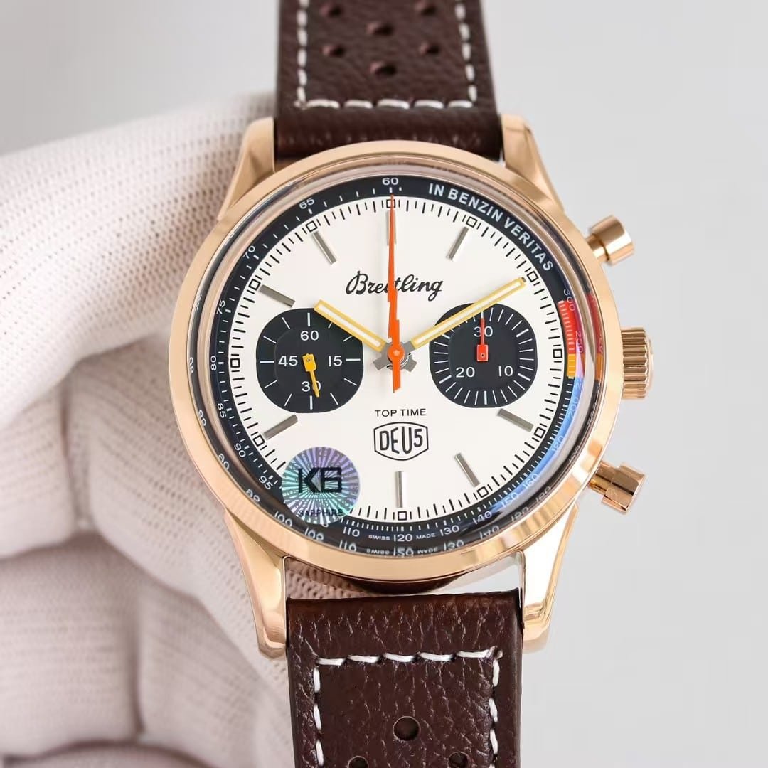 The rose-gold Top Time DEUS from KB Factory introduces a different personality compared to the steel versions—it feels warmer, more expressive, and more intentional the moment it settles on the wrist. The 41mm case doesn’t try to look oversized or aggressive; instead, the brushed-and-polished rose-gold tone softens the entire silhouette and brings out the layered colors on the dial in a way steel cannot. The white dial becomes slightly cream-tinted under indoor light, the black subdials appear deeper, and the yellow and red elements seem to glow a little brighter against the warmer metal. The watch doesn’t behave like a classic dress chronograph, nor like a streetwear accessory; it sits somewhere in between, offering a relaxed profile with enough presence to register at a glance. This china super clone Top Time leans toward a youthful retro vibe, not by being loud, but by being naturally expressive in both color and motion.