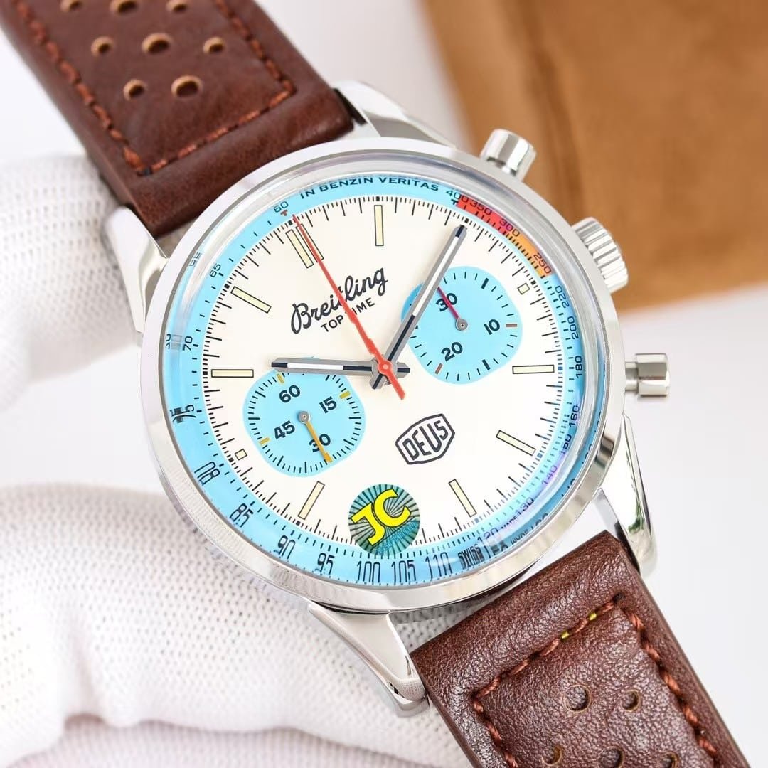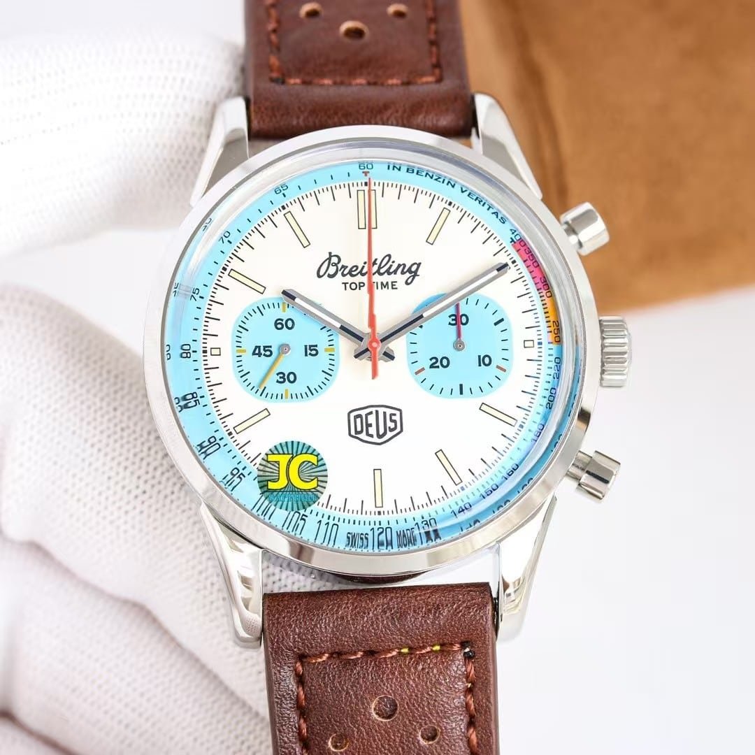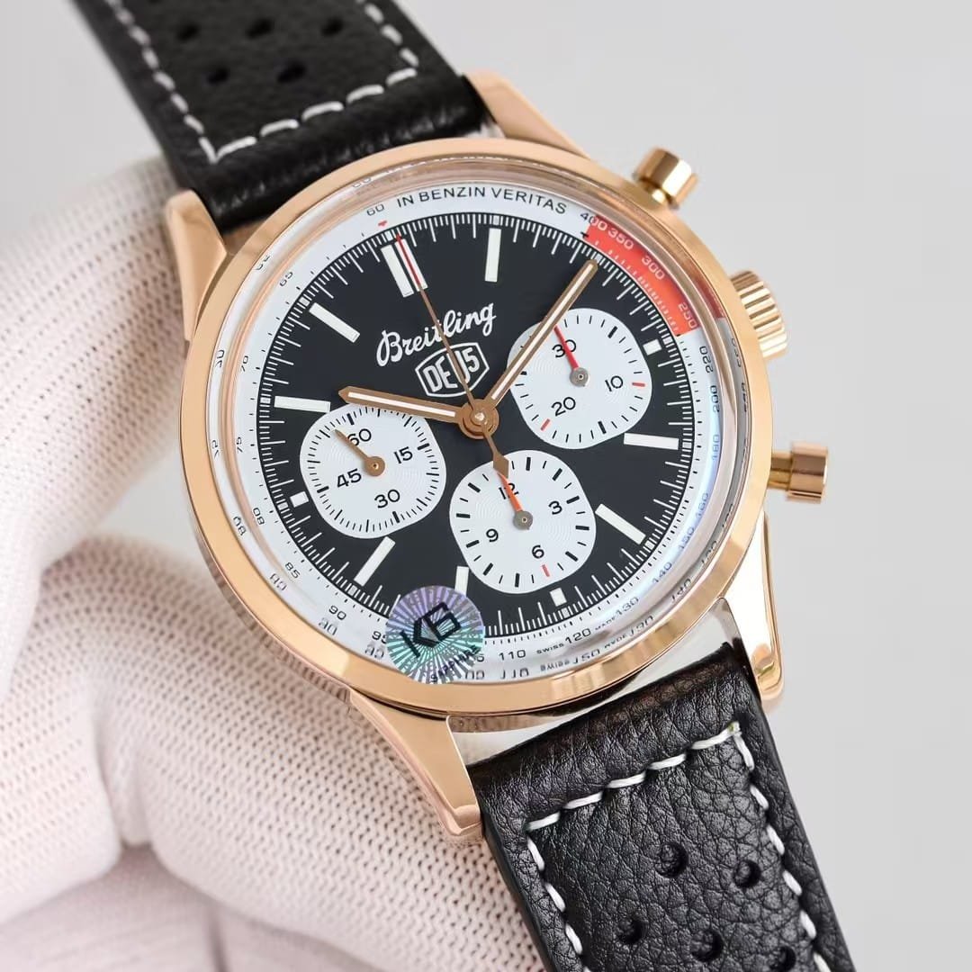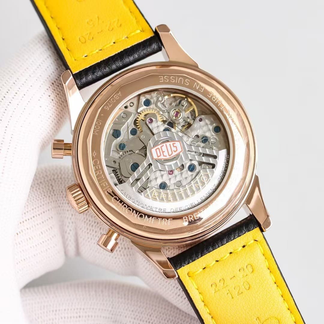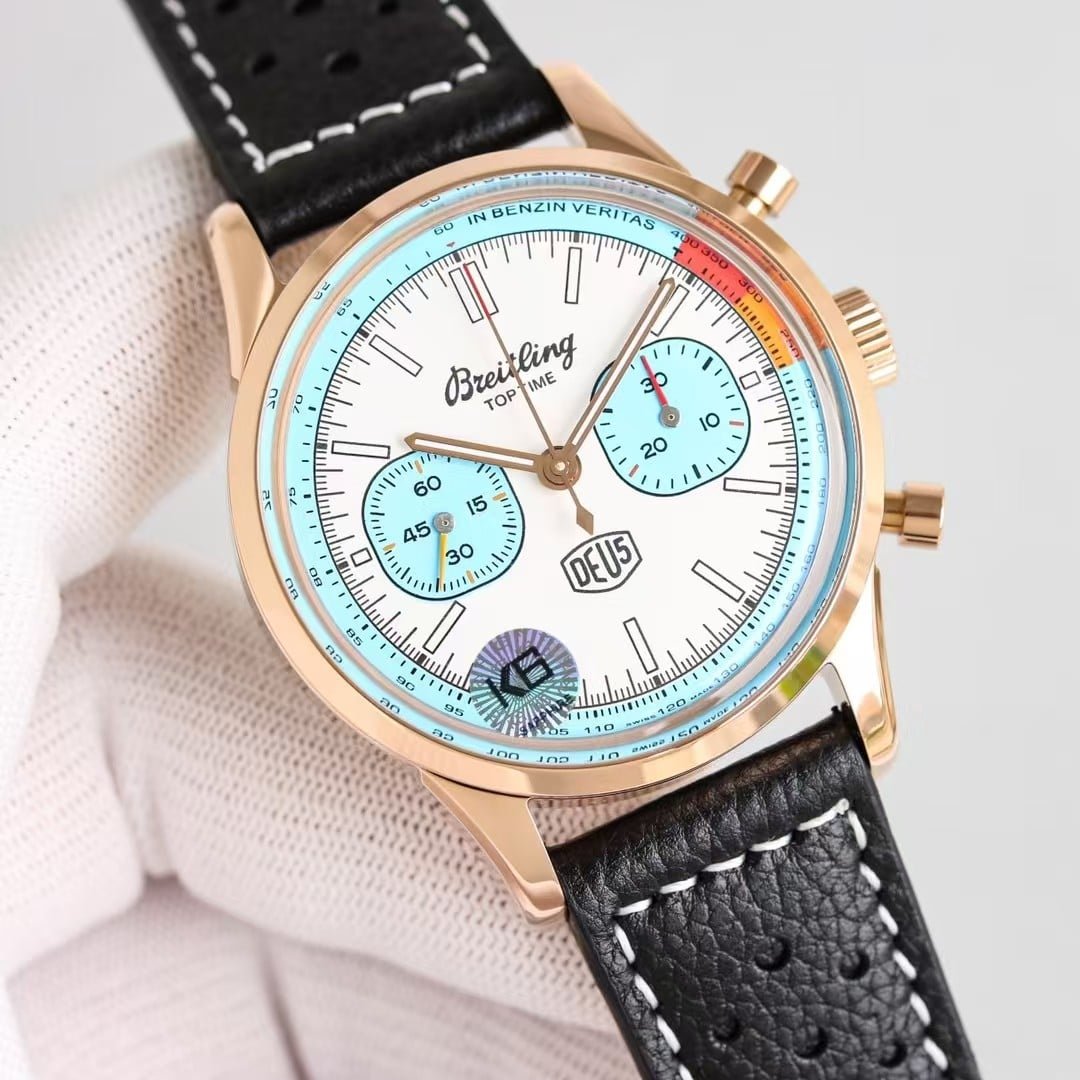 The rose-gold Top Time DEUS from KB Factory introduces a different personality compared to the steel versions—it feels warmer, more expressive, and more intentional the moment it settles on the wrist. The 41mm case doesn’t try to look oversized or aggressive; instead, the brushed-and-polished rose-gold tone softens the entire silhouette and brings out the layered colors on the dial in a way steel cannot. The white dial becomes slightly cream-tinted under indoor light, the black subdials appear deeper, and the yellow and red elements seem to glow a little brighter against the warmer metal. The watch doesn’t behave like a classic dress chronograph, nor like a streetwear accessory; it sits somewhere in between, offering a relaxed profile with enough presence to register at a glance. This china super clone Top Time leans toward a youthful retro vibe, not by being loud, but by being naturally expressive in both color and motion.
