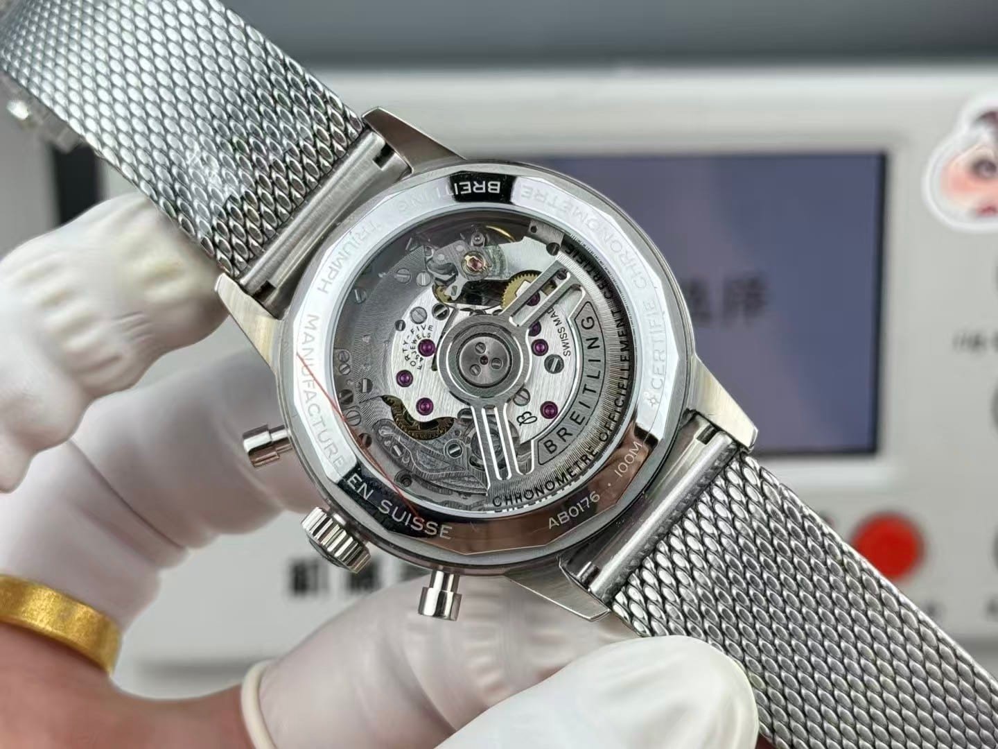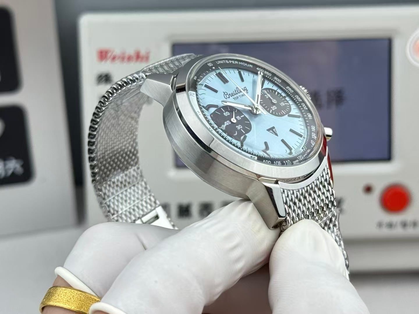 The Breitling Top Time in a 41mm ice-blue dial doesn’t try to look tough or tactical. It feels like a street piece from the moment it settles on the wrist—light, fast to read, and more expressive than the heavier chronographs that dominate the market. When the mesh bracelet cools against the skin, it sets a calm tone for the morning, and the dial’s soft blue flare comes alive before you even tilt your arm toward the light. This china super clone Top Time leans into the retro-street personality that defines the series, offering a wrist presence that’s casual but deliberate.