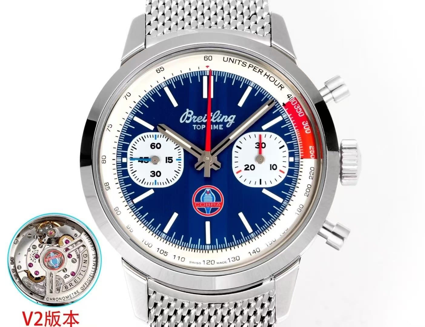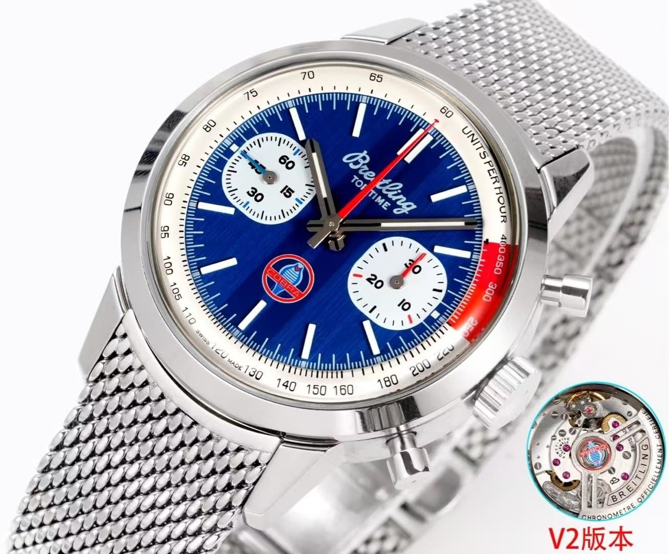 Super Clone Breitling Top Time 41 “Shelby Cobra” Blue Dial Stainless Steel Mesh Bracelet BLS Factory