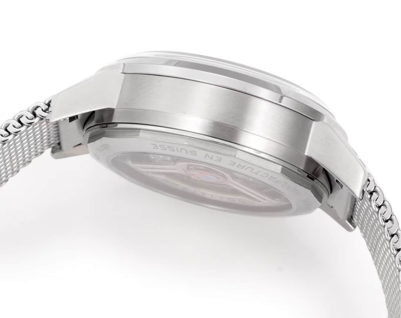 The mesh bracelet contributes significantly to the wearing experience. It begins cool and firm, but warms quickly, softening around the wrist without losing structure. The interlinked steel design distributes weight evenly and moves with a fluidity that suits this racing-inspired dial. Over time, brushing becomes smoother, micro-reflections become more refined, and the bracelet adapts to wrist contours in a way solid links cannot. BLS mesh bracelets often start slightly stiffer than premium Swiss versions, but they break in faster, making the watch more comfortable within the first few days of wear.