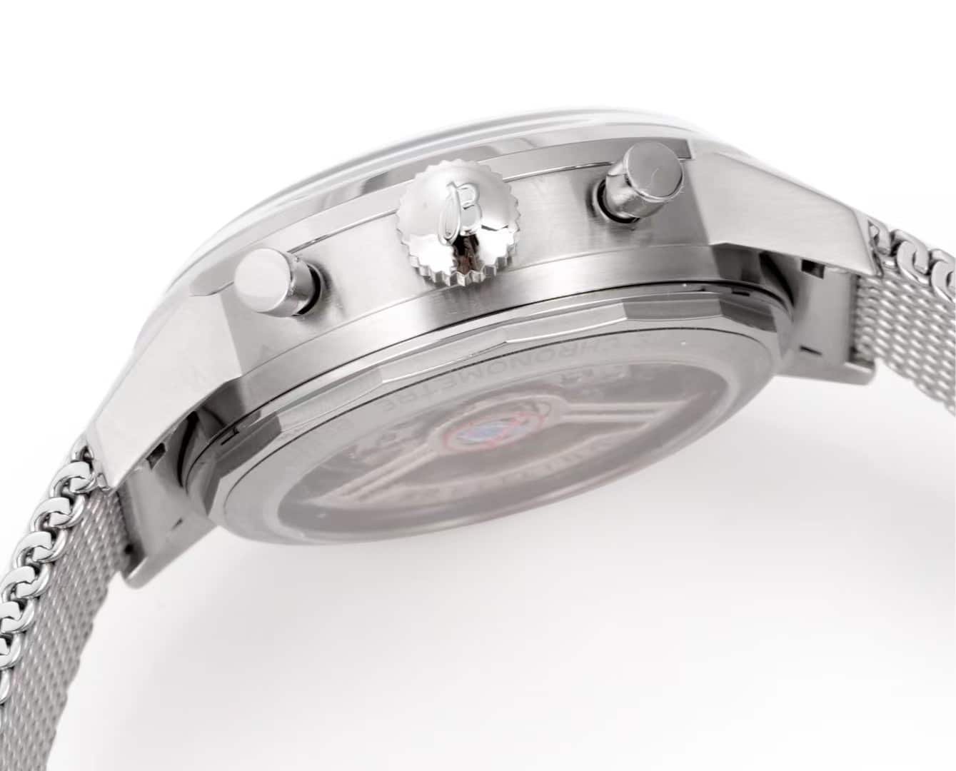 The Breitling Top Time “Shelby Cobra” edition in its 41mm steel configuration feels like one of the most energetic designs in the entire Top Time line. The deep blue dial amplifies the retro-racing theme immediately, yet the watch doesn’t fall into costume aesthetics; it settles on the wrist with a modern lightness and a clean graphic balance that makes the Cobra emblem feel like a natural part of the dial rather than decoration. The mesh bracelet adds a refined brightness, and together they create a piece that feels streamlined, quick, and visually alert. This china super clone Top Time leans into color-driven performance identity instead of leaning on nostalgia, and that difference becomes obvious the moment the watch warms against the skin.