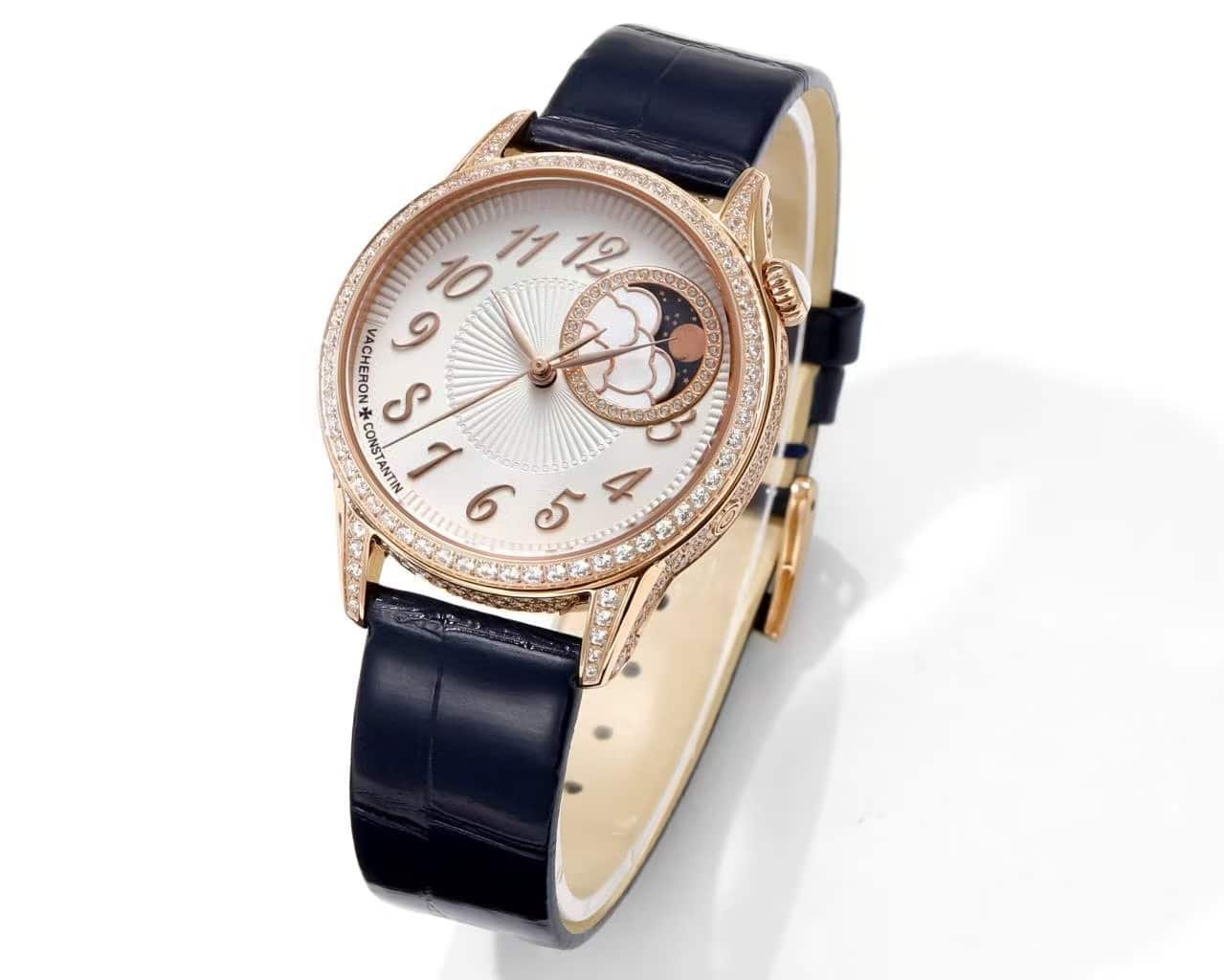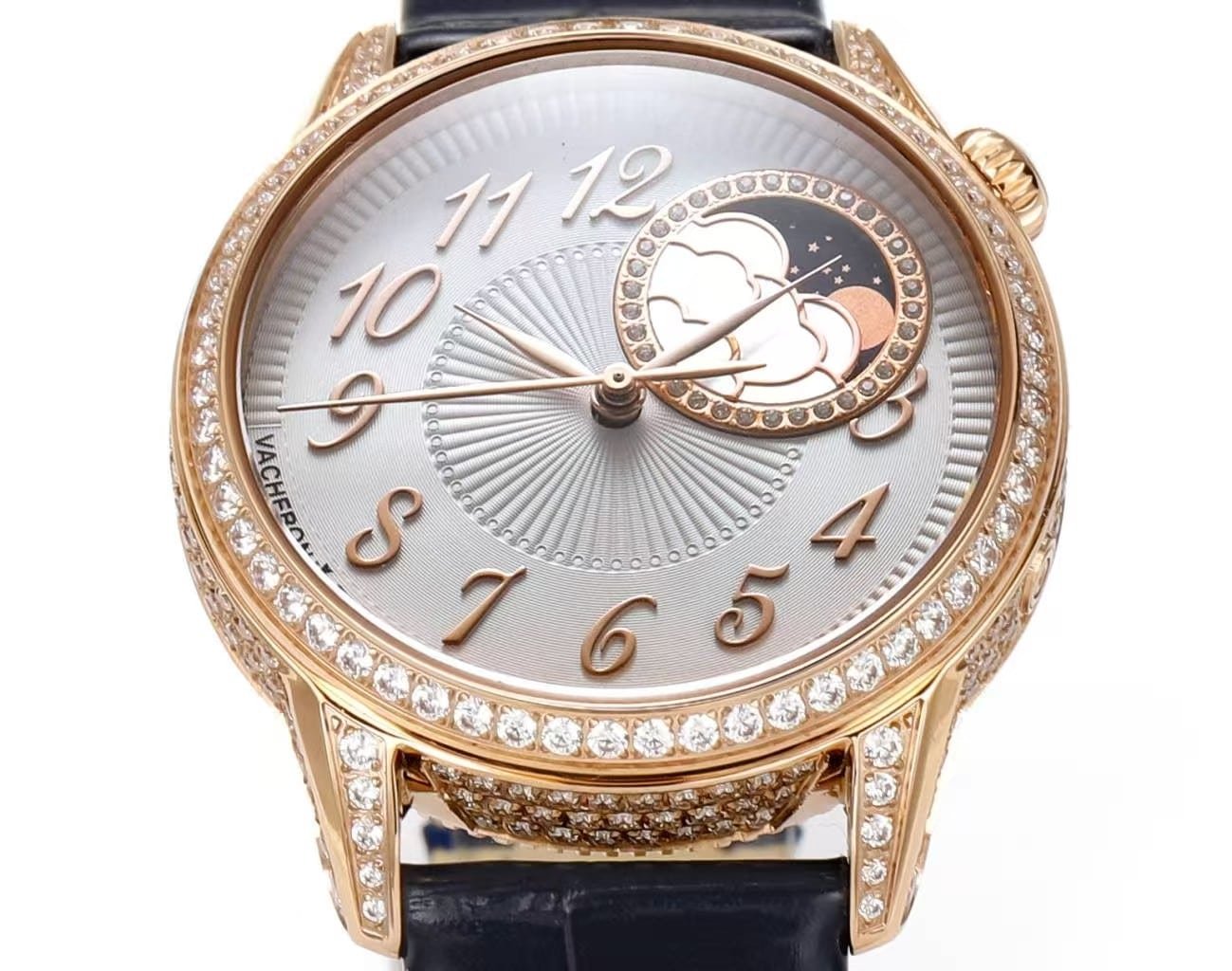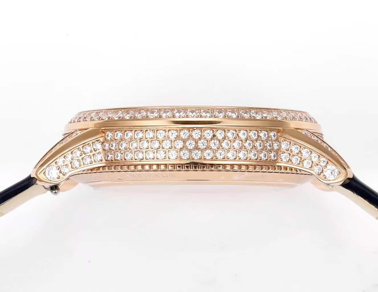 The case architecture emphasizes continuity over sharp definition. Compared with modern Vacheron Constantin lines that favor crisp transitions, this case flows. The lugs taper inward and downward, softened further by diamond settings that blur their outline. The crown sits slightly higher than expected, and its position interrupts wrist movement during casual motion. When the wrist bends, the crown makes itself known sooner than muscle memory predicts. The watch negotiates wrist movement rather than adapting fully to it. The polishing and edge softness suggest guangzhou watchmaking priorities that favor smooth surfaces over aggressive geometry, visible when light slides along the case flank.