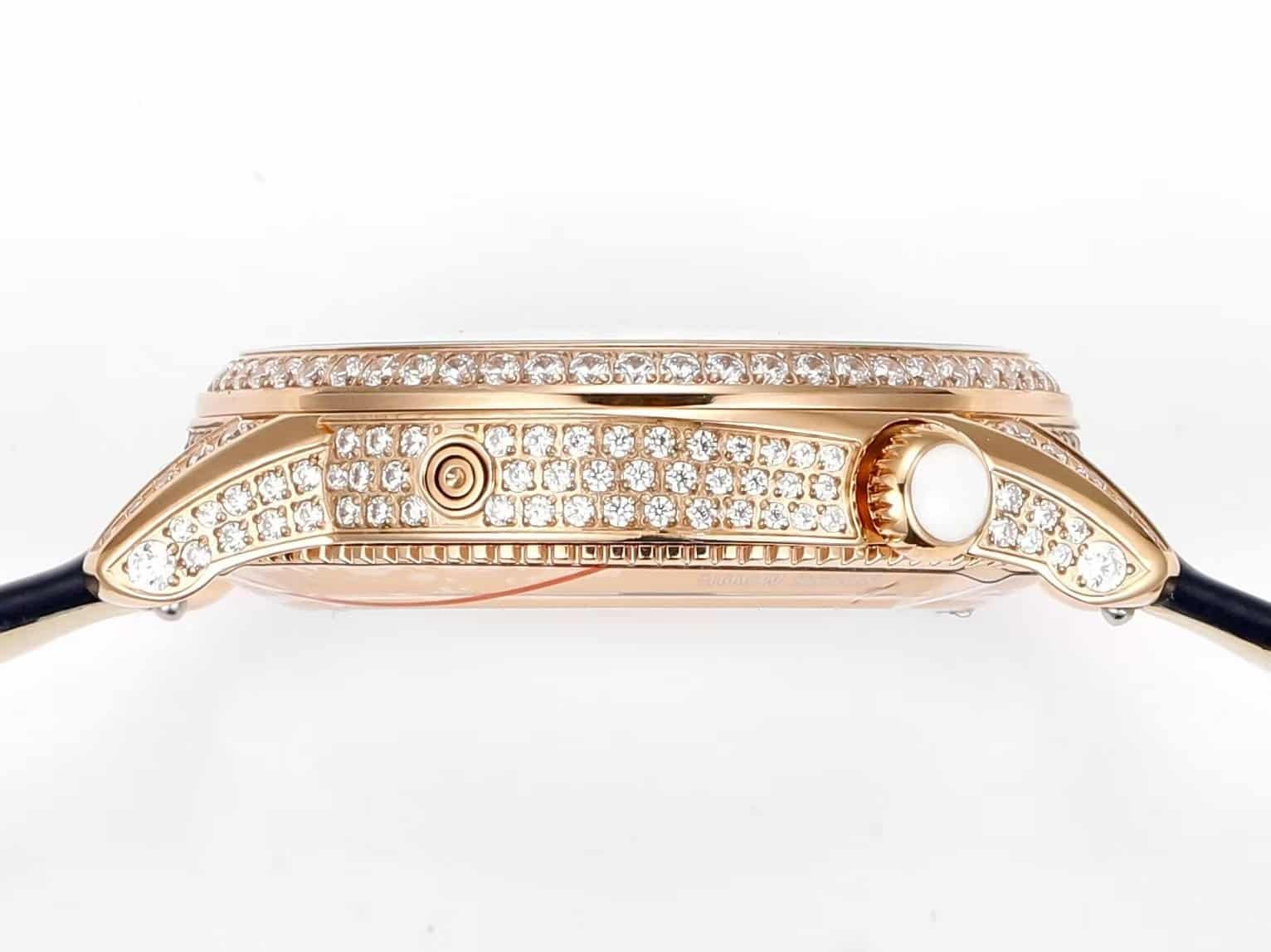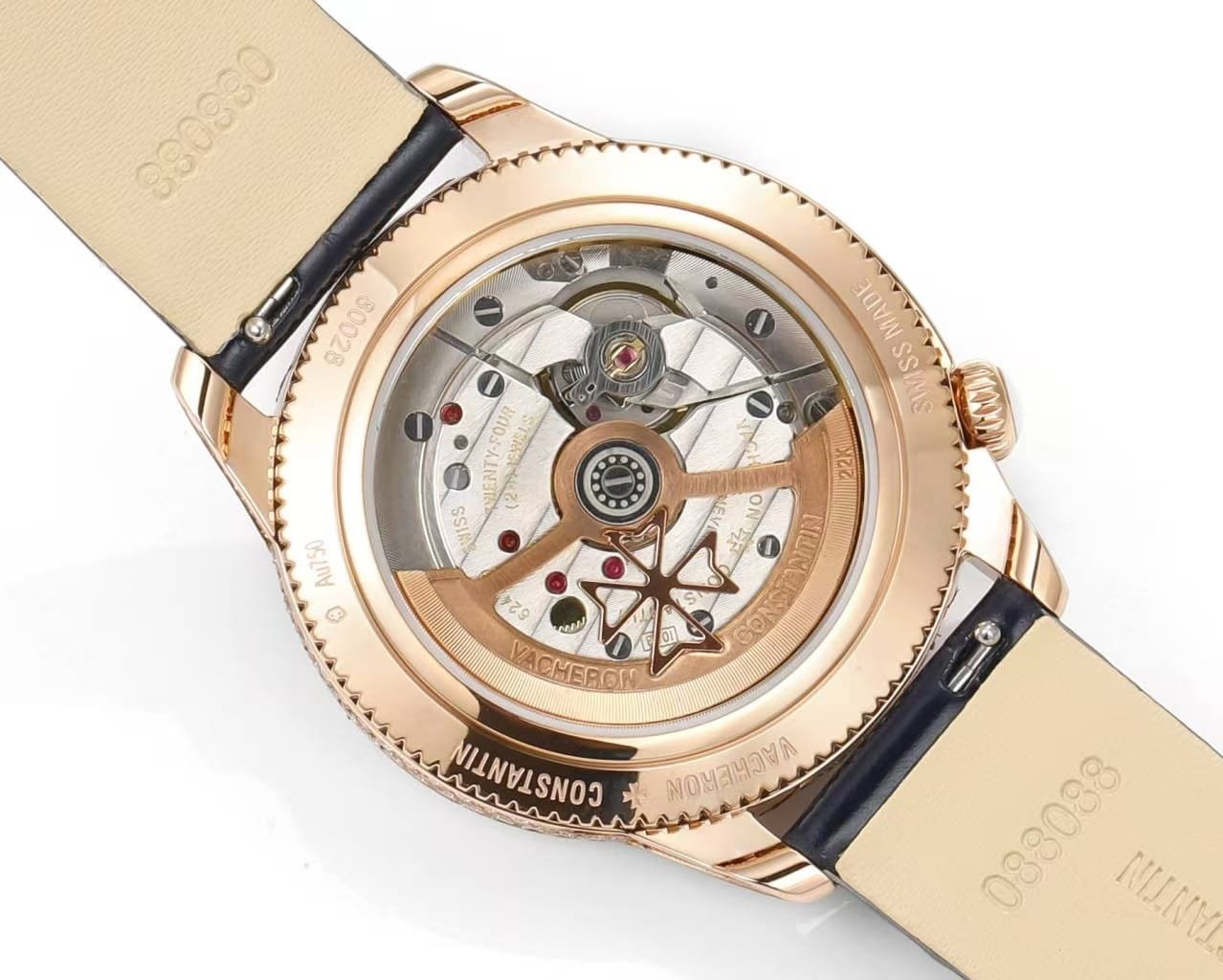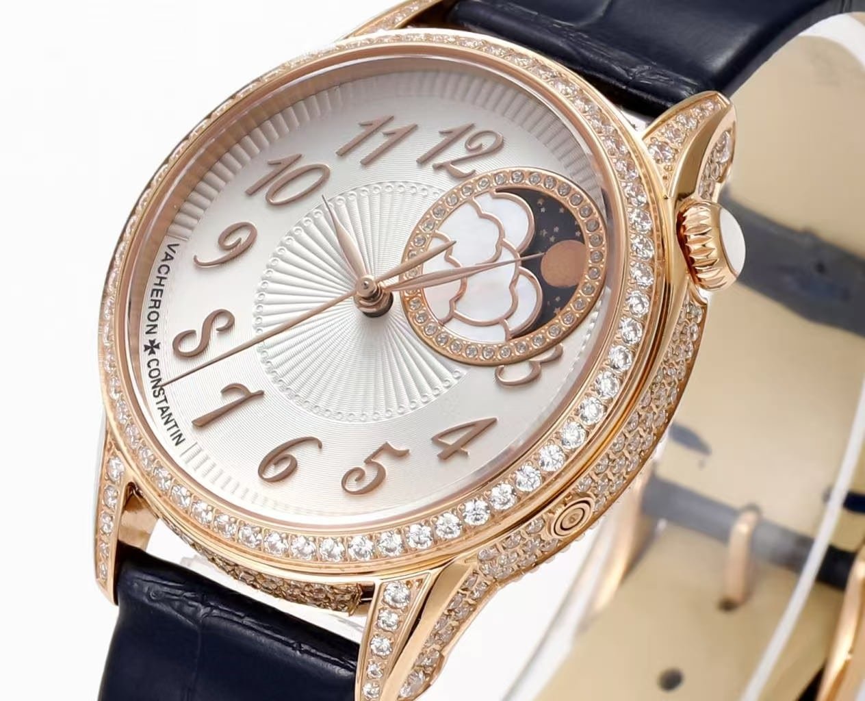The case architecture emphasizes continuity over sharp definition. Compared with modern Vacheron Constantin lines that favor crisp transitions, this case flows. The lugs taper inward and downward, softened further by diamond settings that blur their outline. The crown sits slightly higher than expected, and its position interrupts wrist movement during casual motion. When the wrist bends, the crown makes itself known sooner than muscle memory predicts. The watch negotiates wrist movement rather than adapting fully to it. The polishing and edge softness suggest guangzhou watchmaking priorities that favor smooth surfaces over aggressive geometry, visible when light slides along the case flank.