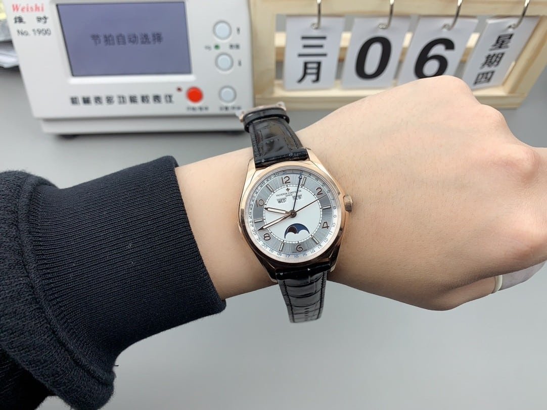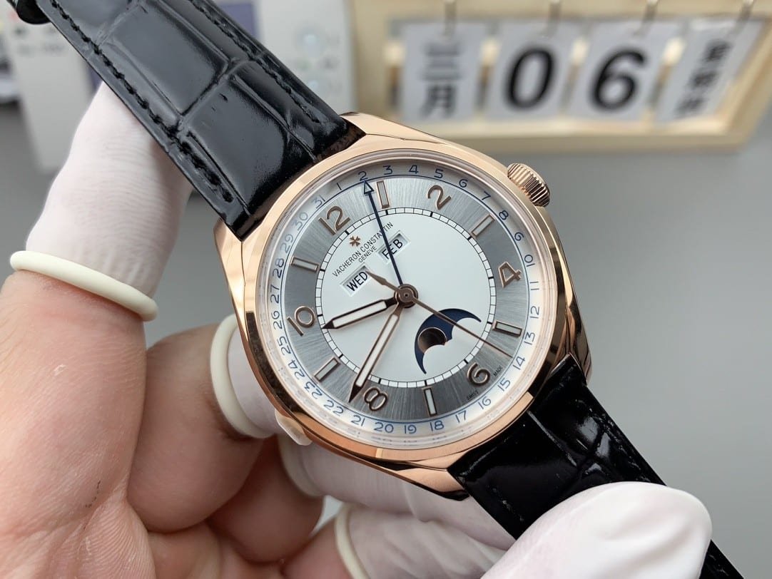 From the image, this watch reads clearly as a Vacheron Constantin Fiftysix complete calendar in pink gold, most naturally aligning with the 4000E/000R-B438 reference. The case measures 40mm in diameter, and the fuller profile is immediately visible on the wrist, giving it more physical presence than the time-only Fiftysix without crossing into heaviness. The silver sector dial contrasts gently with the warm pink gold case, while the black leather strap grounds the watch visually. On the first full day of wear, the bezel’s rounded polish softens reflections, and the watch settles flat during walking rather than tipping forward or shifting laterally.