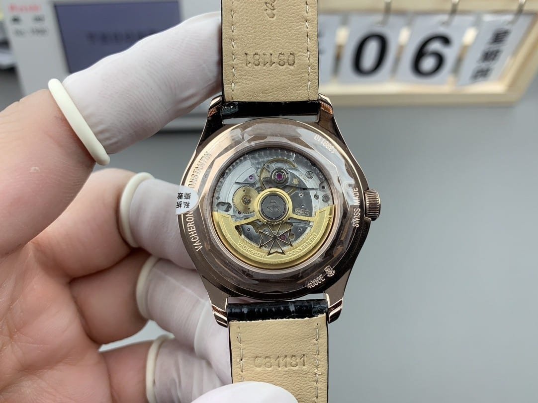 Compared with sharper Vacheron families, the Fiftysix case is deliberately softened. The pink gold bezel rolls light smoothly, and the edges feel forgiving against the wrist. The Maltese cross–inspired lug geometry allows the strap to fall naturally, keeping the watch centered even during movement-heavy activities like walking or carrying items.