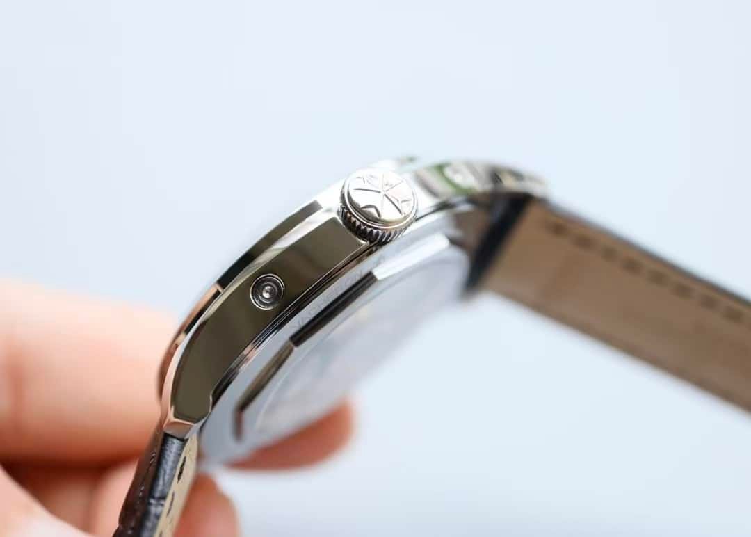 The case architecture explains much of why this Fiftysix wears comfortably despite its complication. Compared with more formal Vacheron Constantin families, the edges are softened and transitions between polished surfaces are rolled rather than crisp. On the wrist, the case warms quickly and remains stable during movement-heavy moments like carrying items or typing. The lugs articulate gently, preventing the watch from feeling top-heavy. Subtle cues associated with guangzhou watchmaking appear in the softened edge treatment, favoring comfort and visual flow over strict sharpness.