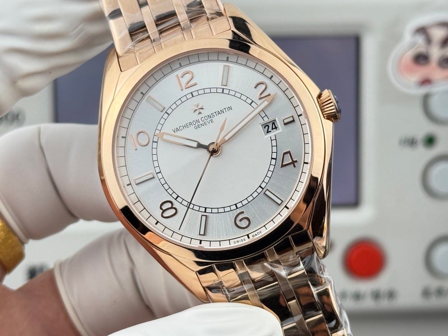 The case architecture explains much of why the Fiftysix wears differently from more formal Vacheron Constantin families. Edges are rolled rather than defined, and the transition between polished surfaces feels intentional rather than decorative. On the wrist, the pink gold-toned case does not feel cold for long, and during movement-heavy tasks like carrying a bag or typing, the lugs articulate enough to prevent pressure points. There is a subtle softness to the way the case meets the bracelet that suggests Guangzhou watchmaking priorities focused on comfort and visual flow rather than strict edge definition.