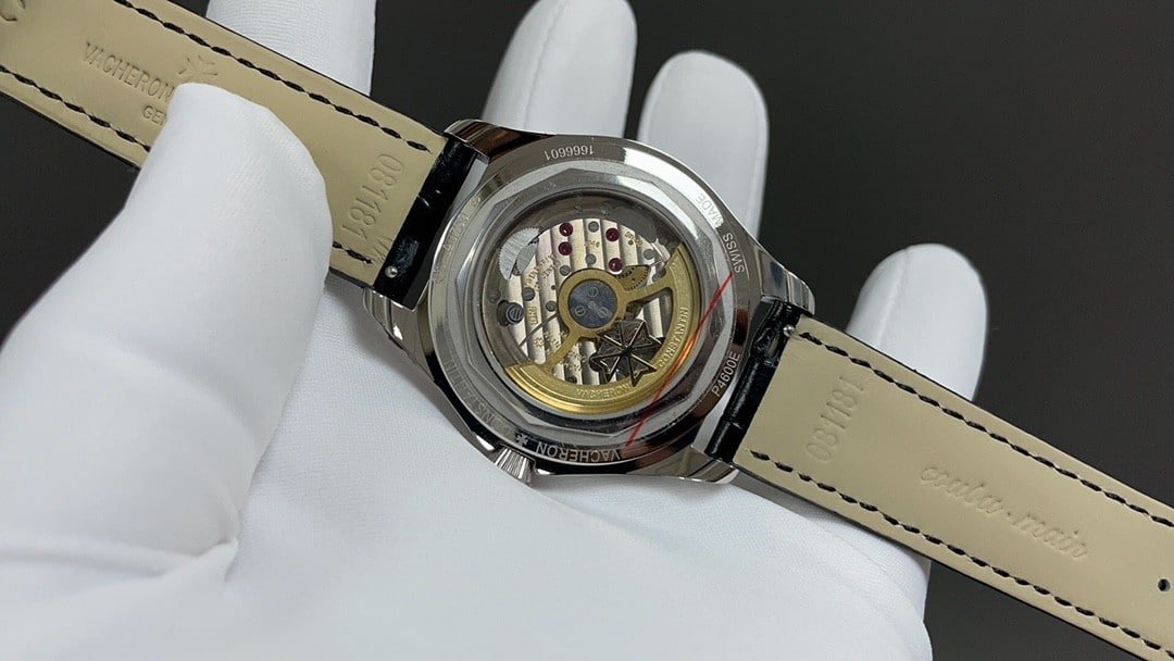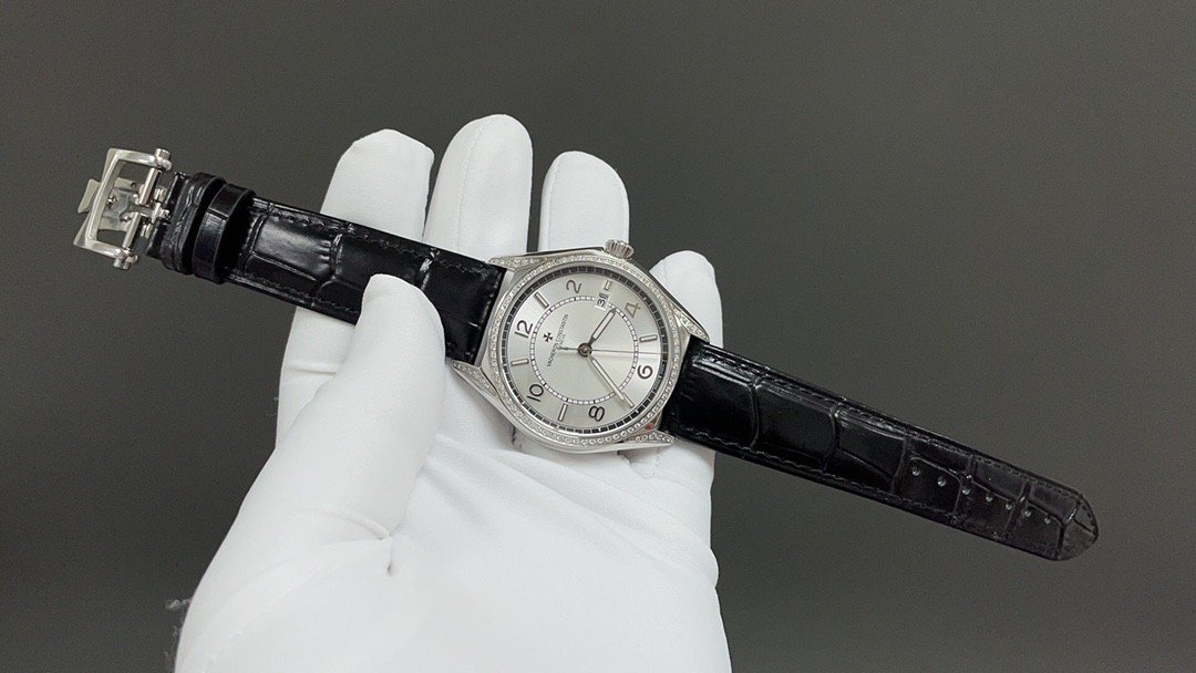 Compared with sharper Vacheron families, the Fiftysix case feels intentionally rounded. The diamond-set bezel follows that softness, with stones seated low enough to avoid catching on fabric. The Maltese cross-inspired lugs articulate naturally, allowing the strap to fall without forcing the case upward. During walking or carrying a bag, the watch stays centered, and while typing it rests comfortably without edge pressure.