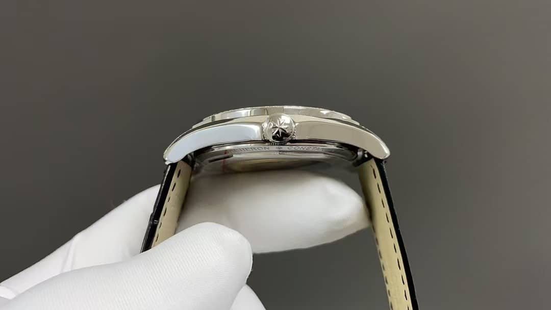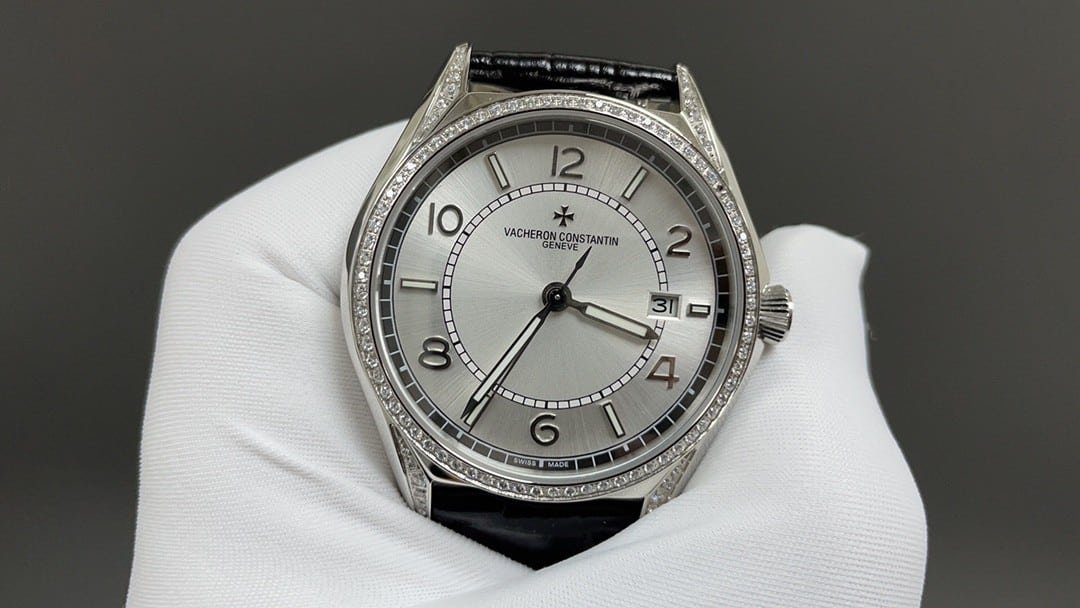 The watch shown here presents itself as a Vacheron Constantin Fiftysix time-only configuration in steel, visually closest to the 4600E family, with cues aligning most naturally with the 4600E/000A-B402 diamond-set execution. At roughly 40mm across and just under ten millimeters tall on the wrist, it arrives on a black leather strap and carries a silver sector dial with applied Arabic numerals and a framed date at three. On the first day of wear, the sensation is not one of spectacle but of balance. The diamond-set bezel softens reflections rather than amplifying them, diffusing light into a fine halo that never pulls focus away from the dial itself. The numerals settle the eye immediately, especially during quick glances while walking, and the case stays level rather than rocking as the wrist moves.