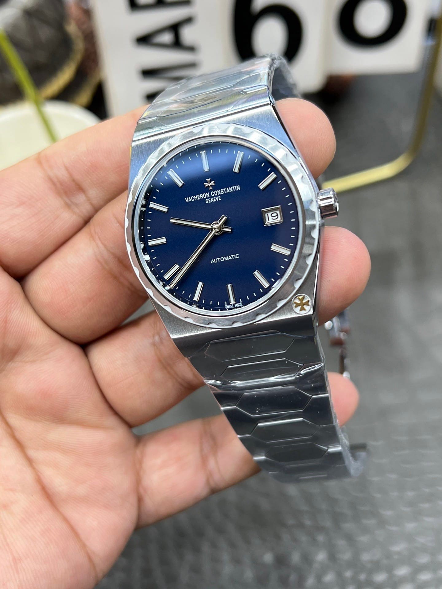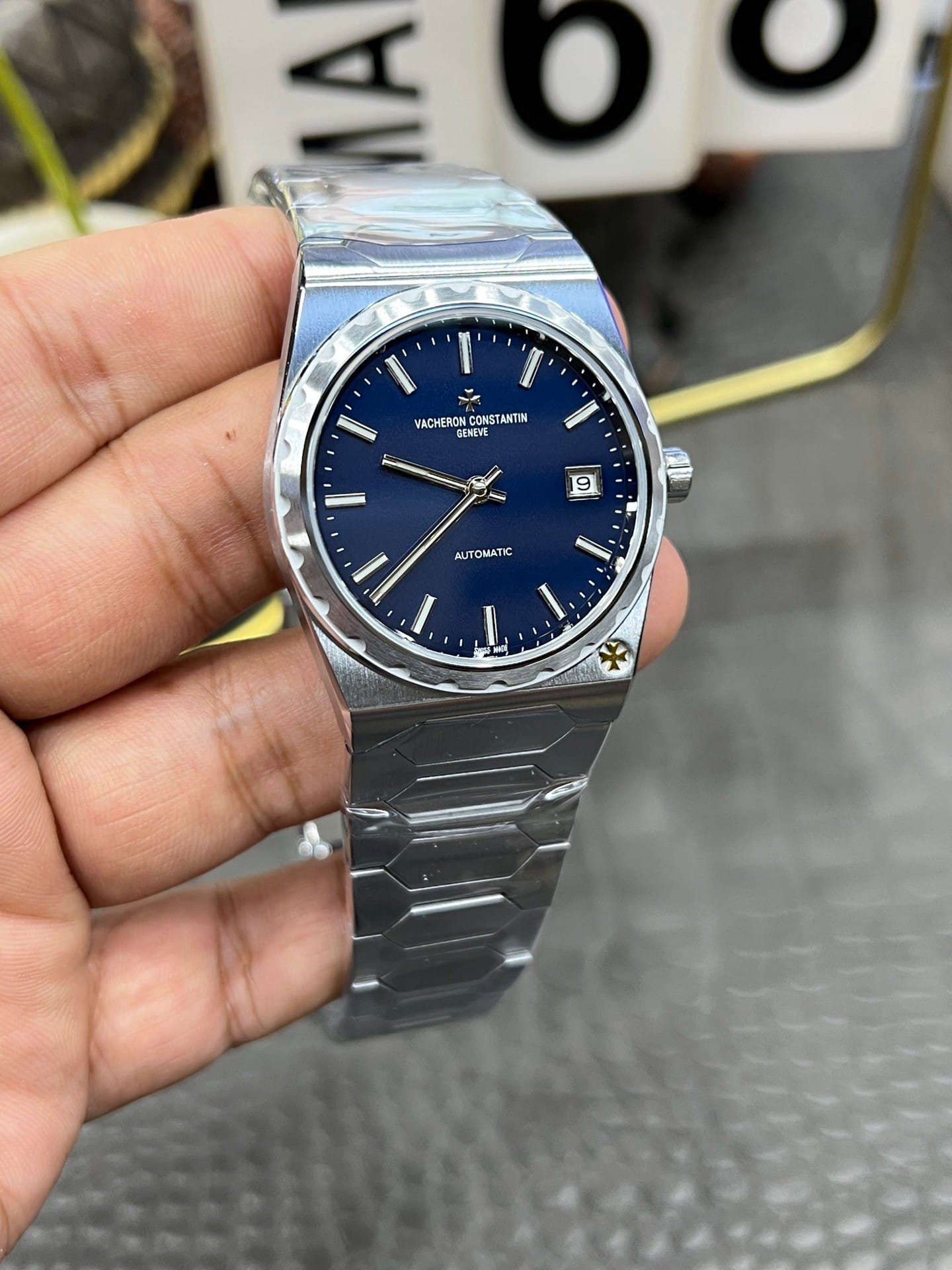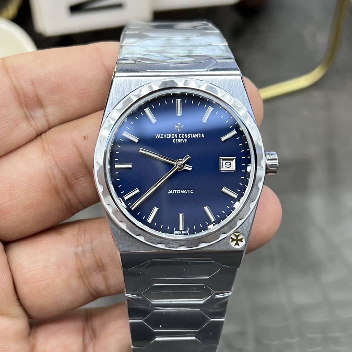 I recognize this watch immediately as a Historiques 222 steel configuration, visually consistent with the 37mm proportion that defines the model’s balance. The case is slim, close to 8mm thick, fully integrated with a steel bracelet that continues the geometry without interruption. The dial is a deep blue, subtly sunbrushed, with applied baton markers and a small date window at three. The Maltese cross sits low on the case flank near five, visible only when the wrist turns. I wore it through a full, ordinary day without resizing or adjustment, allowing the watch to establish its own rhythm on the wrist.