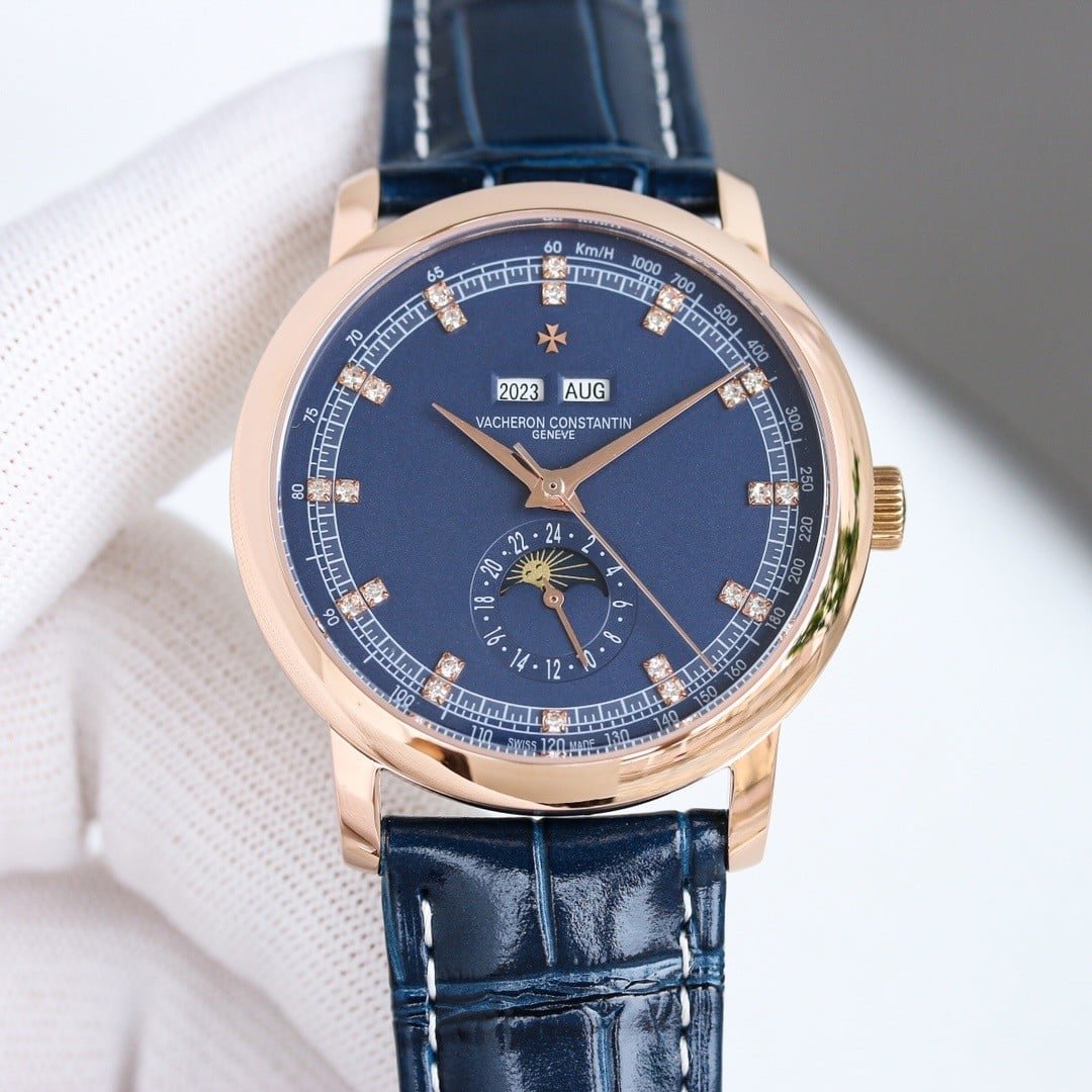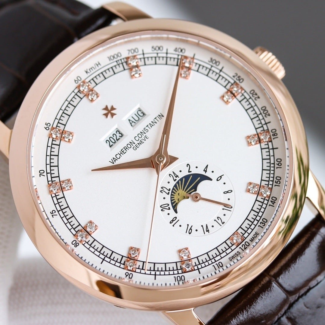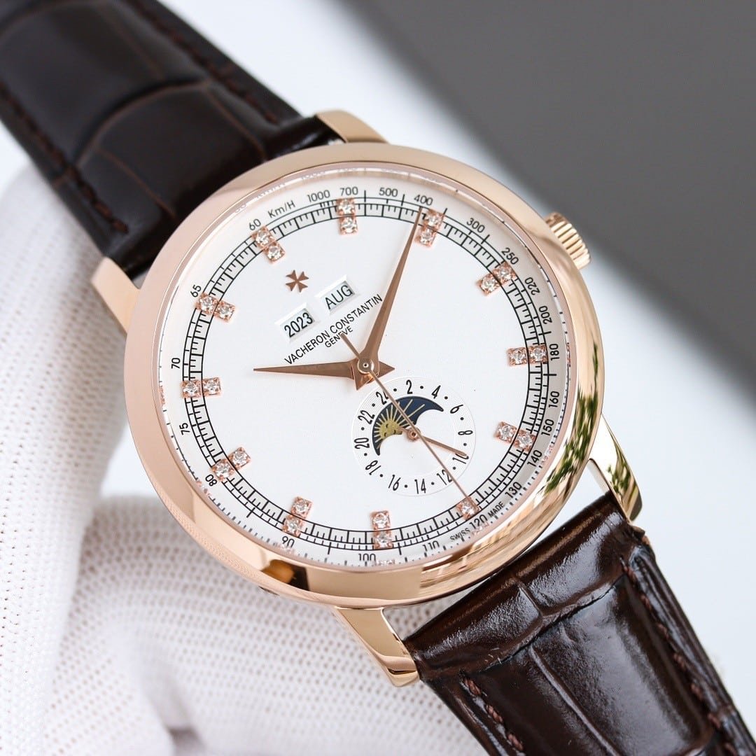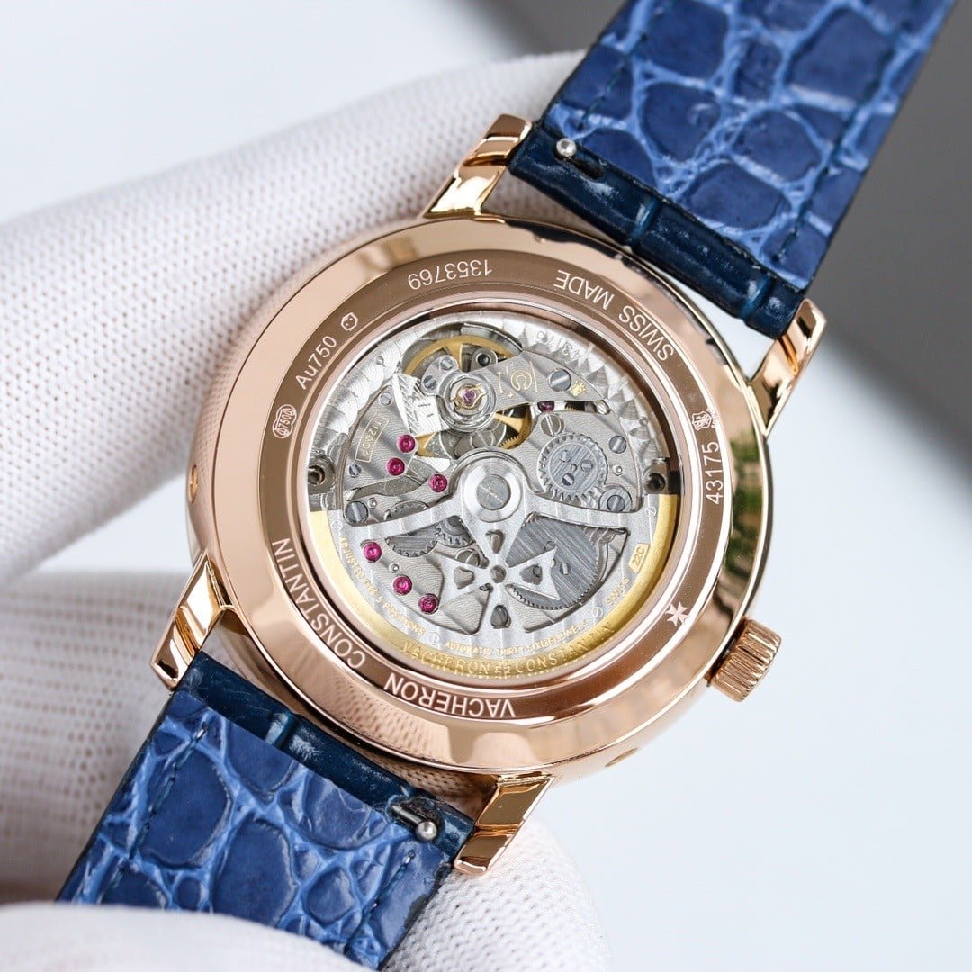 The case architecture negotiates presence rather than minimizing it. The bezel is smooth and polished, reflecting light softly without sharp flashes, while the mid-case maintains a consistent, rounded profile. Lug length is moderate, with a gentle downward curve that allows the strap to absorb most wrist movement. Compared with modern Vacheron Constantin lines, this case does not melt into the wrist. It maintains its shape, shifting subtly with motion rather than conforming completely. Subtle traces of guangzhou watchmaking appear in the finishing, where edges are smooth and transitions slightly softened to favor comfort over sharp definition.